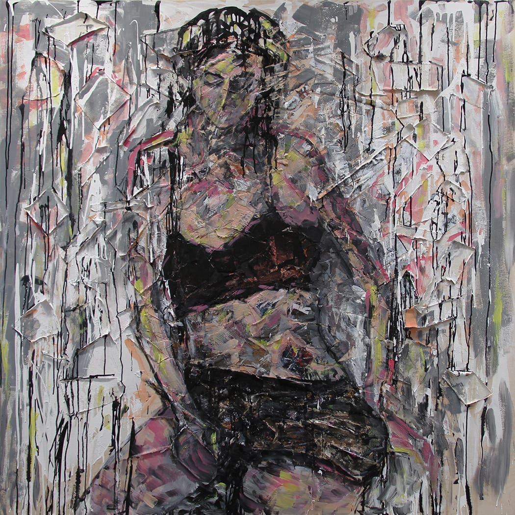 Mashian’s use of mixed media adds depth and emotion, with embedded shards of material evoking the sensation of a self both breaking apart and reconstructing. The restrained color palette—cool grays, blacks, and whites—establishes an industrial, almost urban atmosphere, while streaks of pink and yellow introduce moments of warmth. The obscured face and chaotic background of intersecting lines reinforce the idea that identity is shaped both within and against external pressures. This contemporary work is an evocative reflection on one’s self image, making it a compelling choice for collectors drawn to thought-provoking, emotionally charged art.