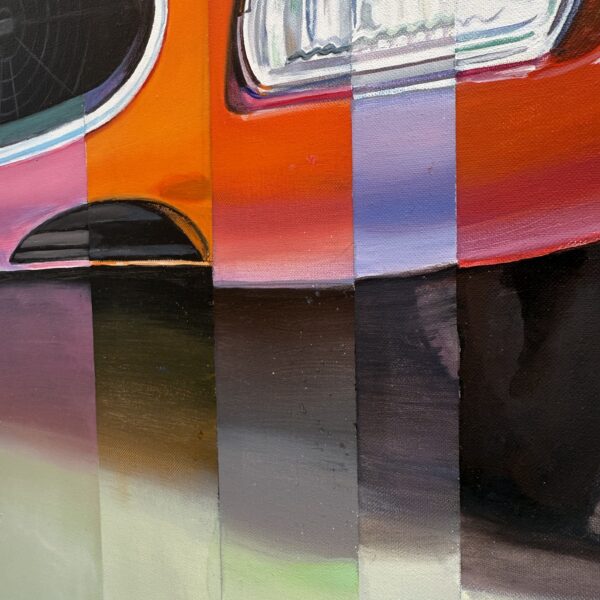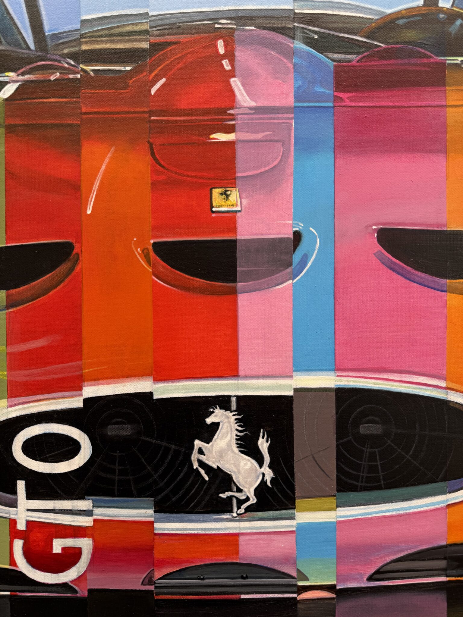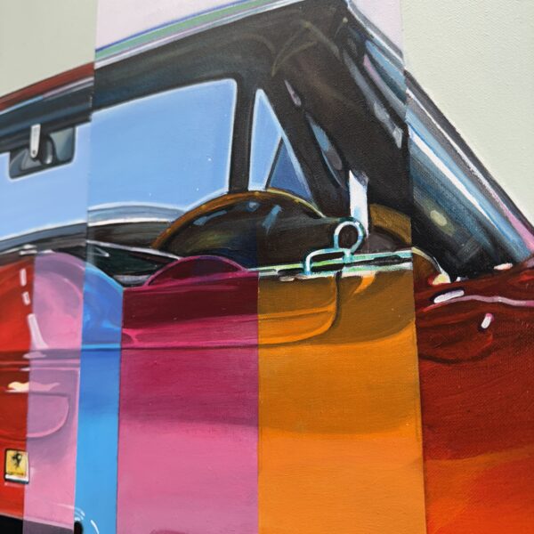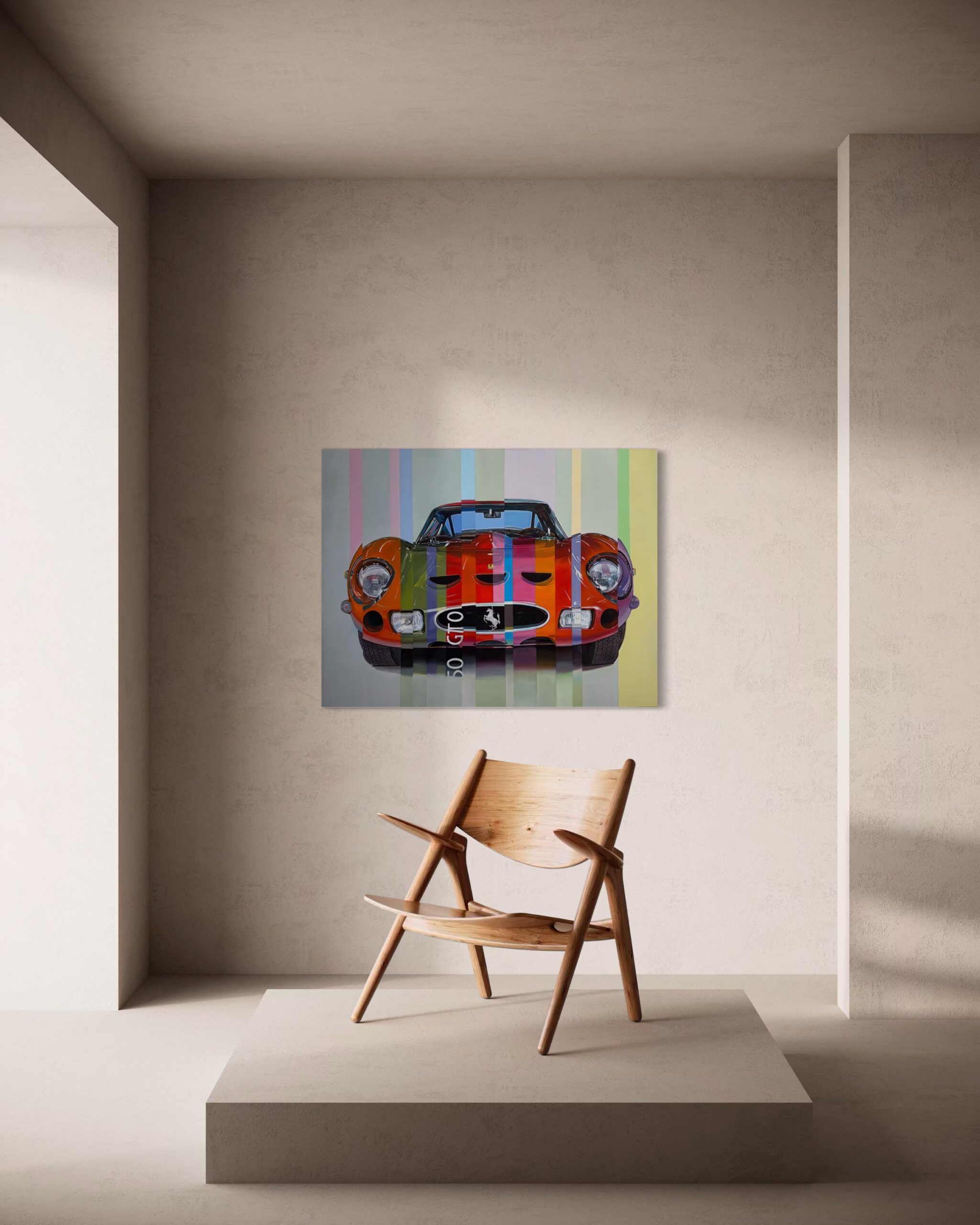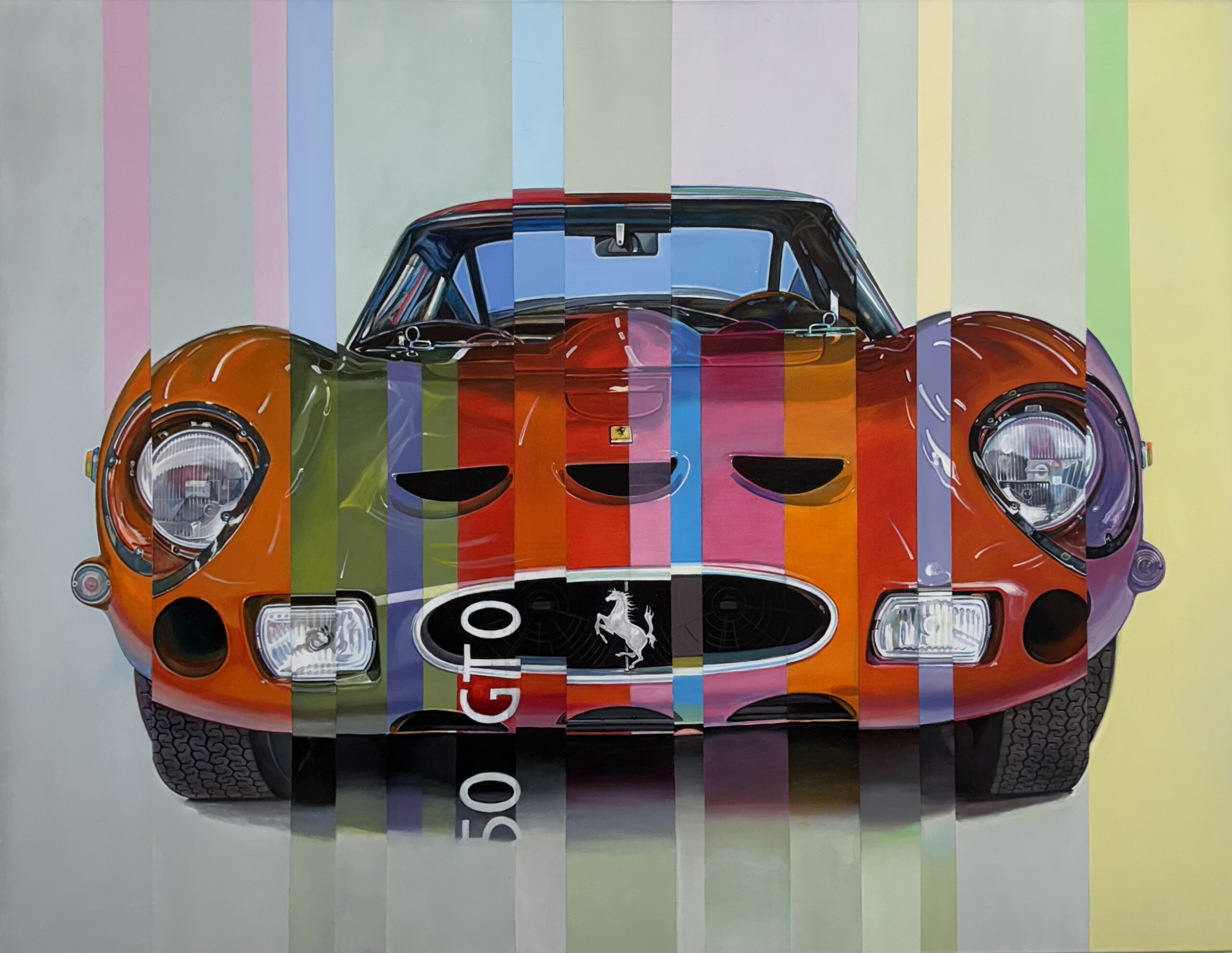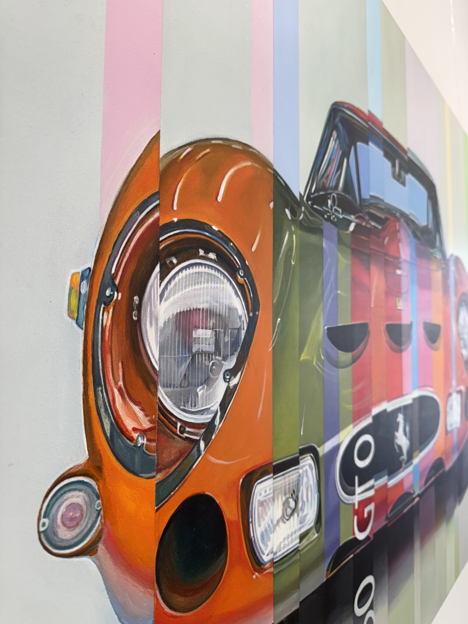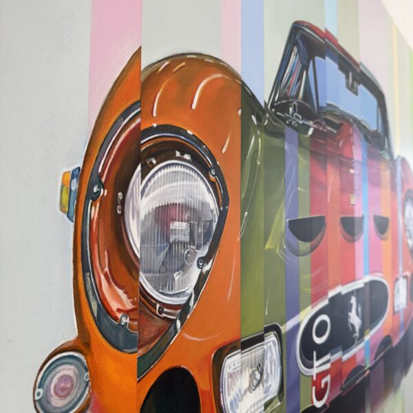 “Ferrari 250 GTO” by Marcello Petisci reimagines one of the most legendary sports cars in automotive history through a playful and contemporary lens. The classic Ferrari 250 GTO is colorfully deconstructed into vertical stripes of pink, green, blue, orange, and purple, transforming its sleek, high-performance silhouette into a work of modern art.