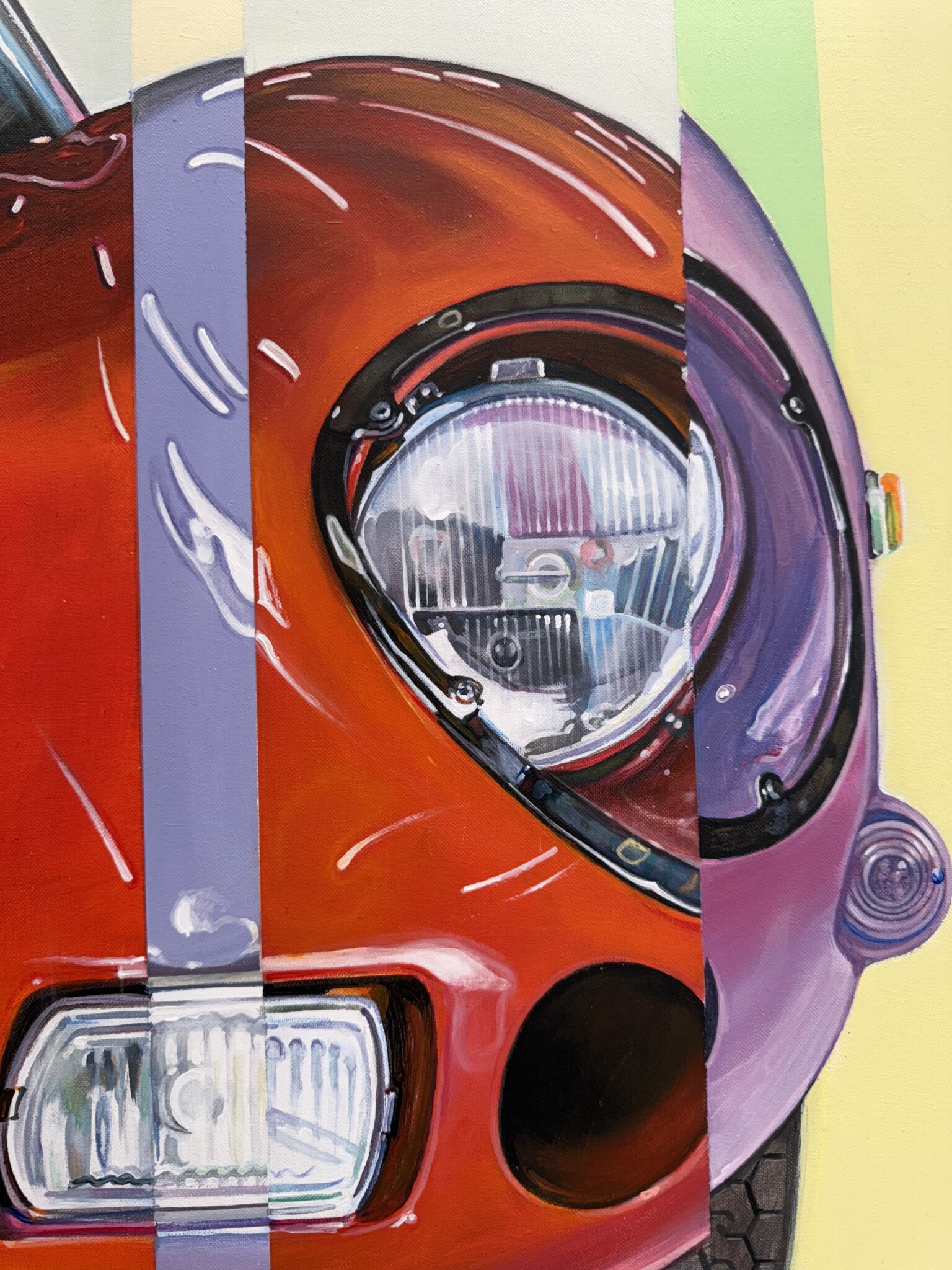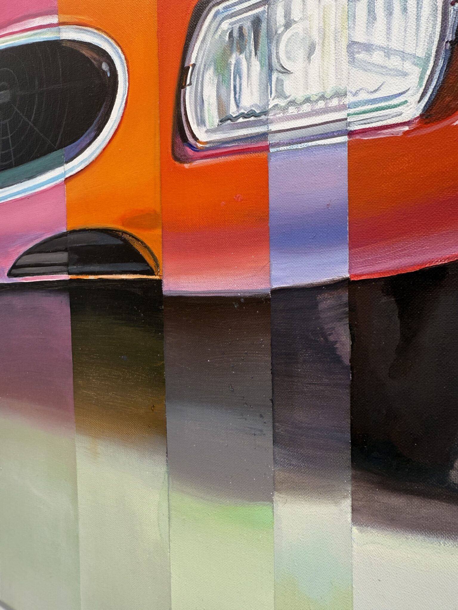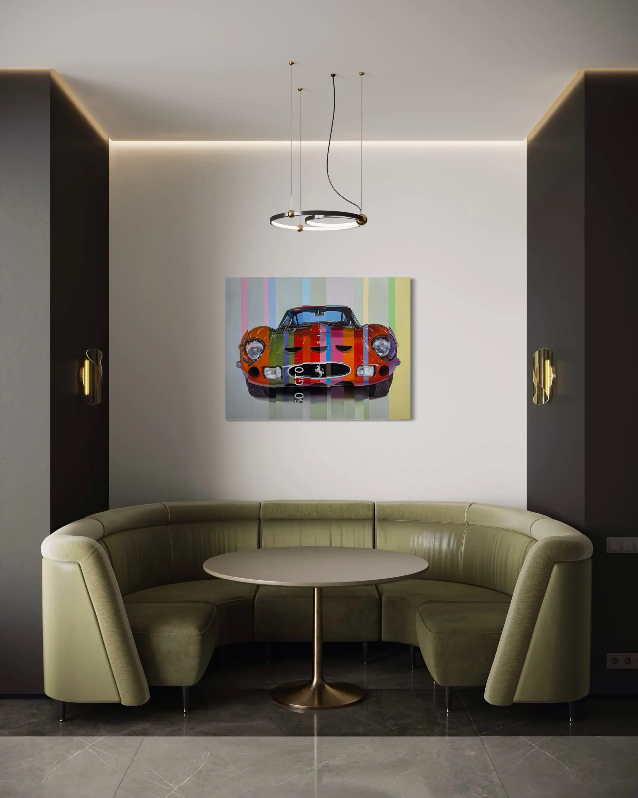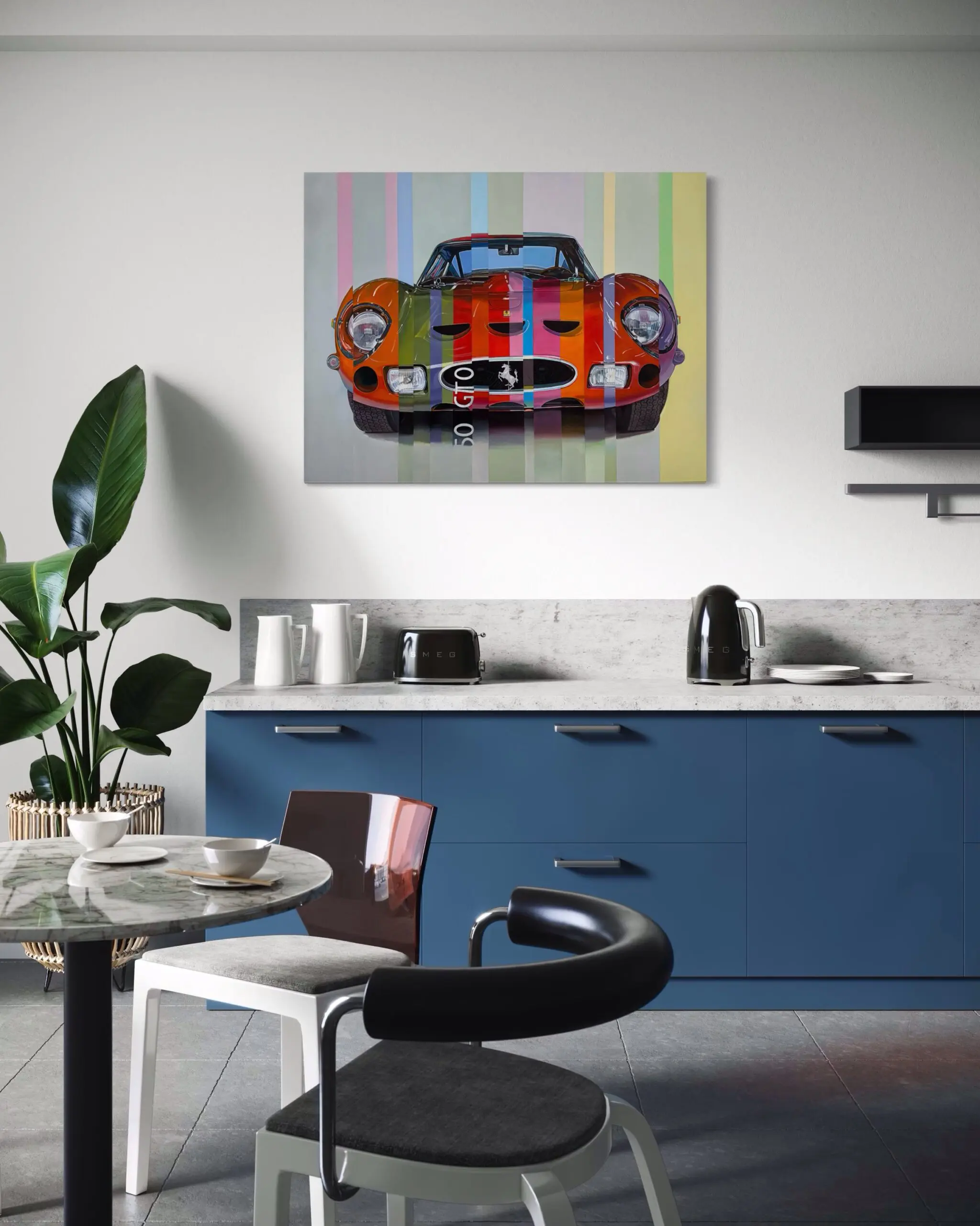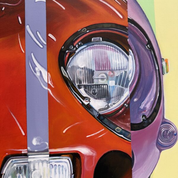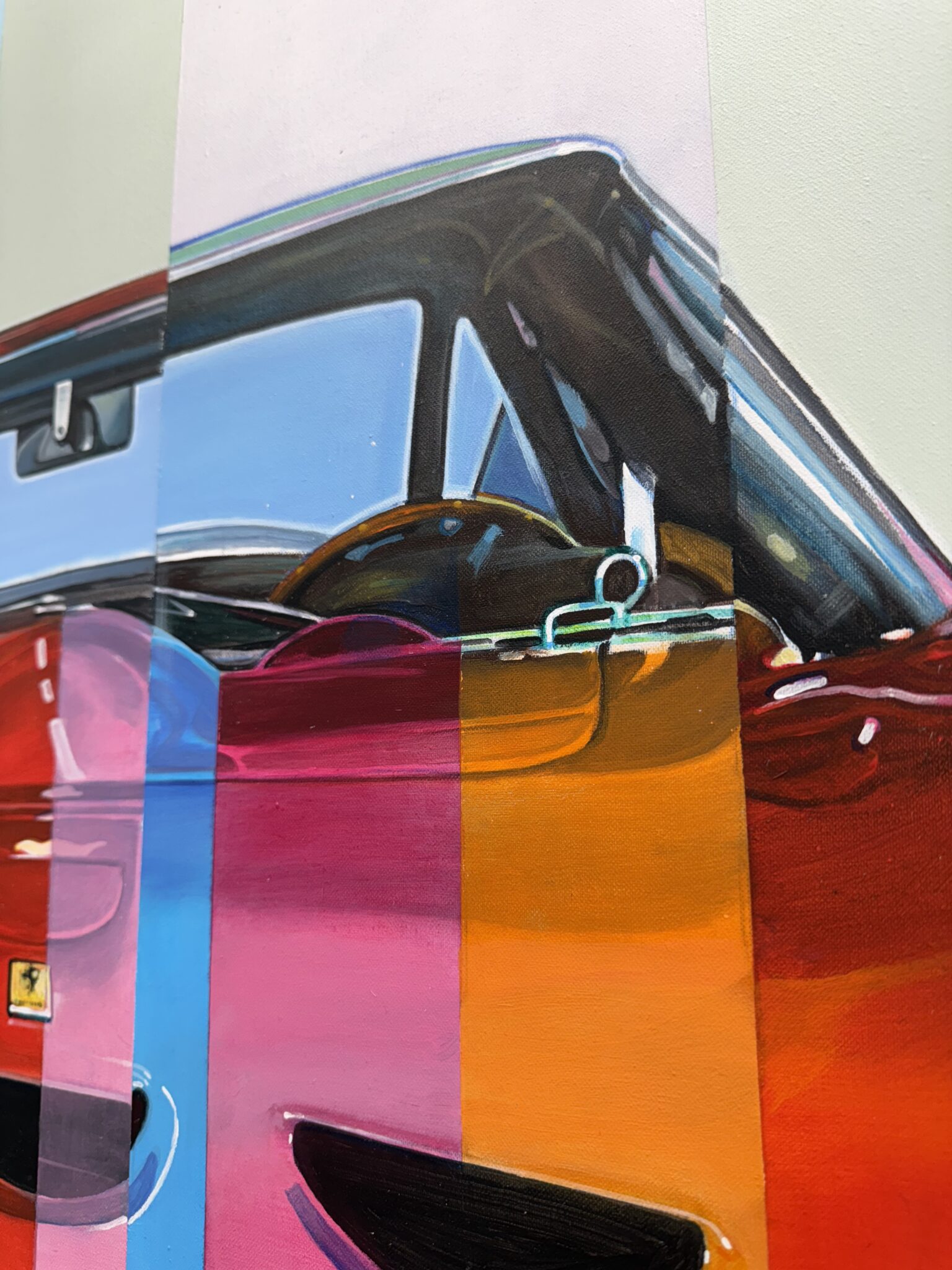 “Ferrari 250 GTO” by Marcello Petisci reimagines one of the most legendary sports cars in automotive history through a playful and contemporary lens. The classic Ferrari 250 GTO is colorfully deconstructed into vertical stripes of pink, green, blue, orange, and purple, transforming its sleek, high-performance silhouette into a work of modern art.