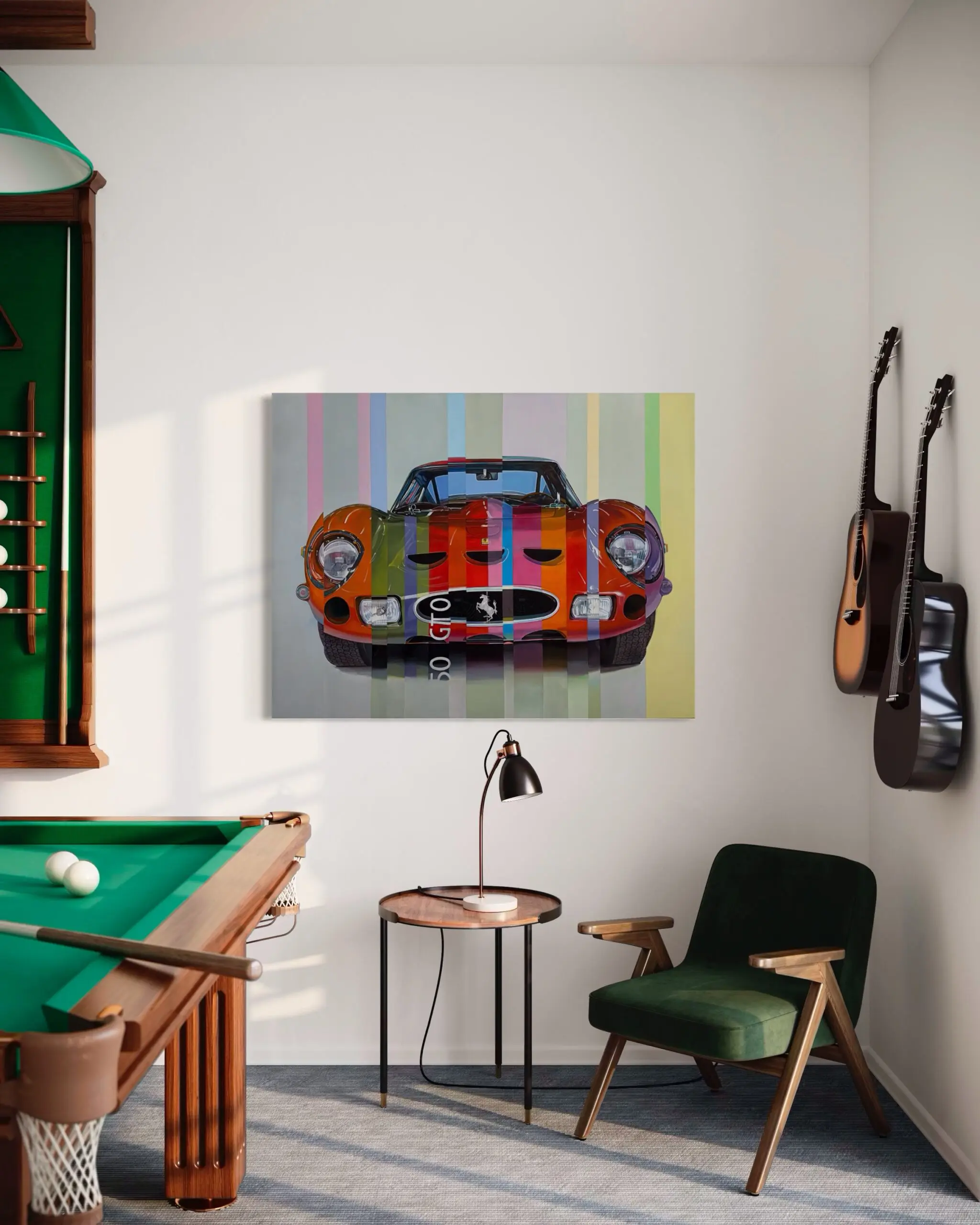 This bold reinterpretation trades the traditional red for a vibrant palette. The use of evenly spaced stripes adds rhythm and structure, while the unconventional color choices give the Ferrari a whimsical, almost pop art quality. It’s a celebration of both the car’s timeless design and the freedom of artistic expression.