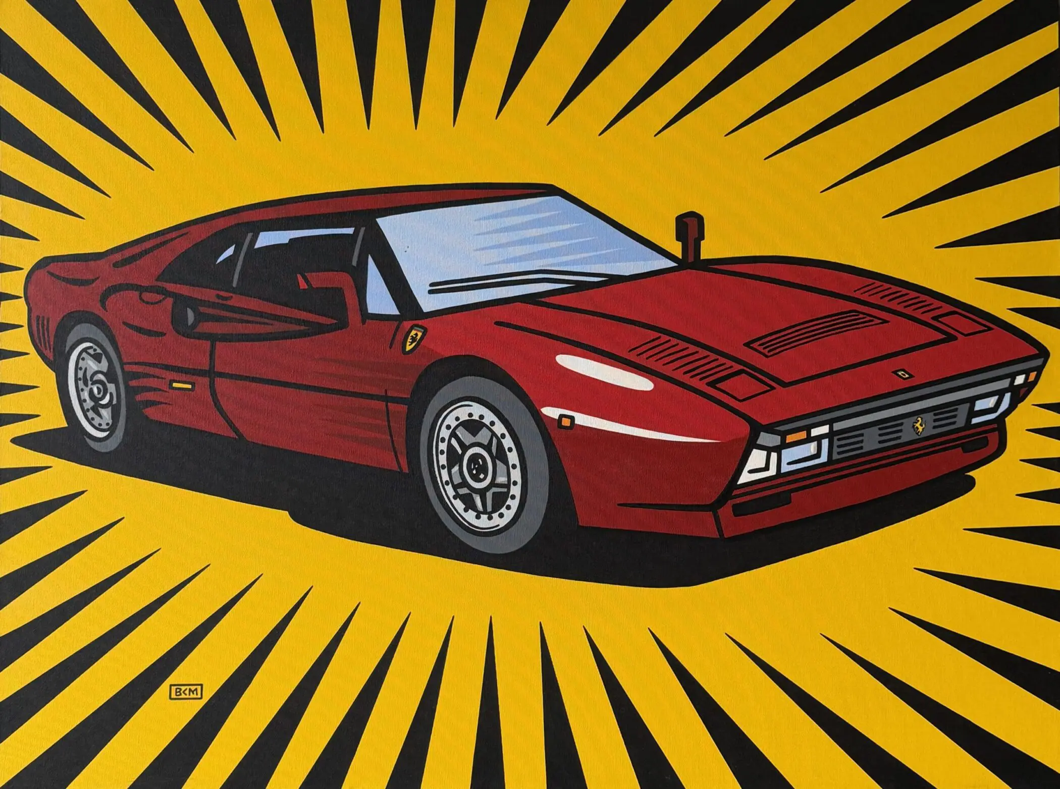 In this vivid portrayal of the Ferrari 288 GTO, Burton Morris applies his signature Pop Art language to a machine already steeped in mythology. Using flat planes of bold red and black outlined in heavy contours, Morris strips the supercar down to its most iconic elements, reassembling it as a graphic symbol of speed and seduction. The radiant yellow burst emanating from behind the vehicle is unmistakably Morris—his comic-inspired starburst motif becoming a visual metaphor for the car’s explosive cultural impact.