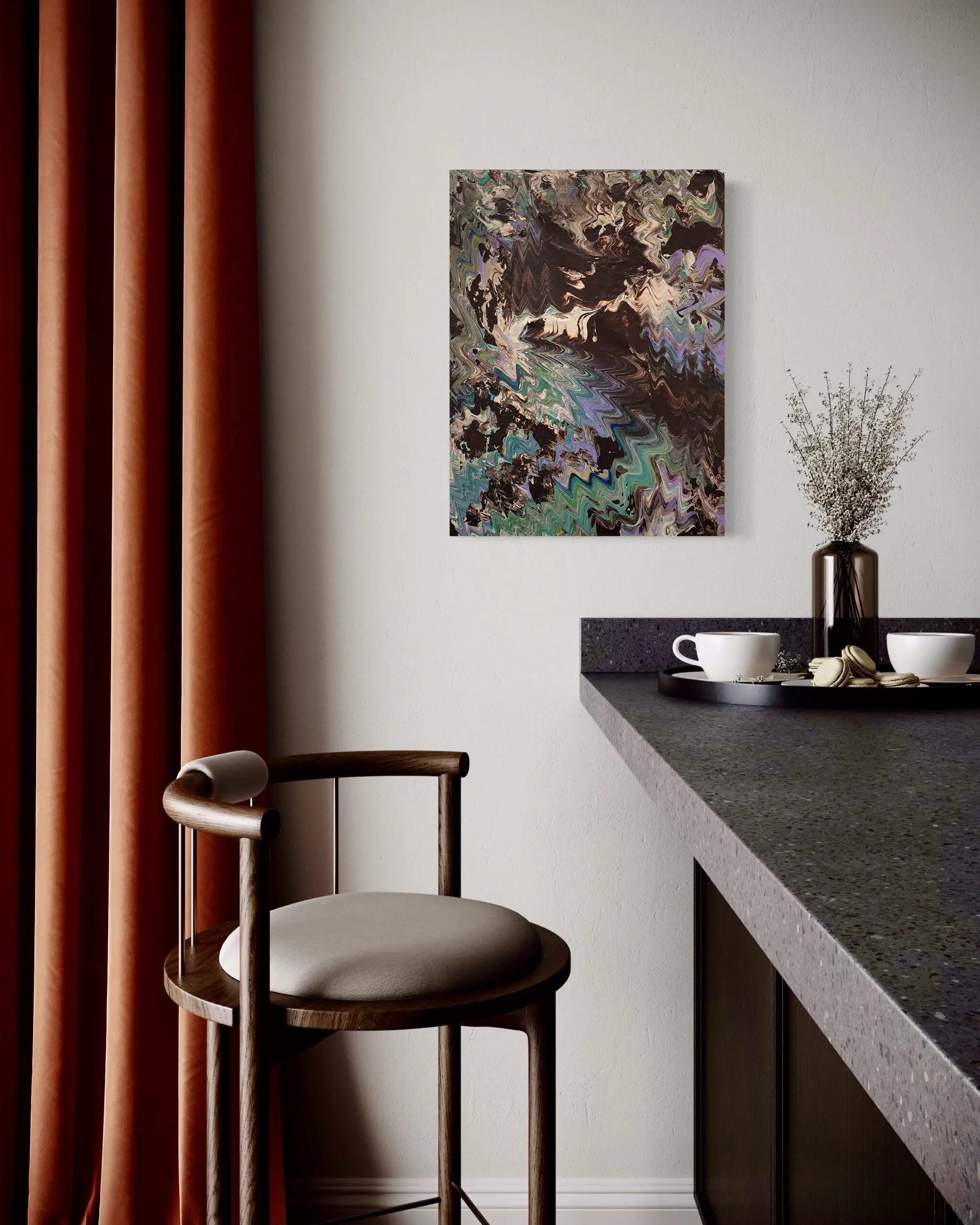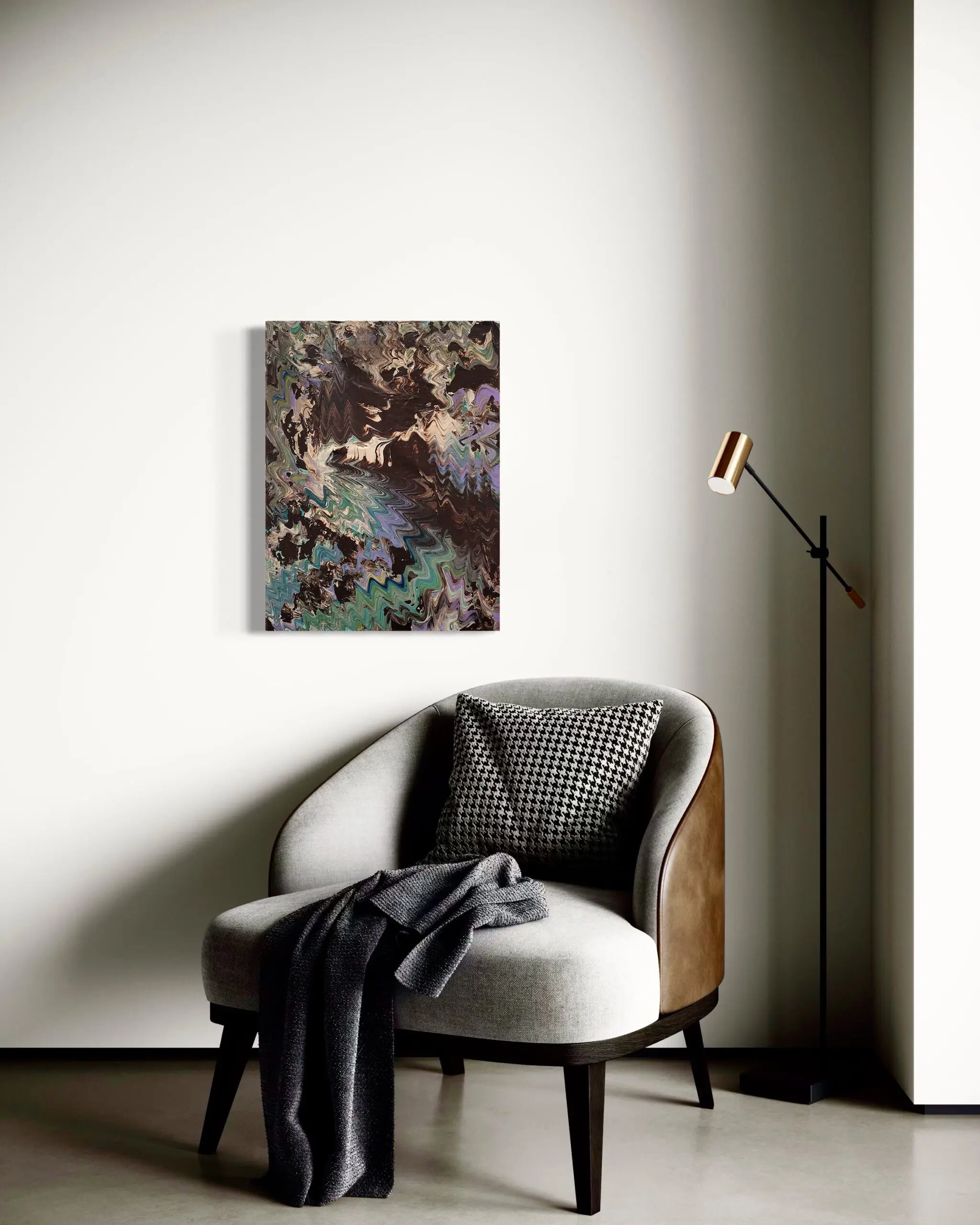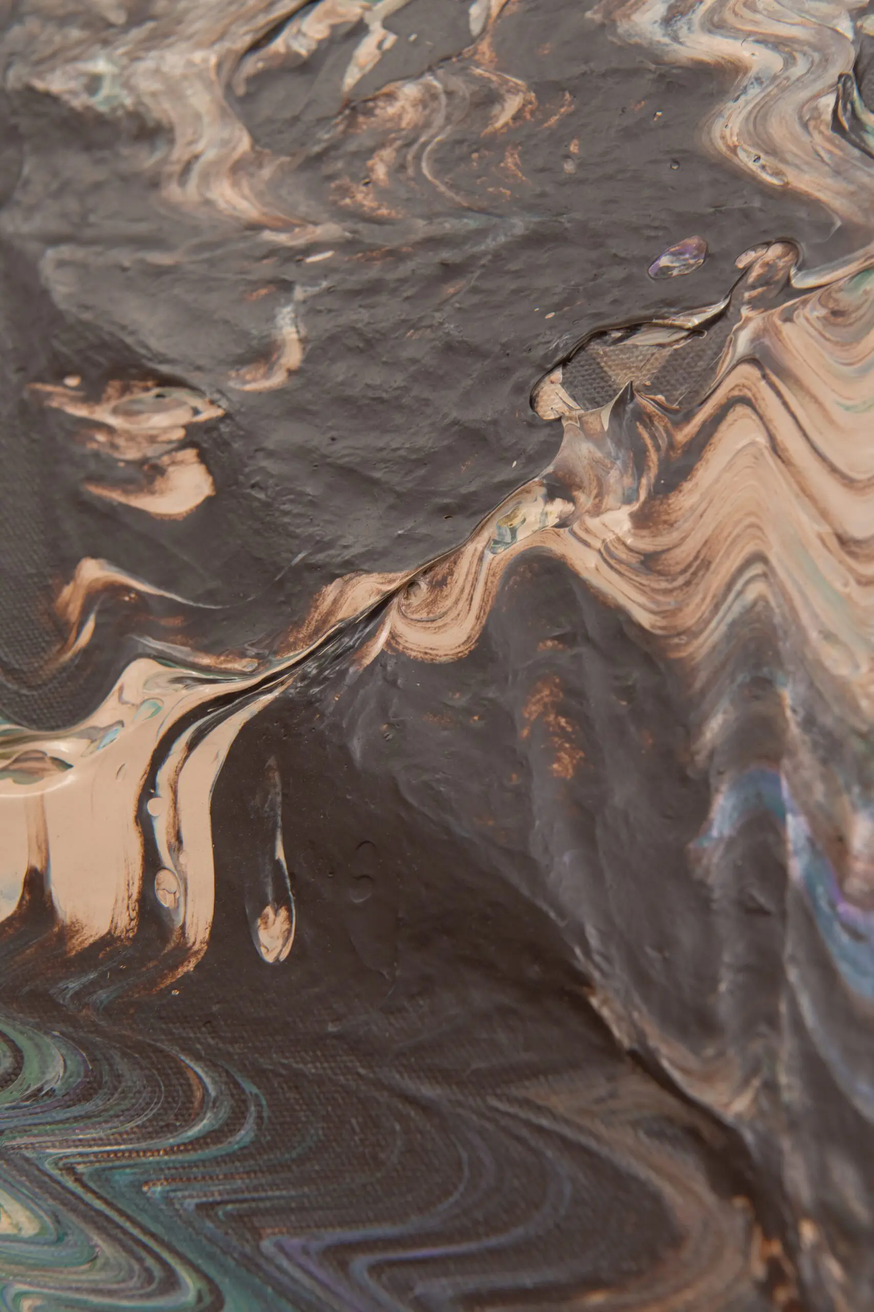 A clear diagonal division, established by fluid, undulating brushstrokes traverses the canvas. The upper section is dominated by rich mocha hues, which gradually soften and blend into the cooler tones below. The artist introduces a subtle but effective use of blues, greens, and purples, which contrast with the warmth of the mocha and cream. This contrast creates a dynamic tension between the warm and cool elements, adding depth and a sense of movement to the composition. The careful modulation of color and tone invites a sense of both fluidity and balance, drawing attention to the delicate interplay between opposing forces.