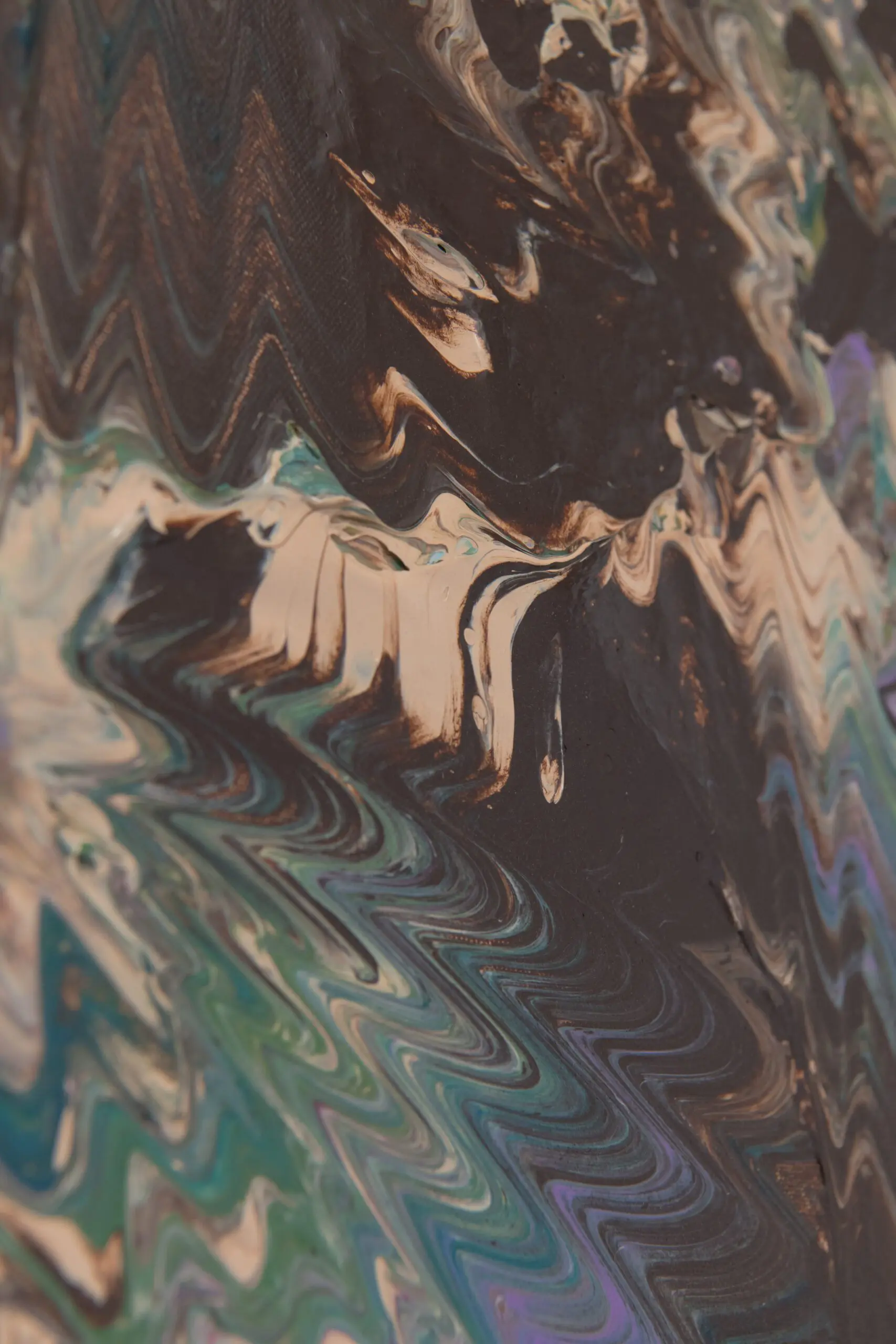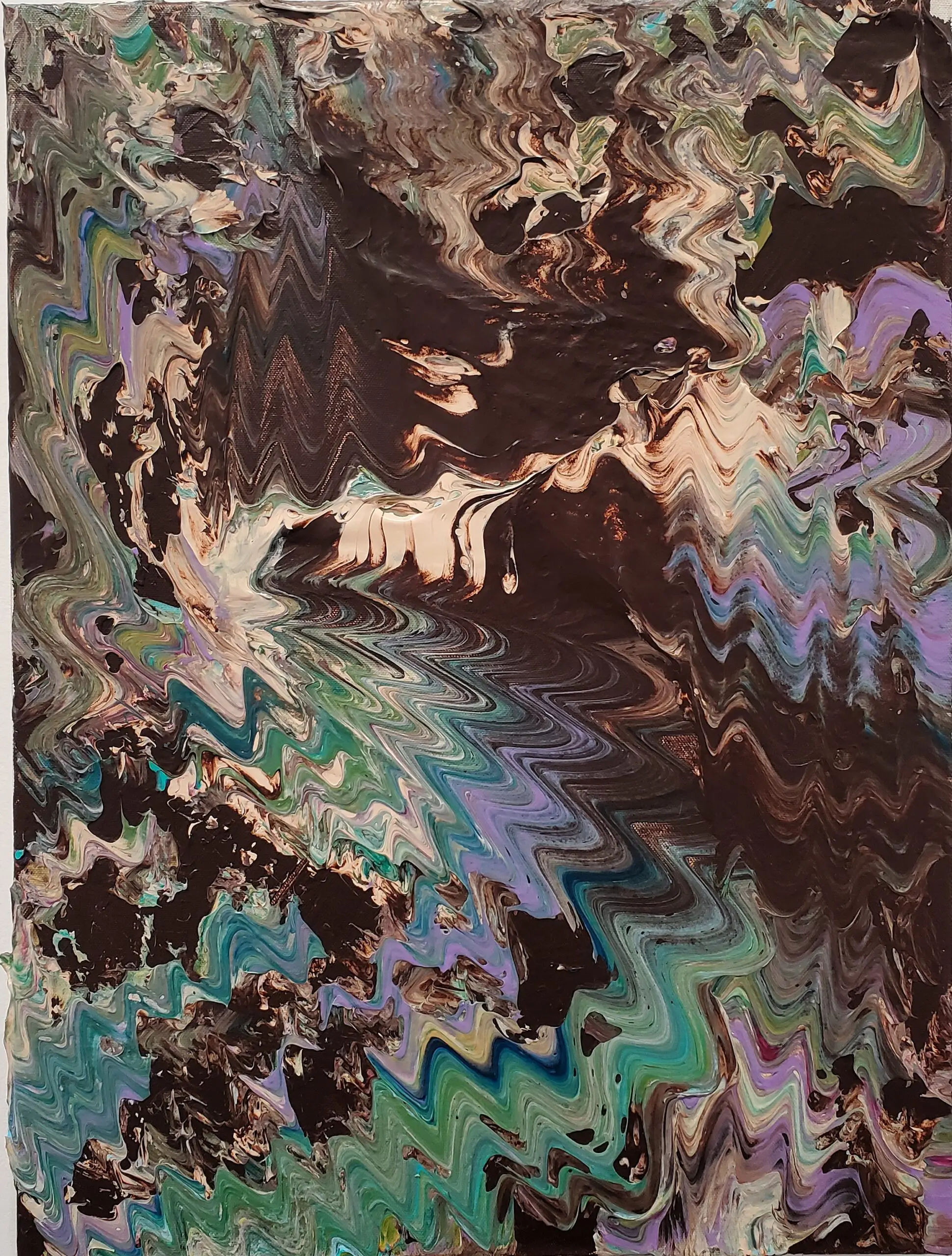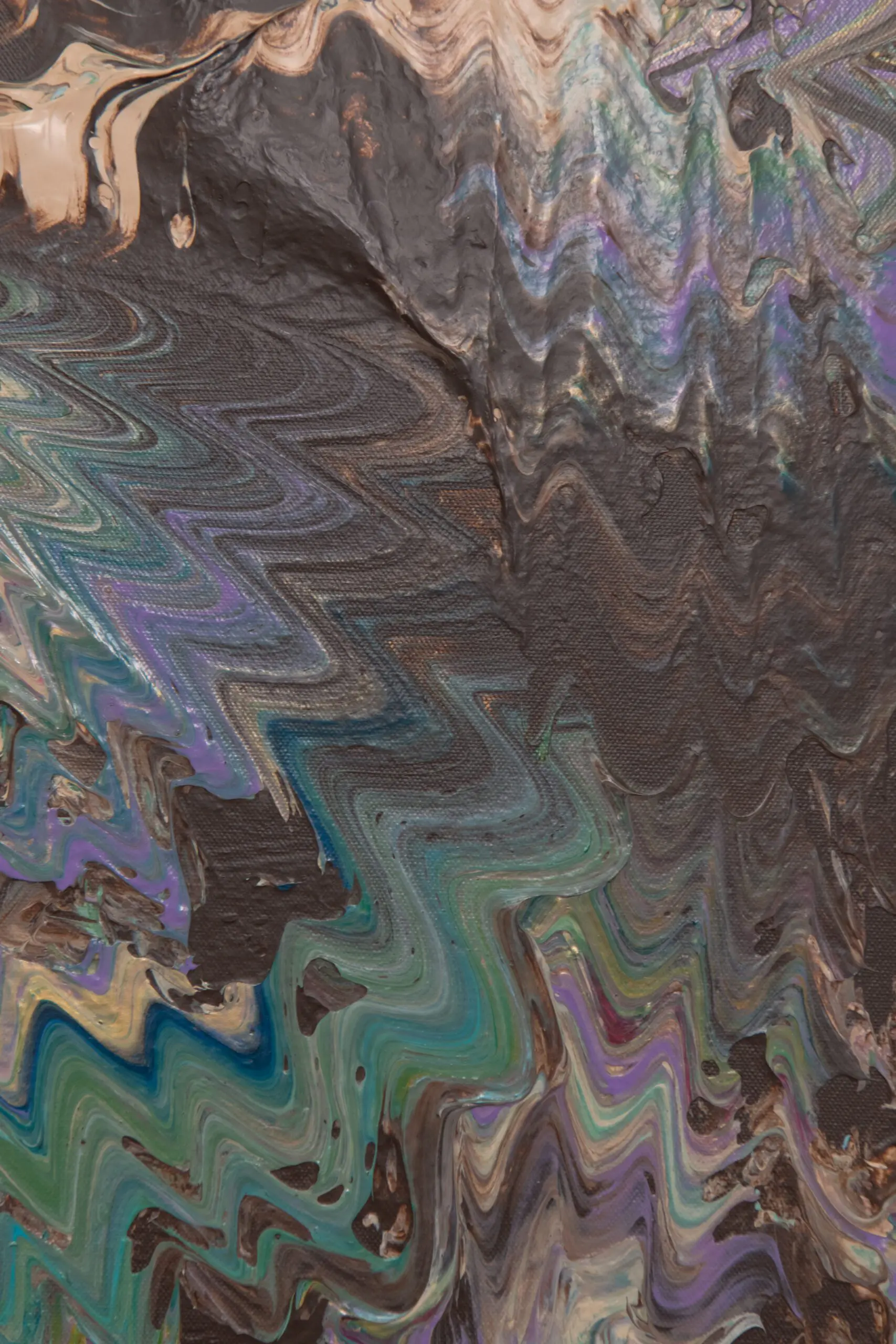 A clear diagonal division, established by fluid, undulating brushstrokes traverses the canvas. The upper section is dominated by rich mocha hues, which gradually soften and blend into the cooler tones below. The artist introduces a subtle but effective use of blues, greens, and purples, which contrast with the warmth of the mocha and cream. This contrast creates a dynamic tension between the warm and cool elements, adding depth and a sense of movement to the composition. The careful modulation of color and tone invites a sense of both fluidity and balance, drawing attention to the delicate interplay between opposing forces.