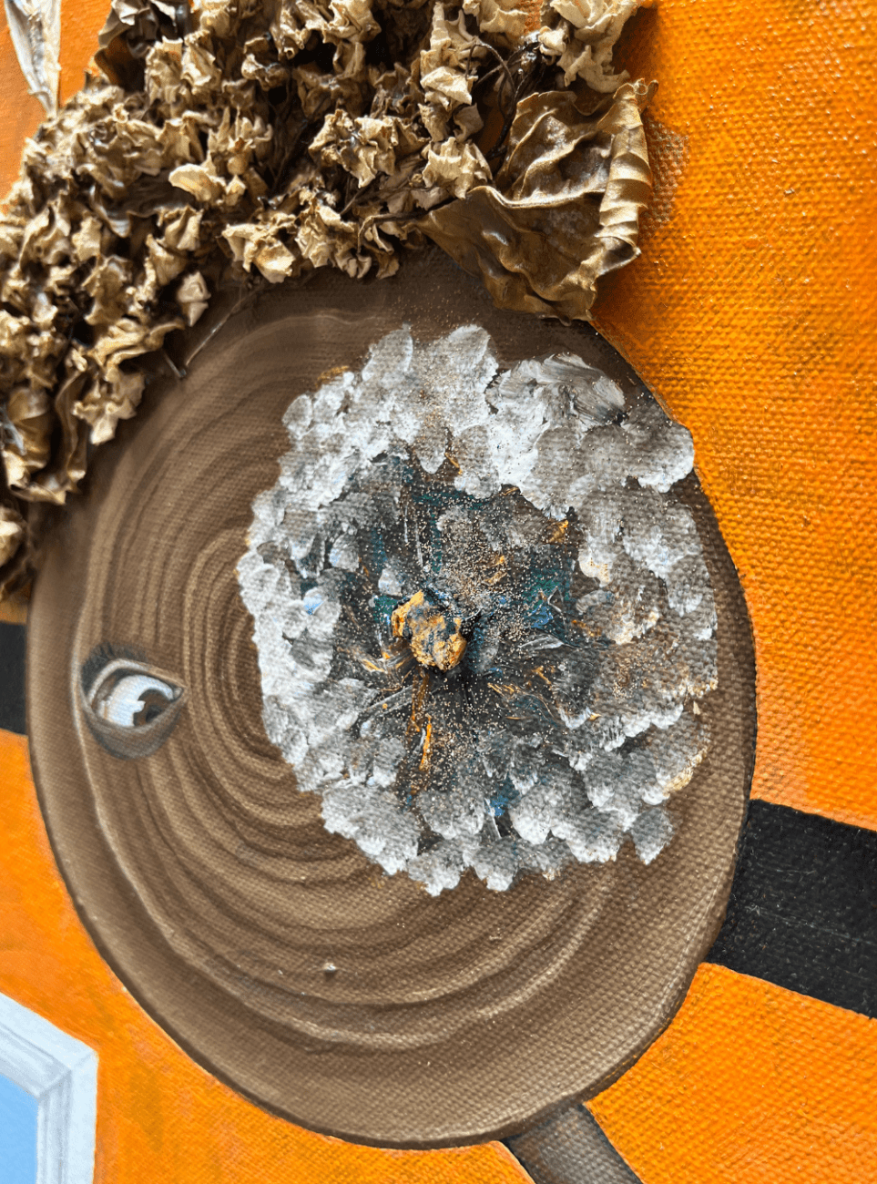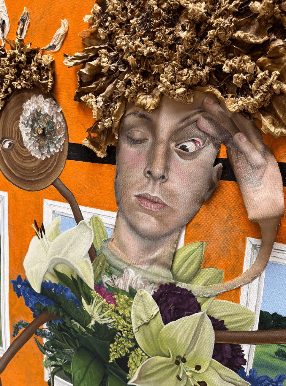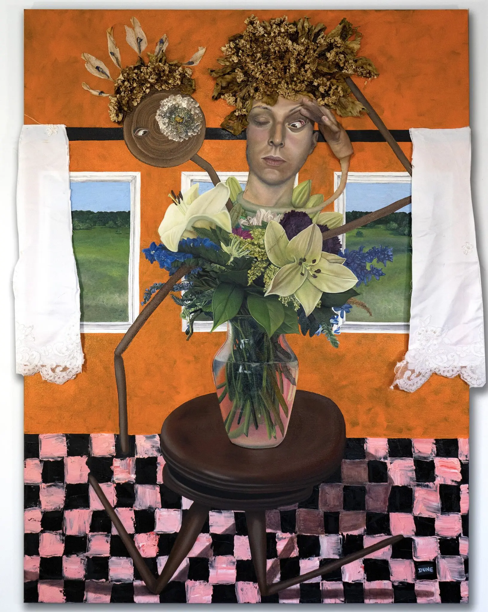 Oil, acrylic, wedding dress (curtains), and dried flowers on canvas.