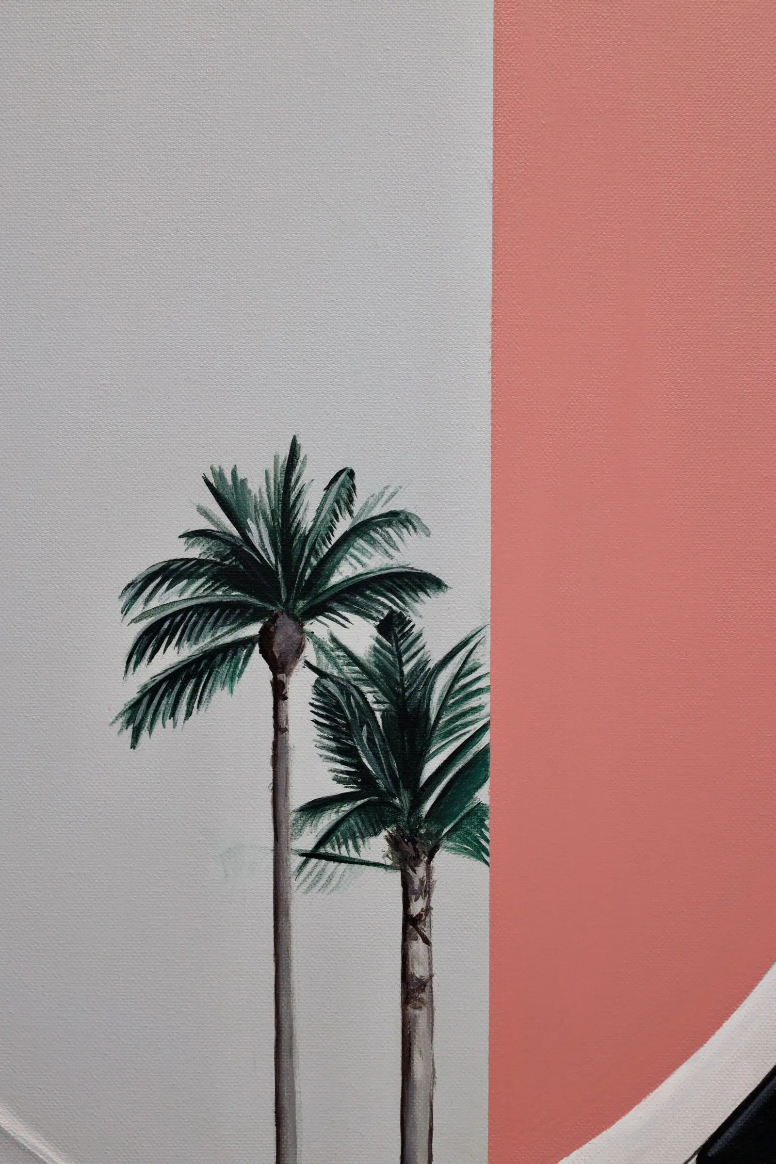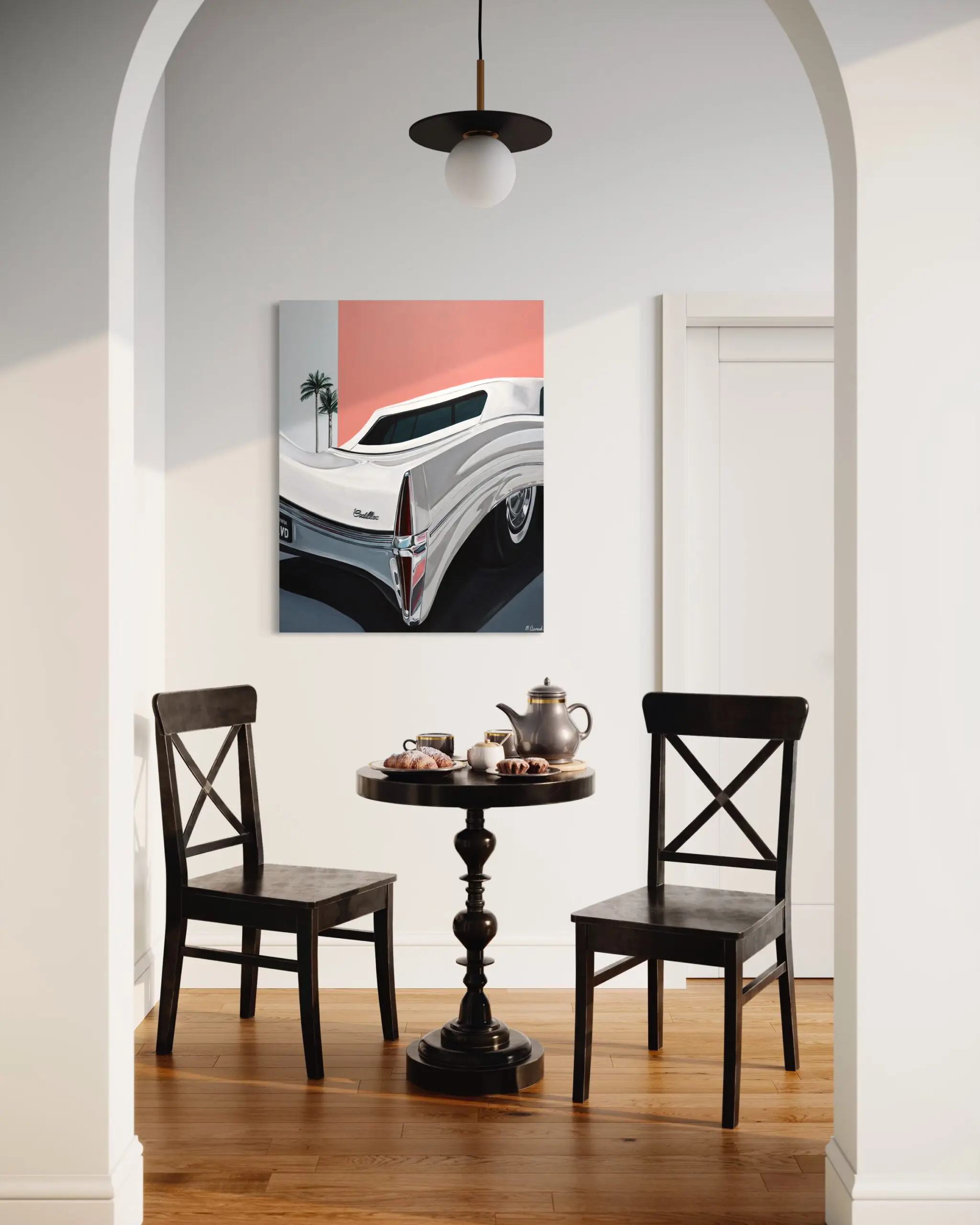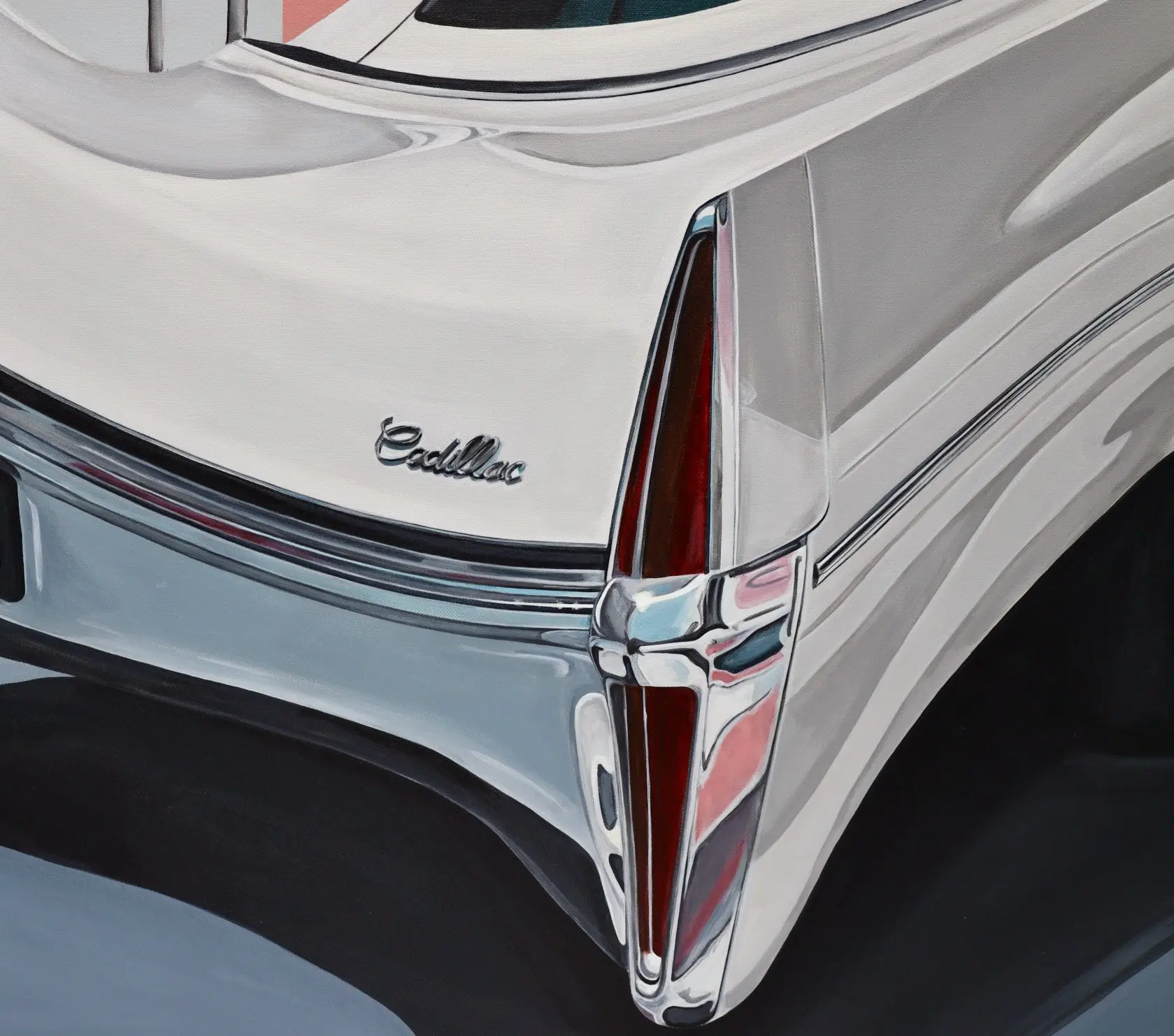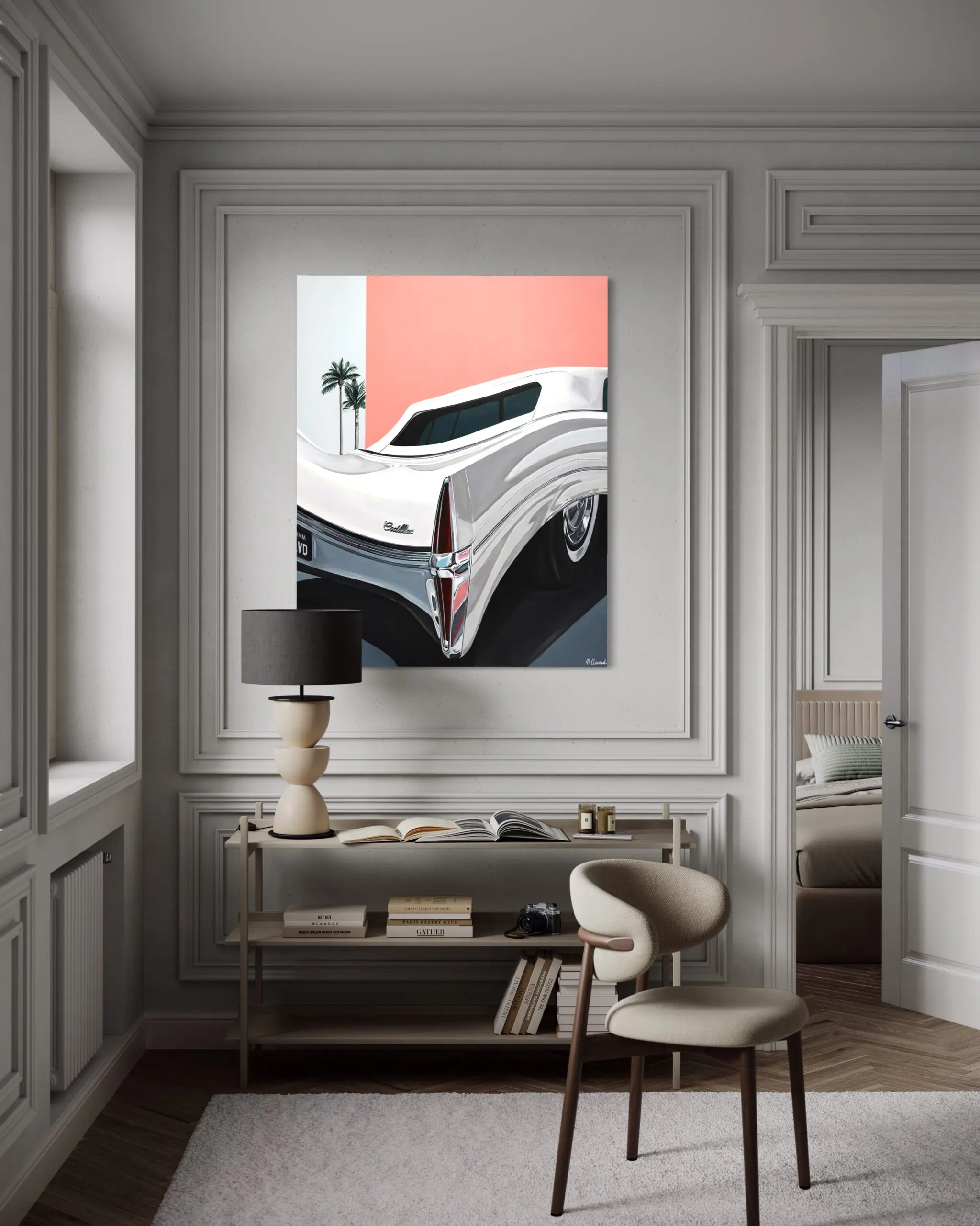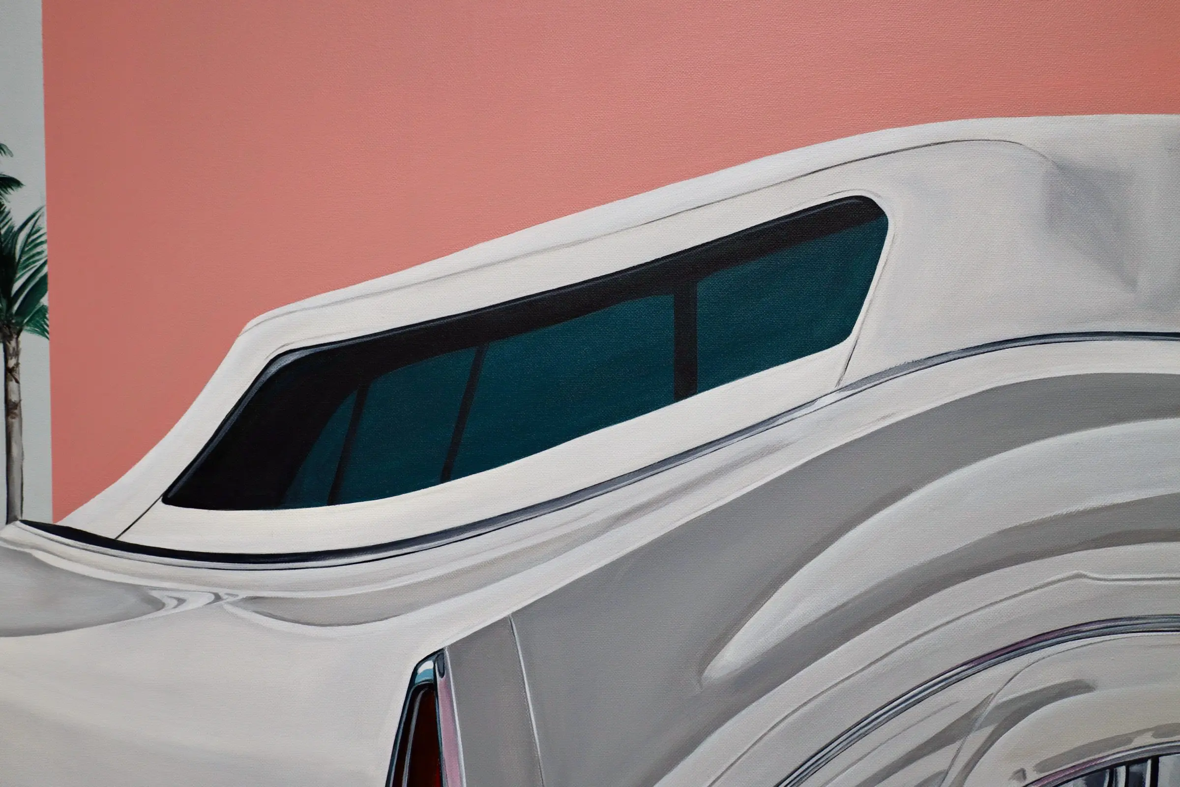 The painting “Fluid Cadi” draws inspiration from a fusion of the artist’s travel recollections and dreamscapes. Captured during a trip to California, the artist encountered this Cadillac on a quiet street just off Hollywood Blvd. In recalling the moment, she reminisced about the ambiance as if it were lifted from a dream—an almost deserted street, the Cadillac harmonizing with a vibrant wall, basking in the sun, and collectively creating an ethereal atmosphere.