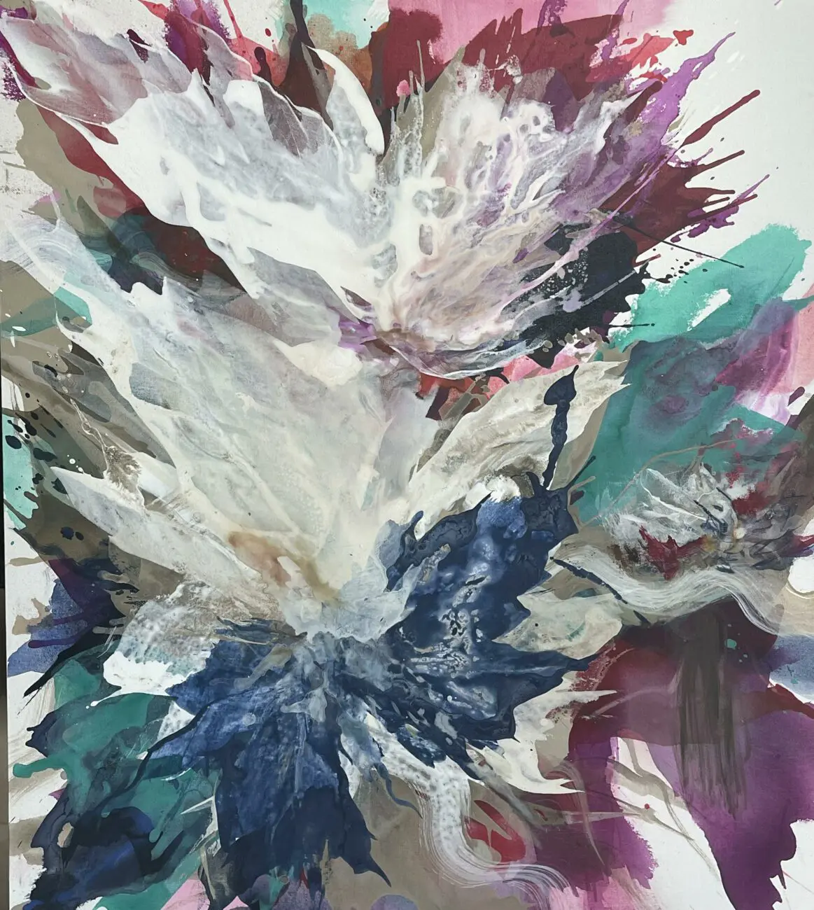 This vertical 32 inch high and 28 inch wide abstract painting on canvas is stretched and ready to hang. It is signed on the front and back of the artwork. The juxtaposition of textures, reliefs, patterns, consistencies, and densities result in an exquisite atmospheric quality.