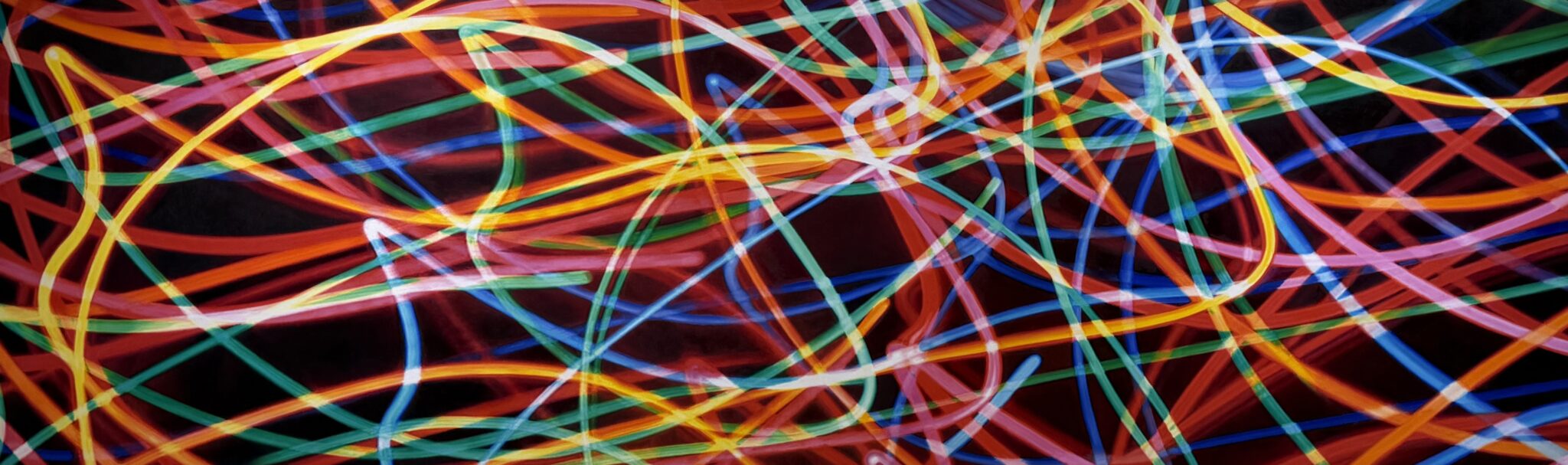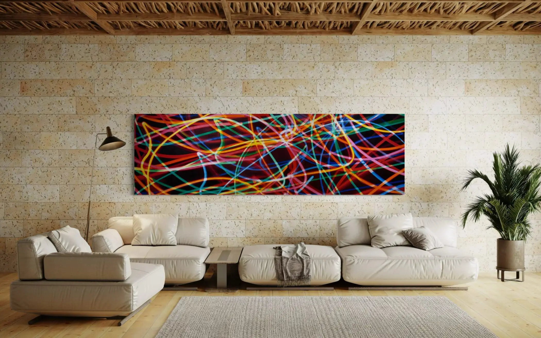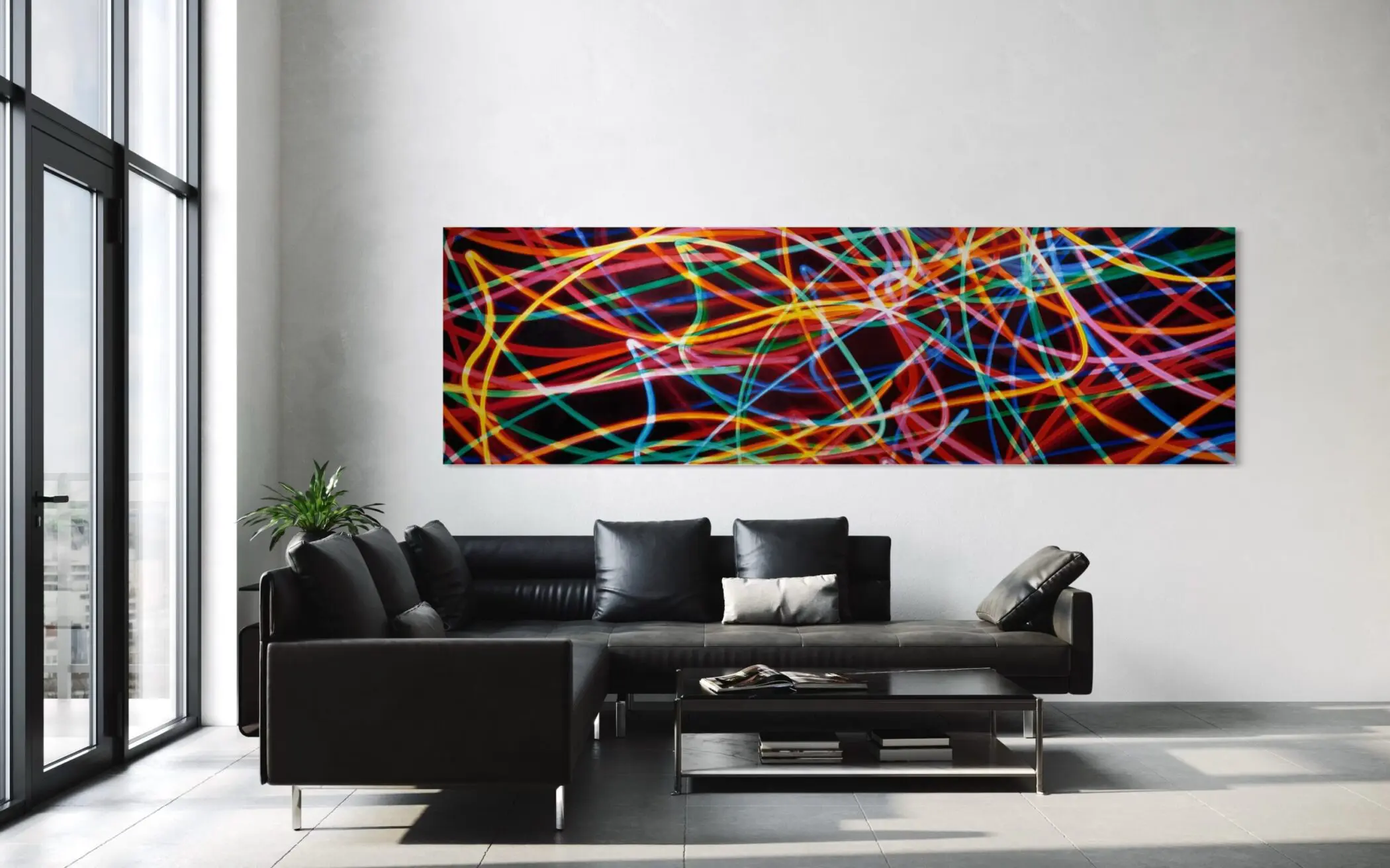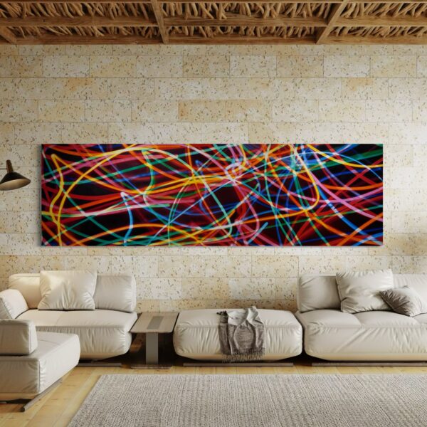 “Free Will” embraces unpredictability as a principle of design, capturing the spontaneity of movement through controlled chaos. The composition is a web of electric energy—neon threads of orange, blue, red, and green crisscross against a black void, suggesting a collision between randomness and intent.