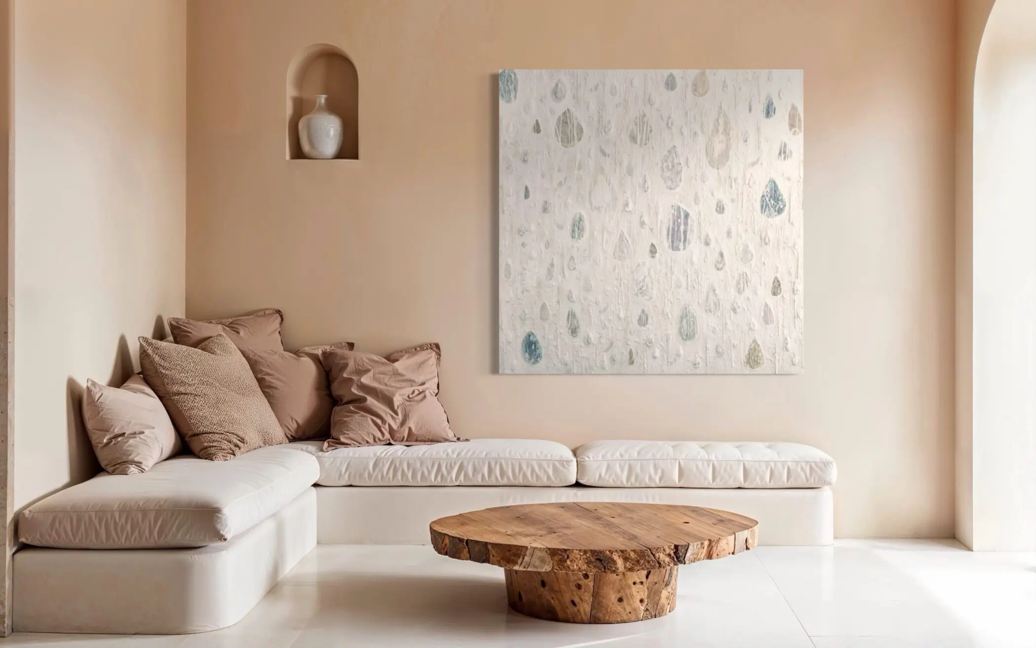 What makes “Frosted Trickle” unique is its textural complexity. The raised, sculptural quality of the mixed-media surface mimics the organic irregularity of real droplets on glass or stone, giving the piece an almost tactile presence. The layering of these elements—some crisp and defined, others barely discernible against the pale backdrop—creates a sense of depth, as though the droplets are caught in different stages of formation or evaporation. While some of the droplets depicted are large and prominent, others recede into the background, like fading memories or the last remnants of a misty rain. This variation keeps the eye engaged, allowing the viewer to wander through the piece, discovering new details with every glance.