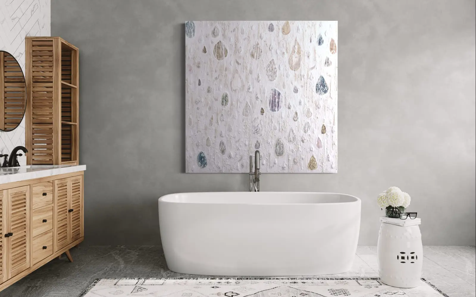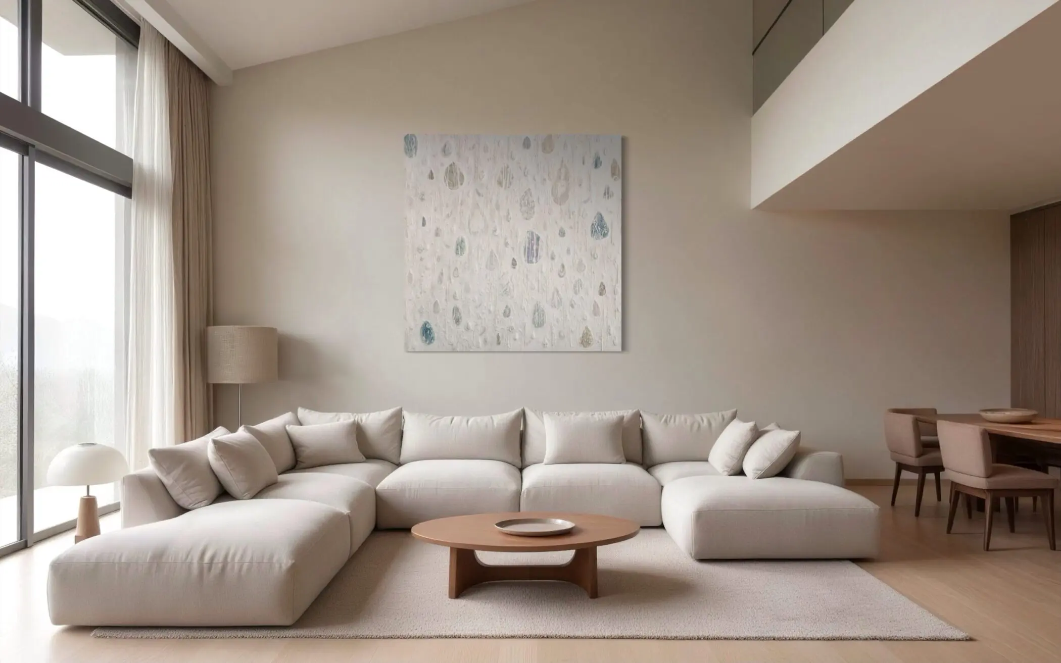The nearly monochromatic palette of whites, soft grays, muted blues, and hints of warm neutrals creates an atmosphere of serenity and introspection. The translucent water droplets, rendered in varied sizes and degrees of opacity, appear suspended, as if frozen in time. There is a sense of weightlessness, of air and light filtering through the surface, reinforcing the painting’s ethereal quality.