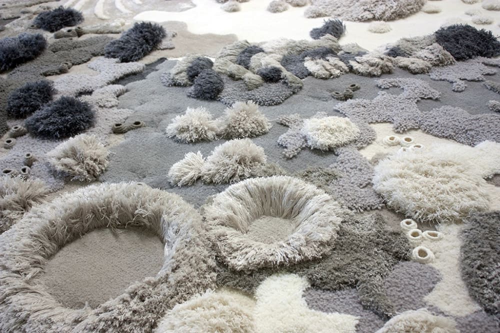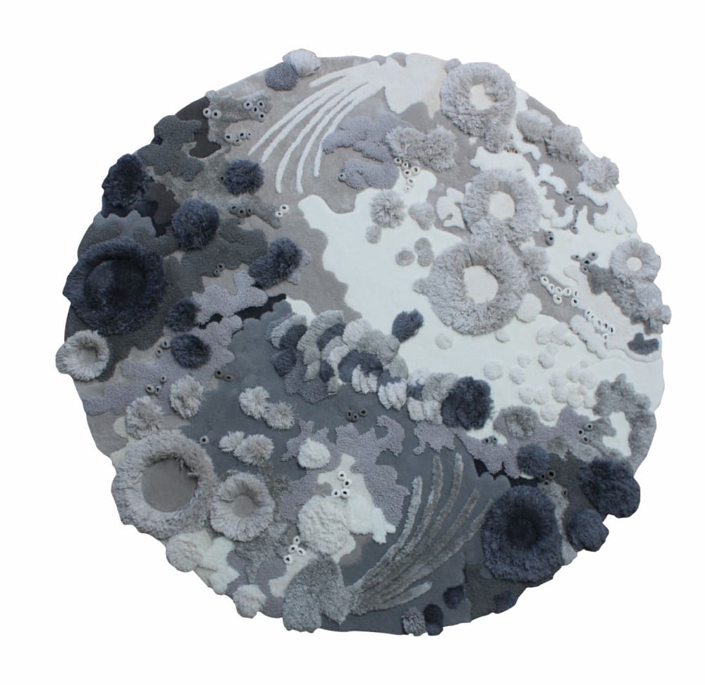 The shapes of this rug are inspired by the different blurs of the Moon’s gravity field and the coral reefs of the sea. The surface of the Full Moon rug is filled with tons of textures which can be seen and felt by the different quality of materials and in the details of little crochet urchins inserted in different sculpted levels of hand-tuft.