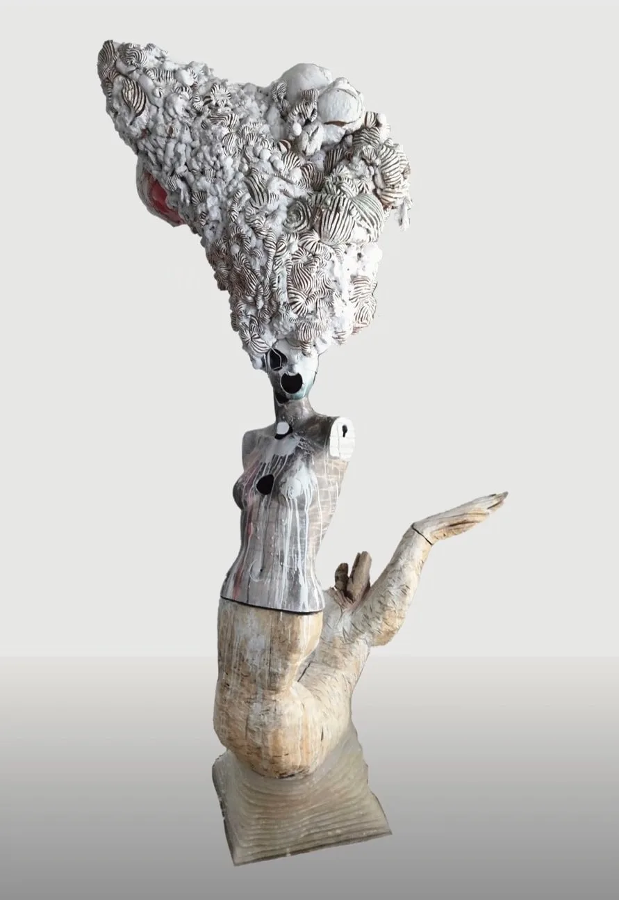 The distorted wooden limbs, carved with rough, almost visceral texture, twist upward in a pose that feels both balletic and unnatural—suggesting movement but also an entrapment within its own form. The torso, a mannequin-like structure introduces a layer of artificiality, further breaking away from traditional depictions of the mermaid as a seamless fusion of human and aquatic elements. Instead, this figure exists in a state of tension between construction and deconstruction, a creature neither fully formed nor entirely undone.