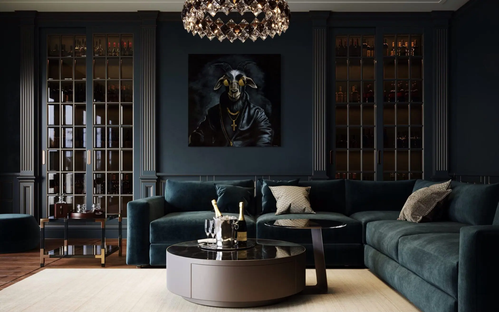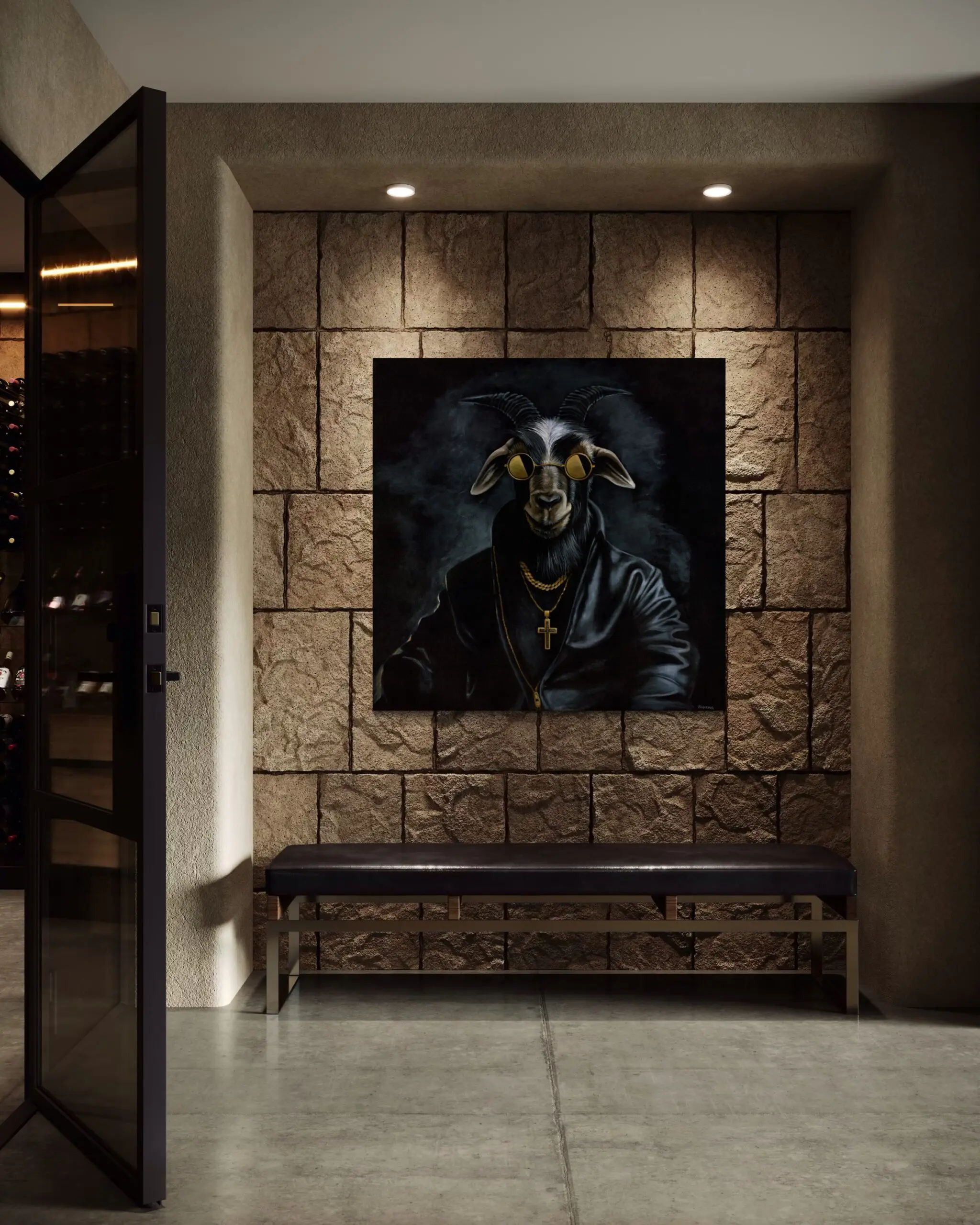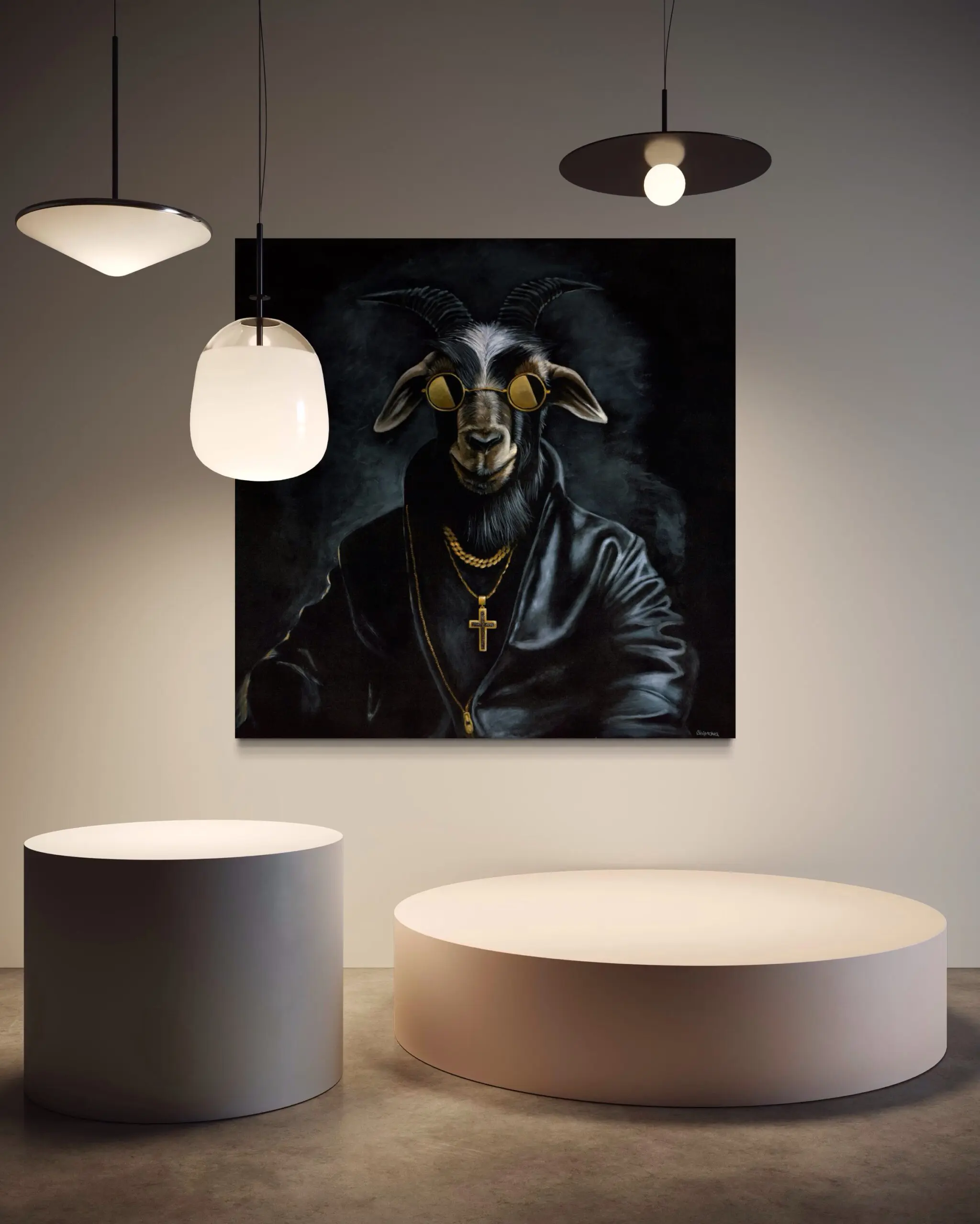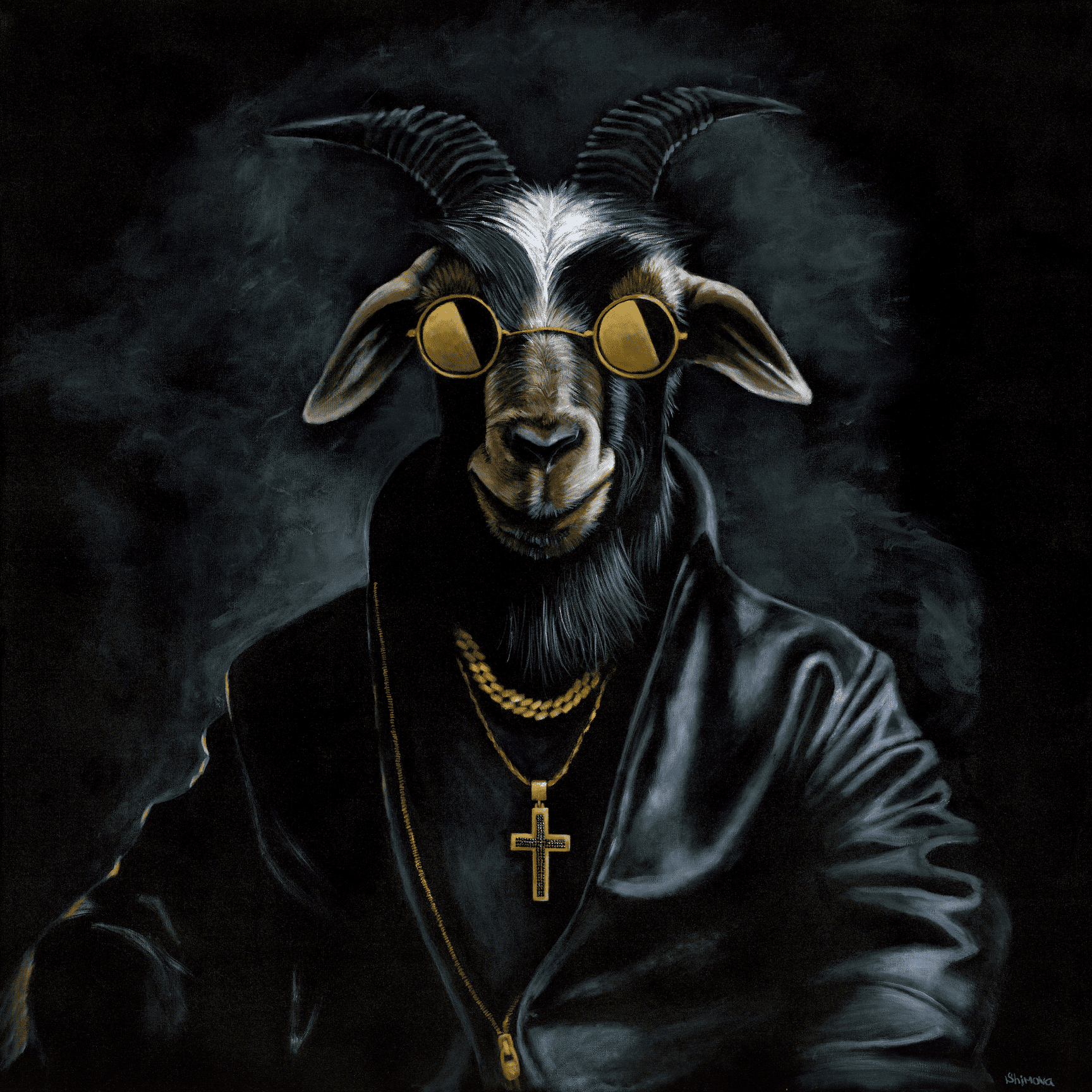 “G.O.A.T.” is a striking portrait that redefines power, status, and cultural mythology, blending classical portraiture with modern iconography. This compelling artwork presents a regal goat, draped in a black leather jacket, layered gold chains, and reflective sunglasses, embodying the commanding presence of the “Greatest of All Time” (G.O.A.T.). Set against a brooding, smoke-laden background, the subject radiates an aura of dominance, mystery, and undeniable charisma.