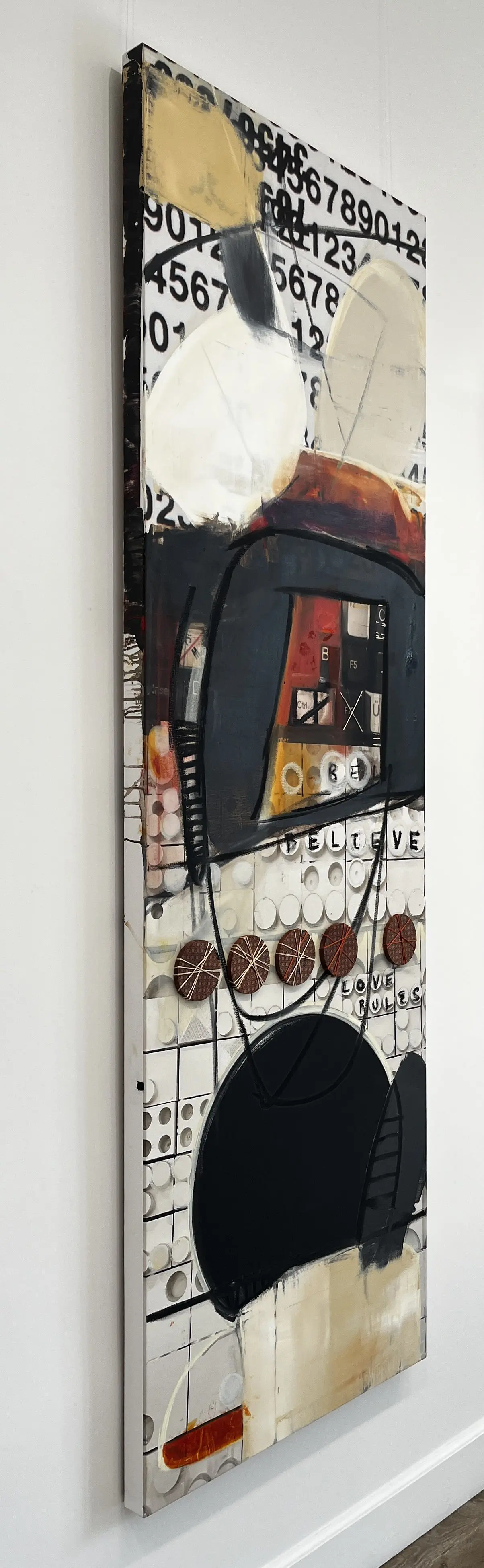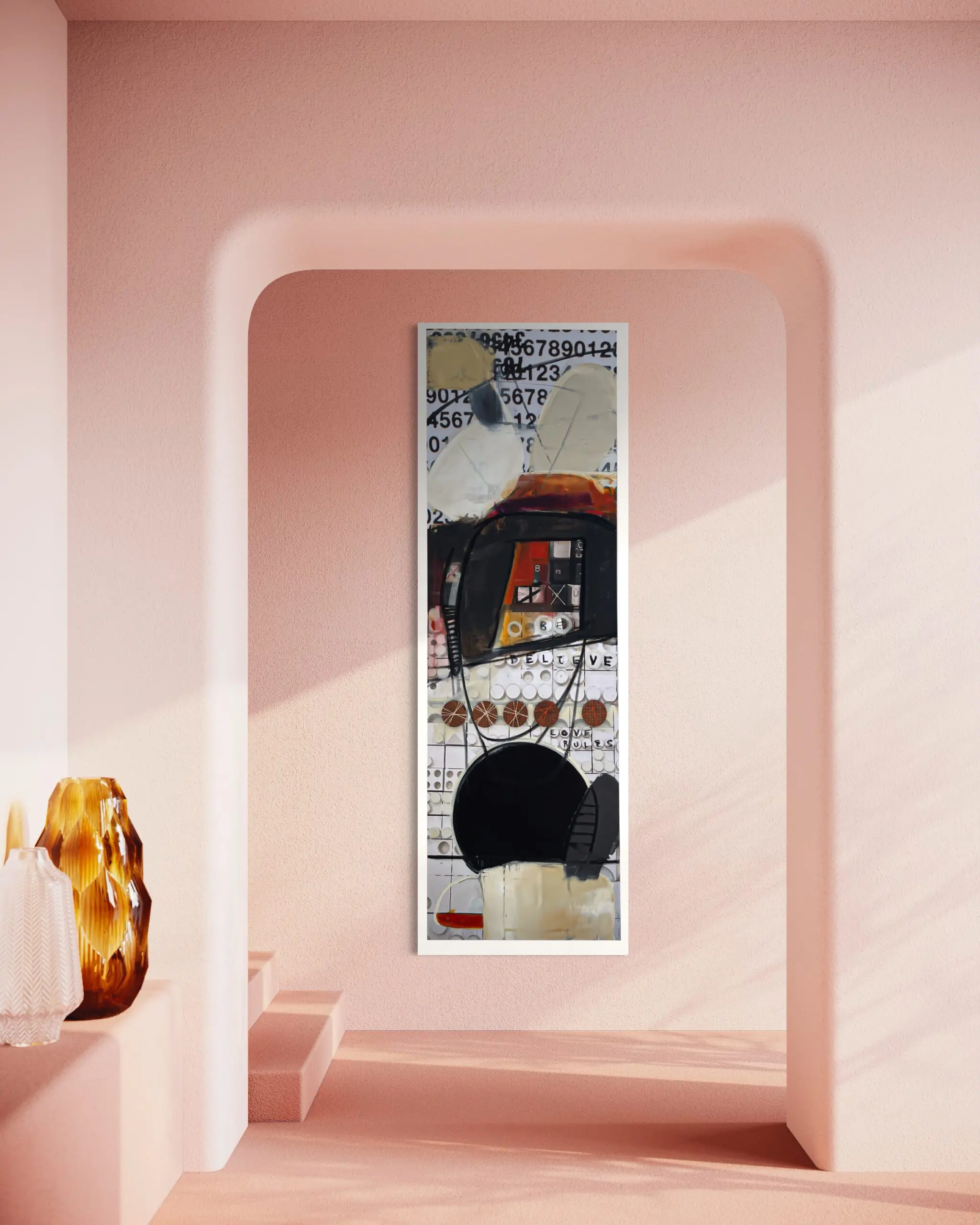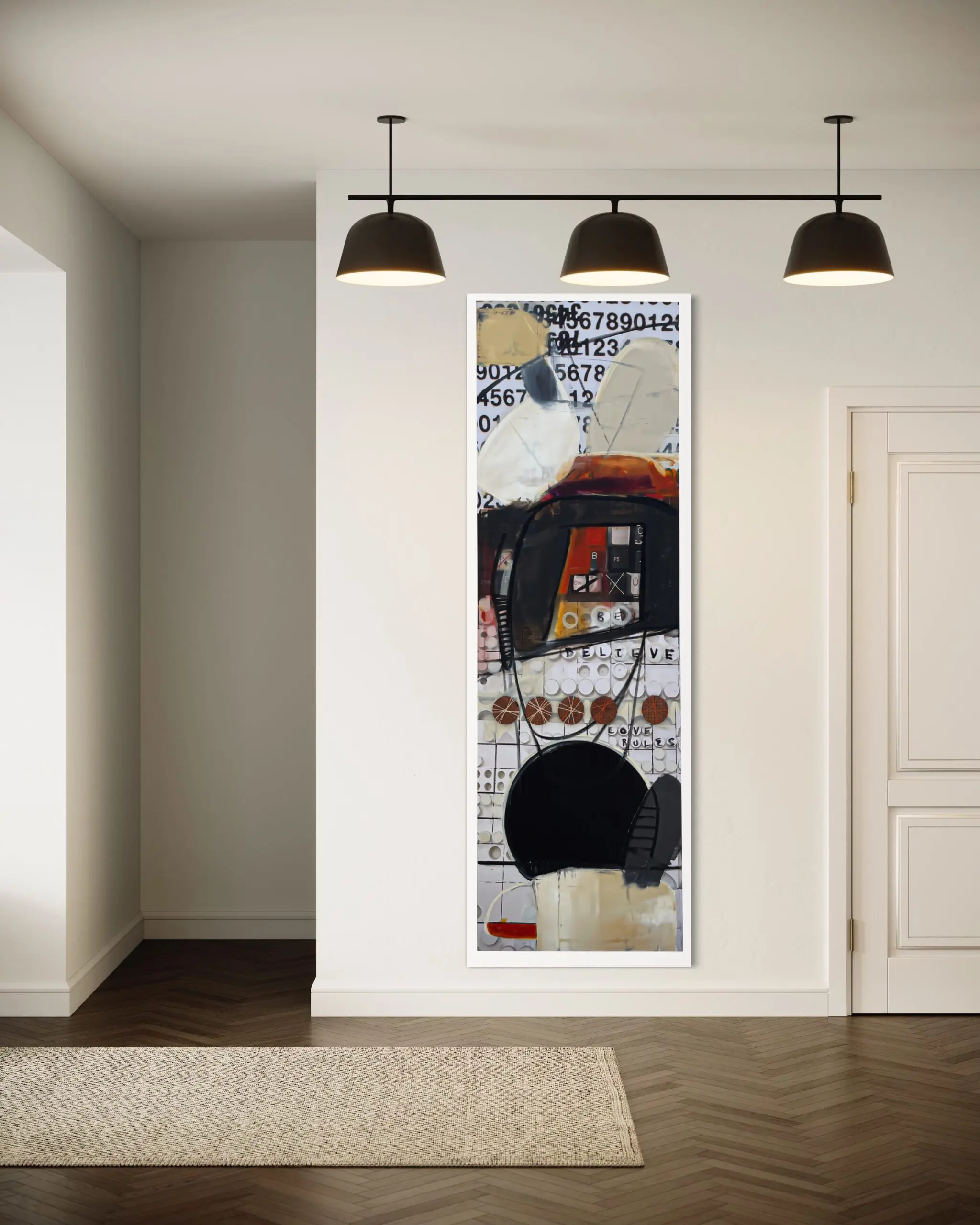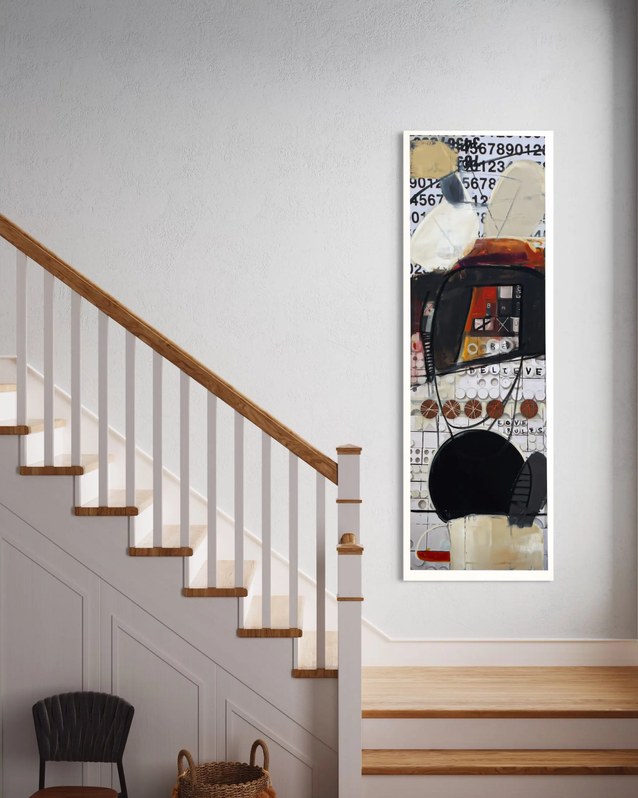 Step into the enchanting world of Anthony Liggins’ mixed media masterpiece, “Ghost Writer,” where spirituality meets artistic expression, and beige, black, and burnt orange tones meld in perfect harmony to enhance any interior space.
