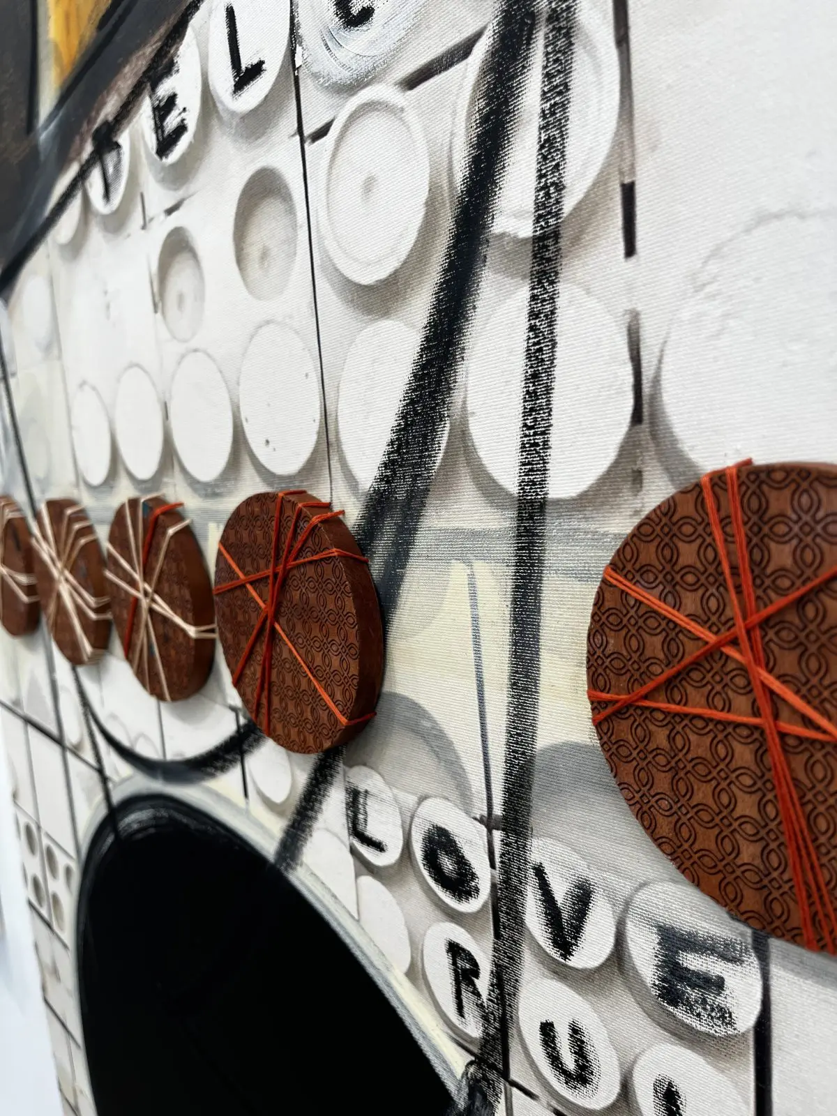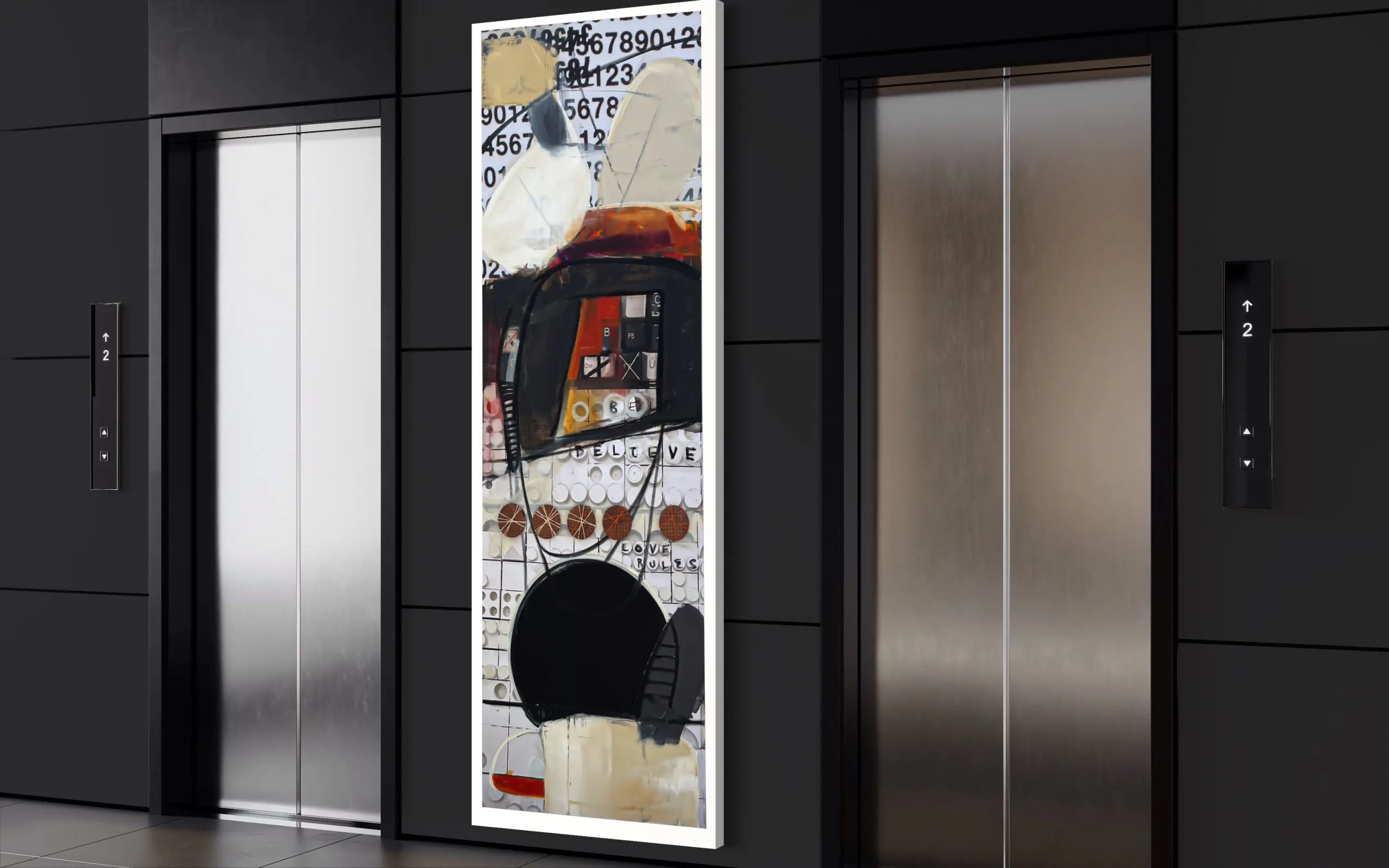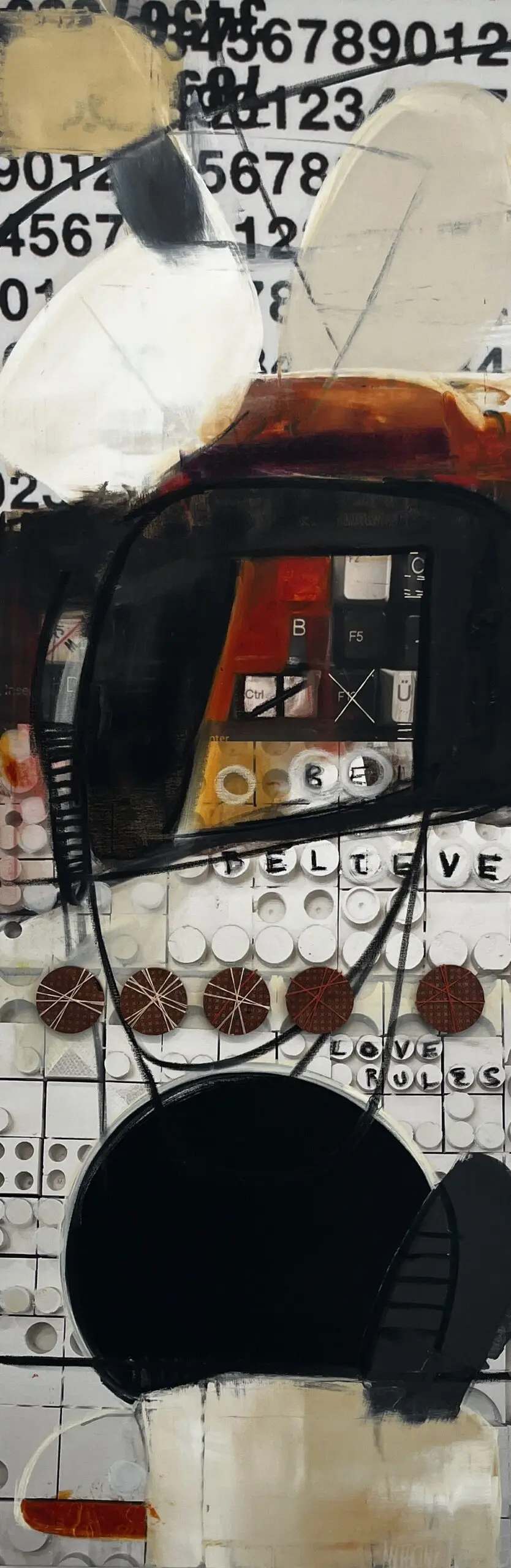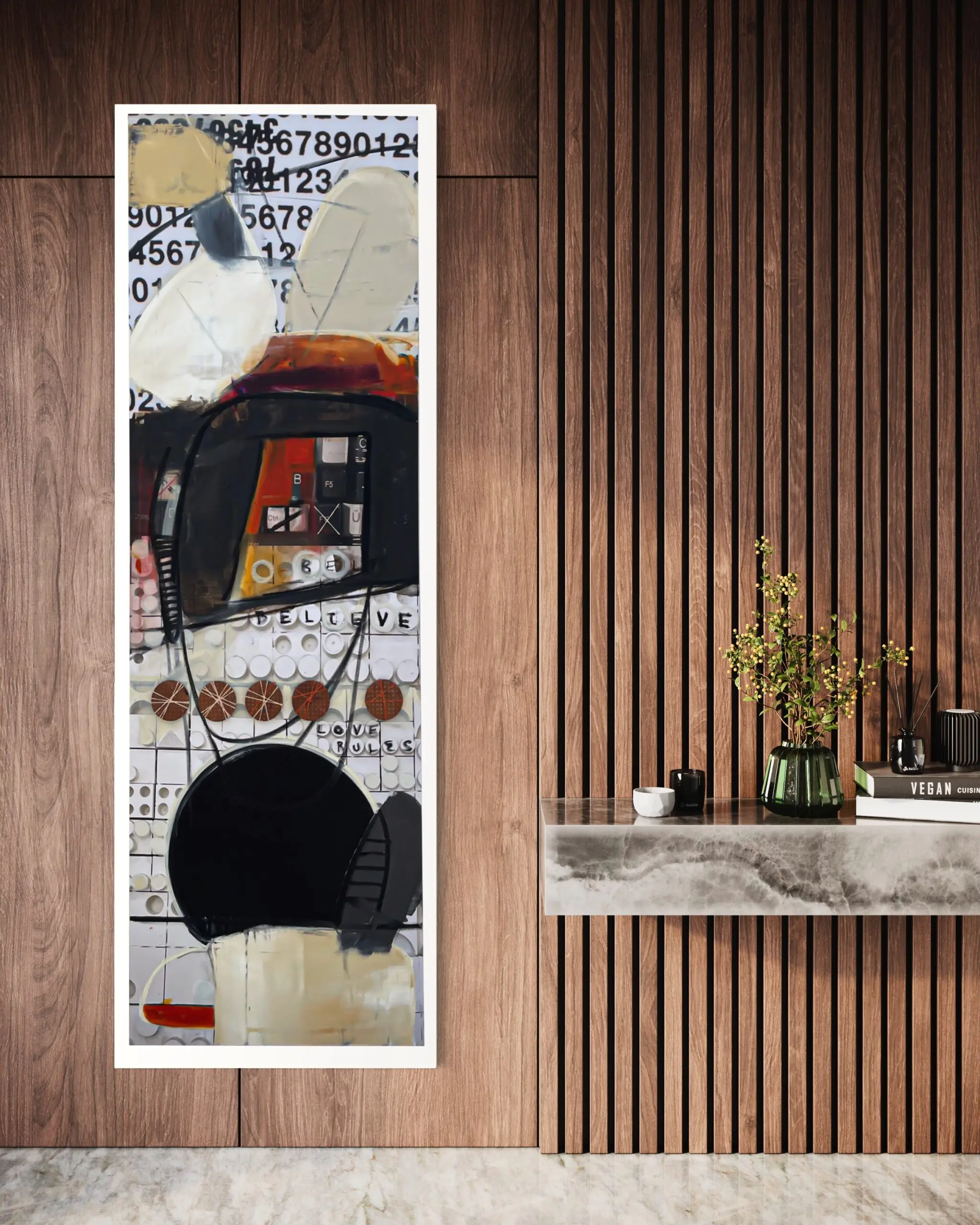 Step into the enchanting world of Anthony Liggins’ mixed media masterpiece, “Ghost Writer,” where spirituality meets artistic expression, and beige, black, and burnt orange tones meld in perfect harmony to enhance any interior space.
