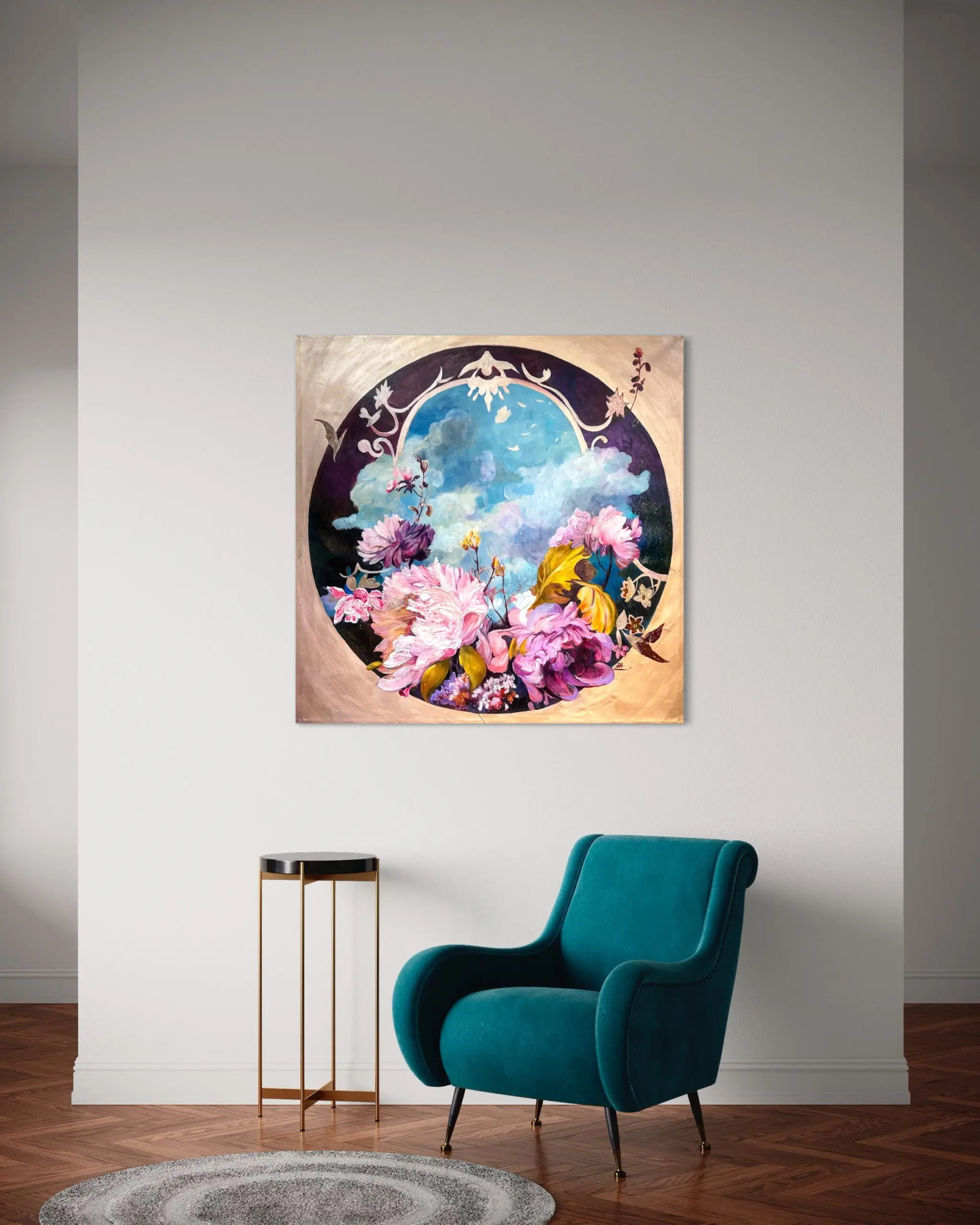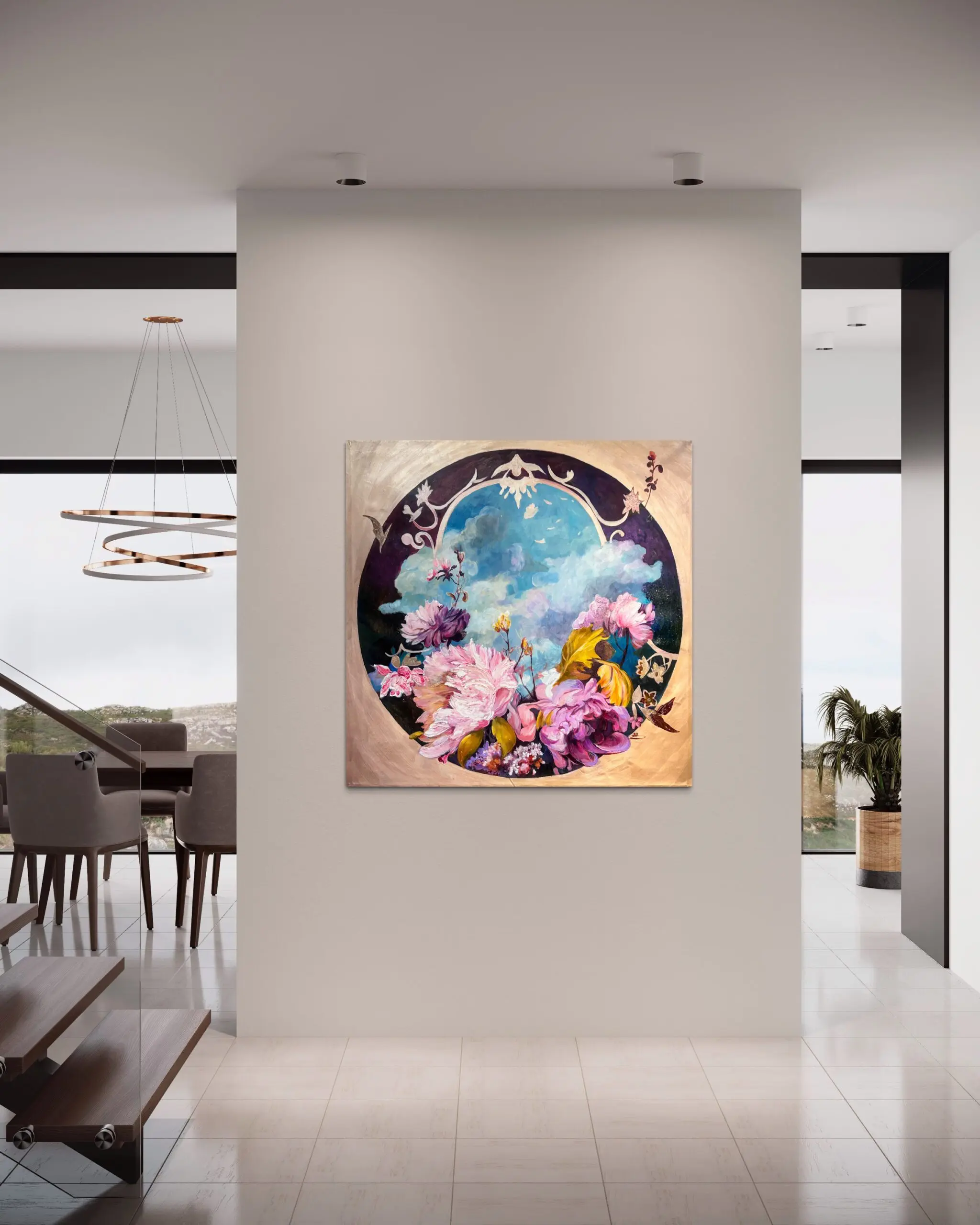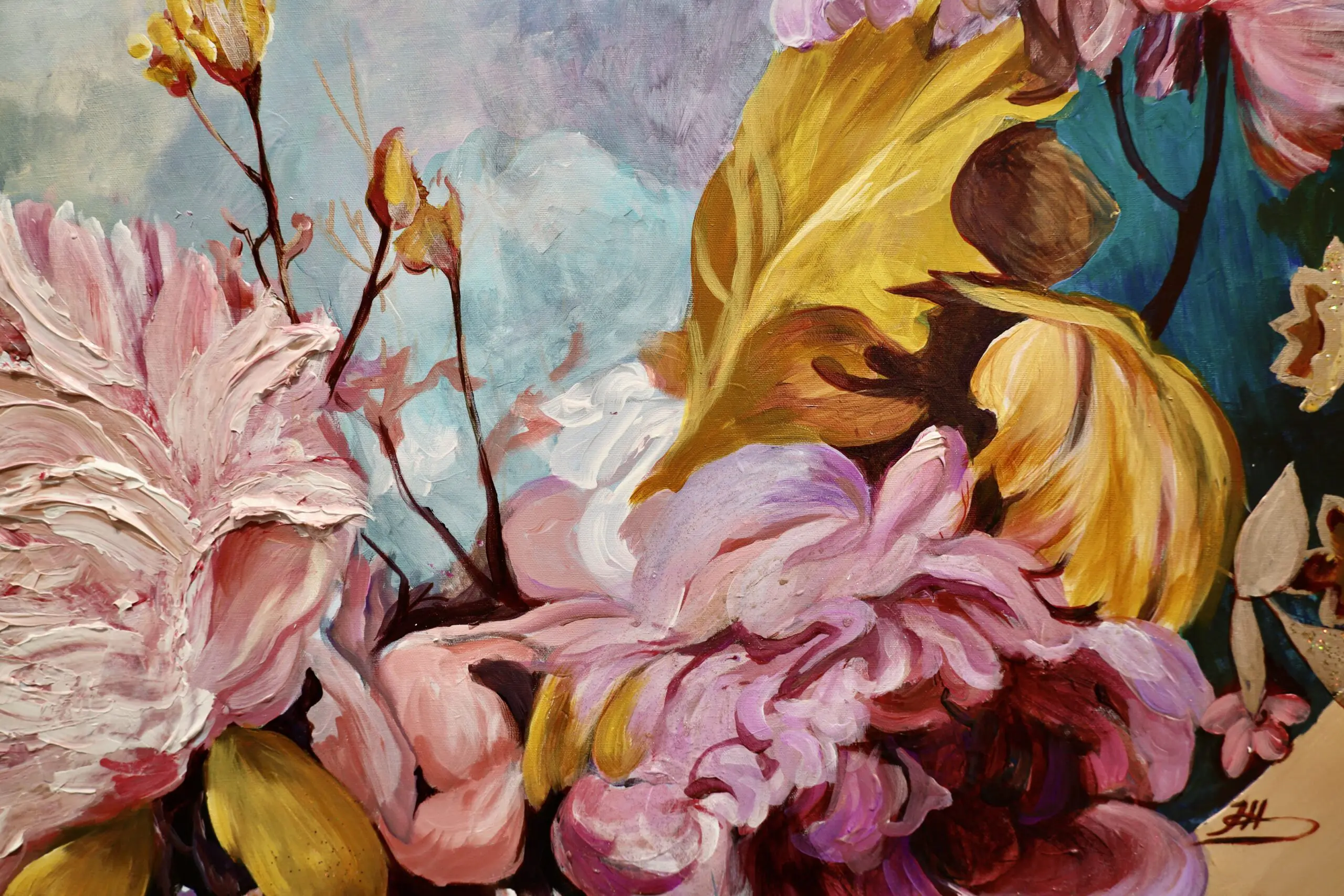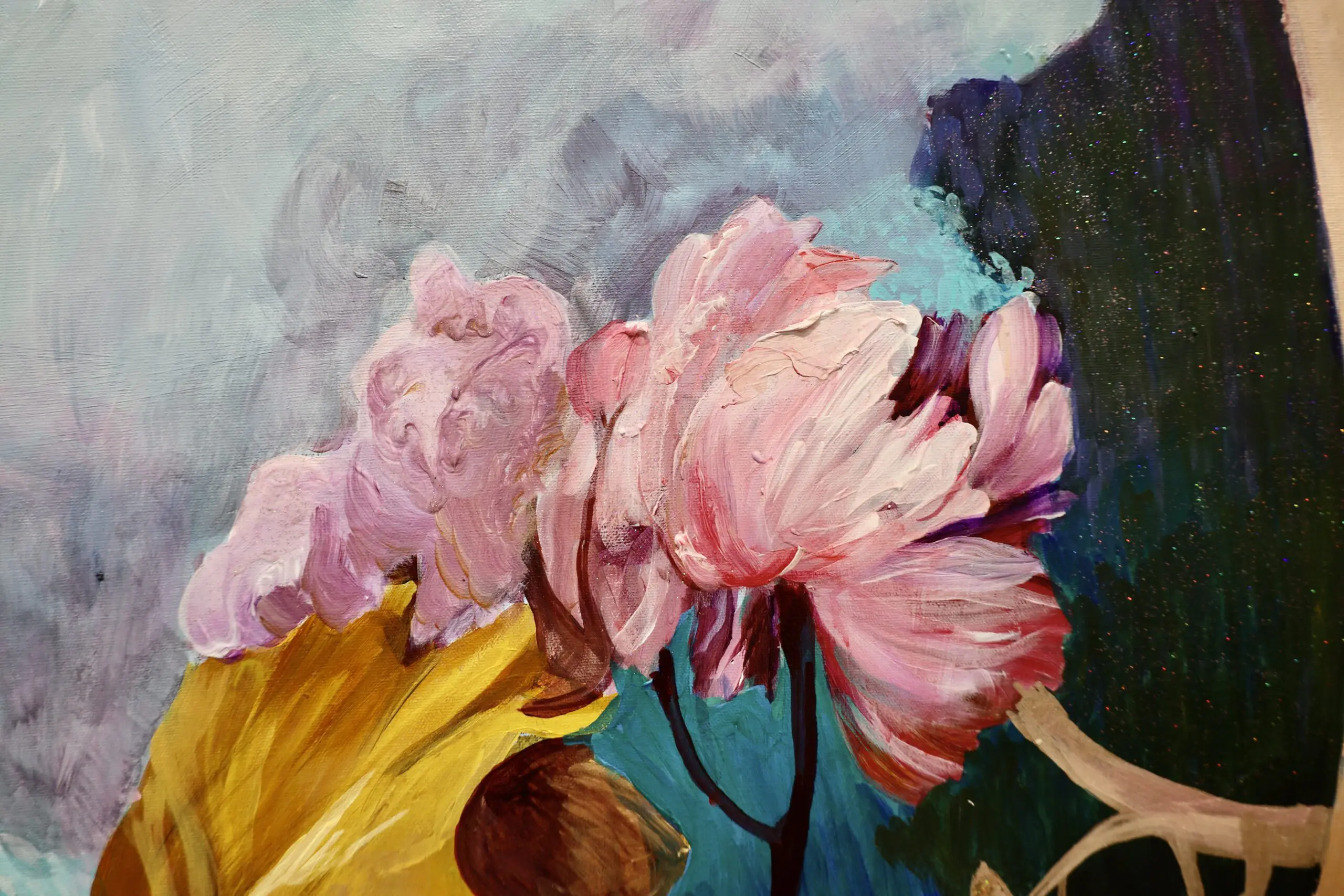 The focal point of the painting is the flowers themselves, which seem to protrude out of the canvas, almost as if they exist in a three-dimensional realm. They are enveloped by a swirling cloud, creating an ethereal atmosphere that adds an element of mystery and enchantment. The cloud seems to embrace and protect the flowers, enhancing their presence and creating a visual contrast against the vibrant hues. The dominant tones of fuchsia, yellow, and purple create a harmonious symphony of colors, evoking a sense of joy and vitality.There is an Anise-like quality to the flowers, as if their beauty is a lure, beckoning the viewer to come closer so that they can be devoured by their enchanting charm.