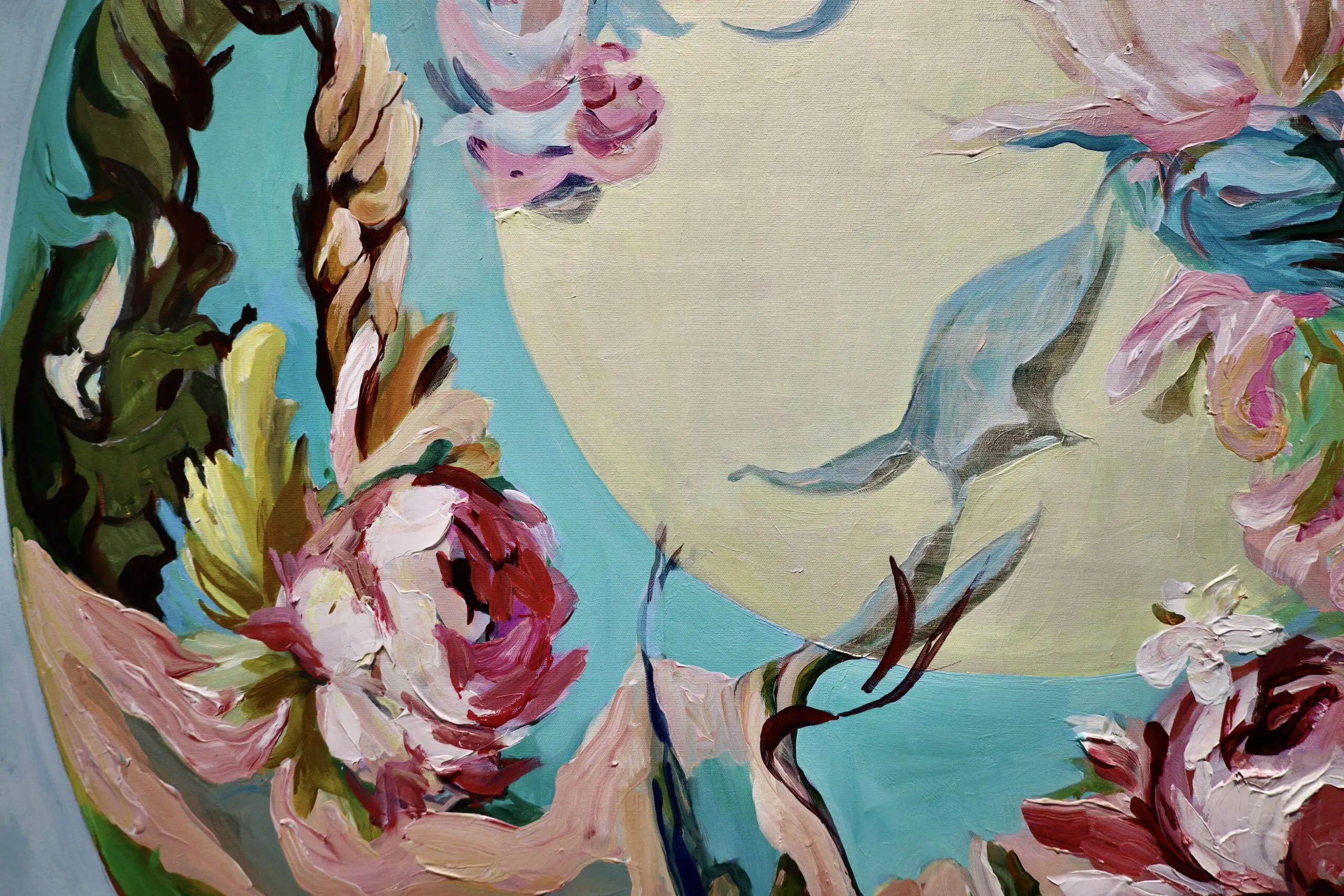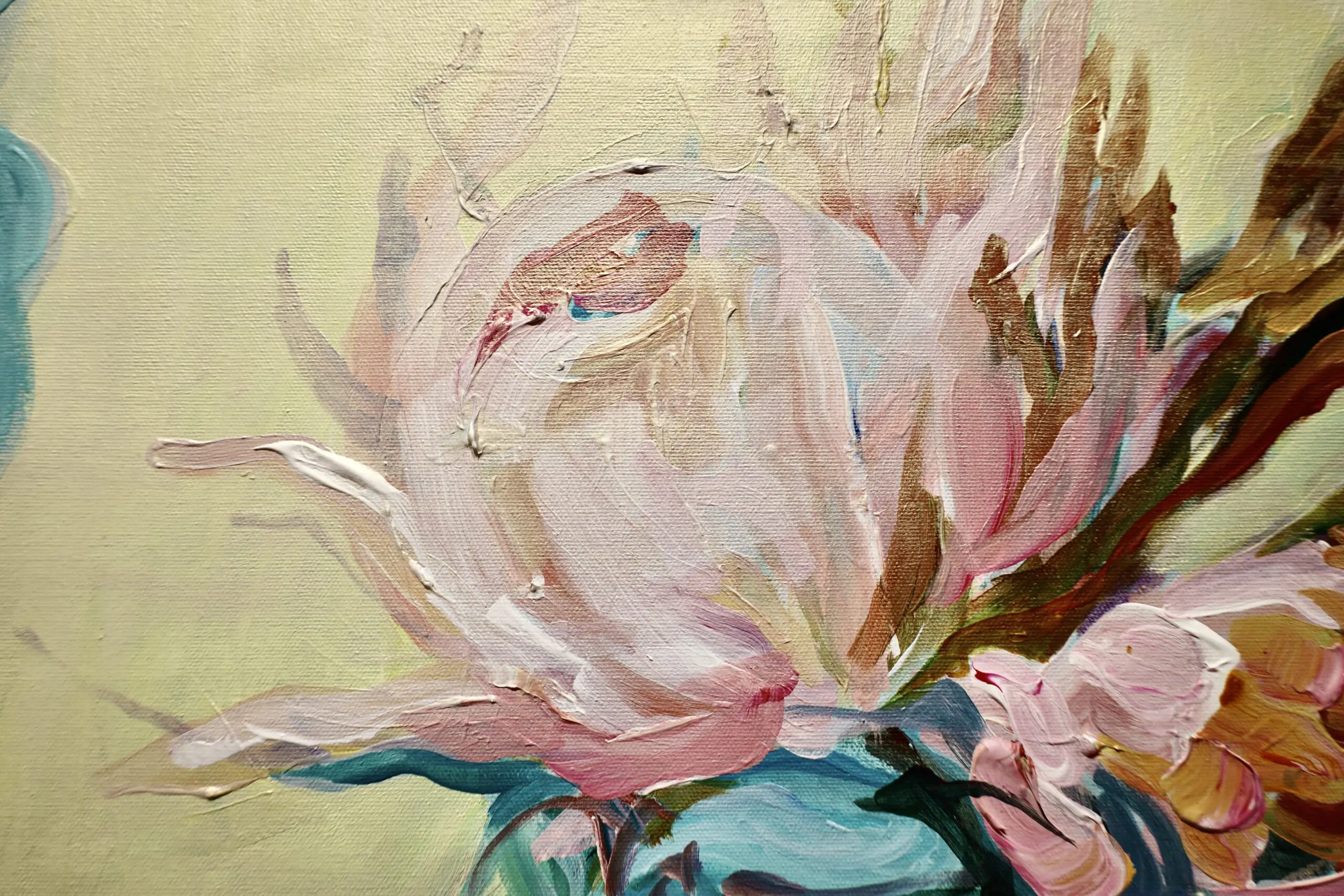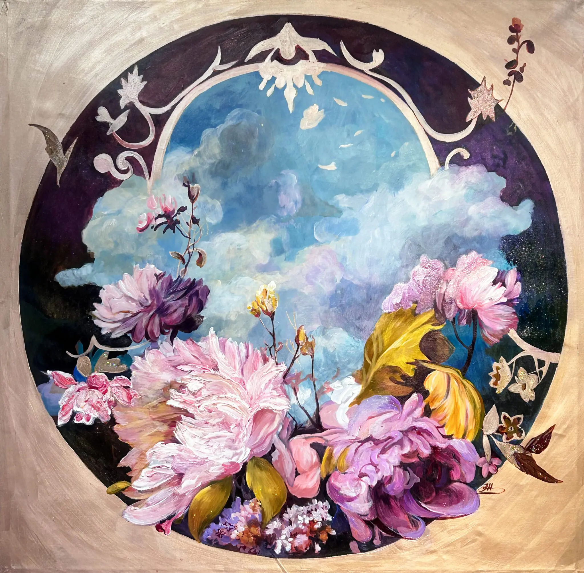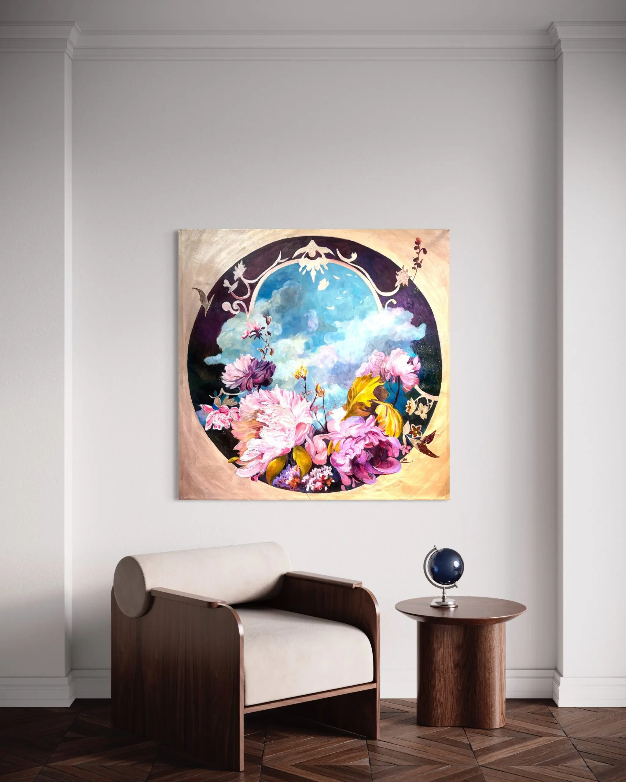 The focal point of the painting is the flowers themselves, which seem to protrude out of the canvas, almost as if they exist in a three-dimensional realm. They are enveloped by a swirling cloud, creating an ethereal atmosphere that adds an element of mystery and enchantment. The cloud seems to embrace and protect the flowers, enhancing their presence and creating a visual contrast against the vibrant hues. The dominant tones of fuchsia, yellow, and purple create a harmonious symphony of colors, evoking a sense of joy and vitality.There is an Anise-like quality to the flowers, as if their beauty is a lure, beckoning the viewer to come closer so that they can be devoured by their enchanting charm.