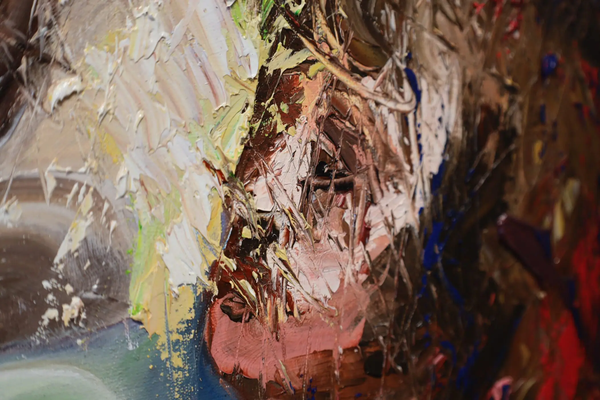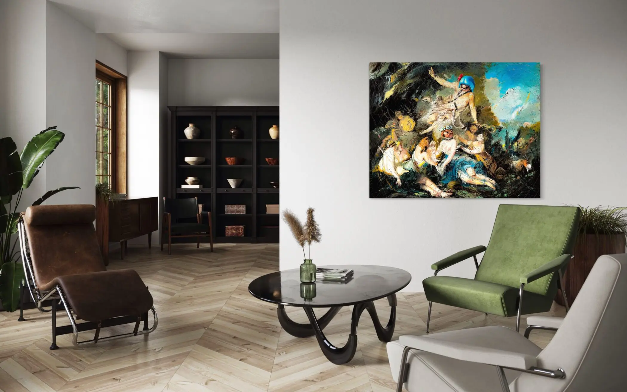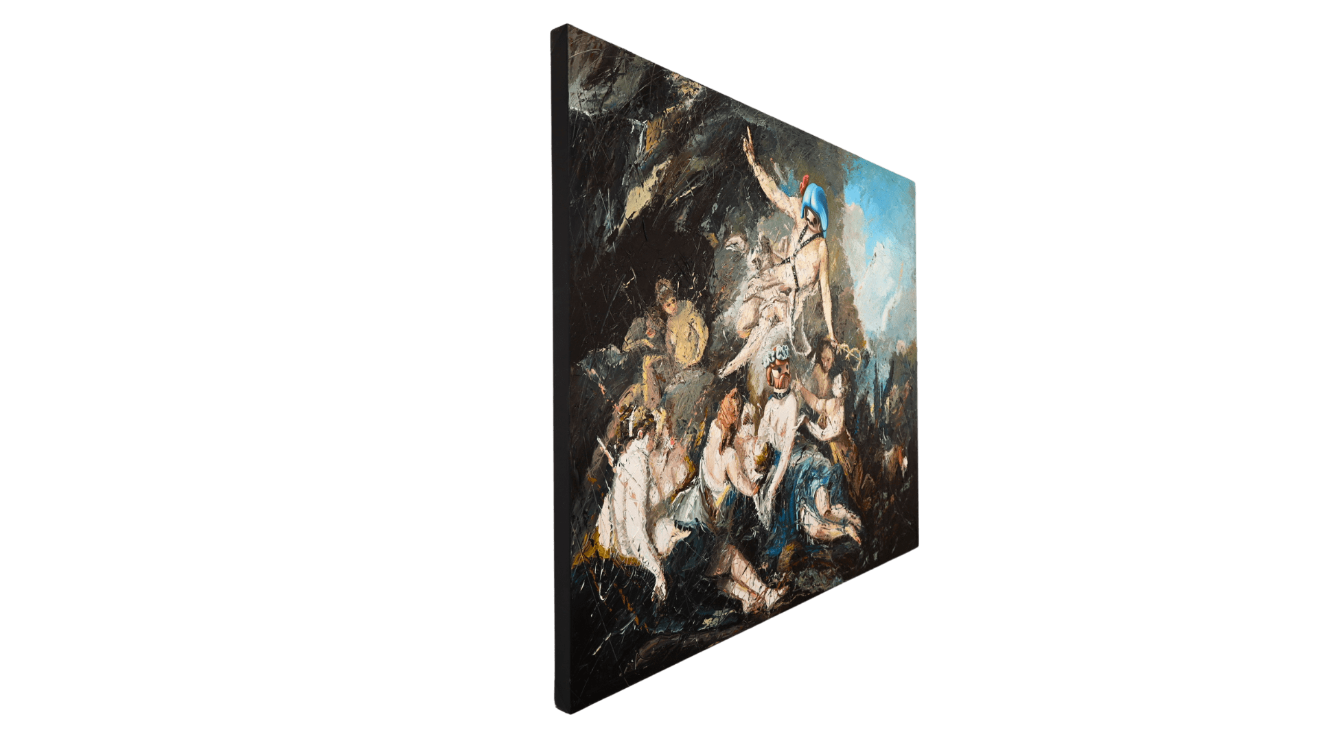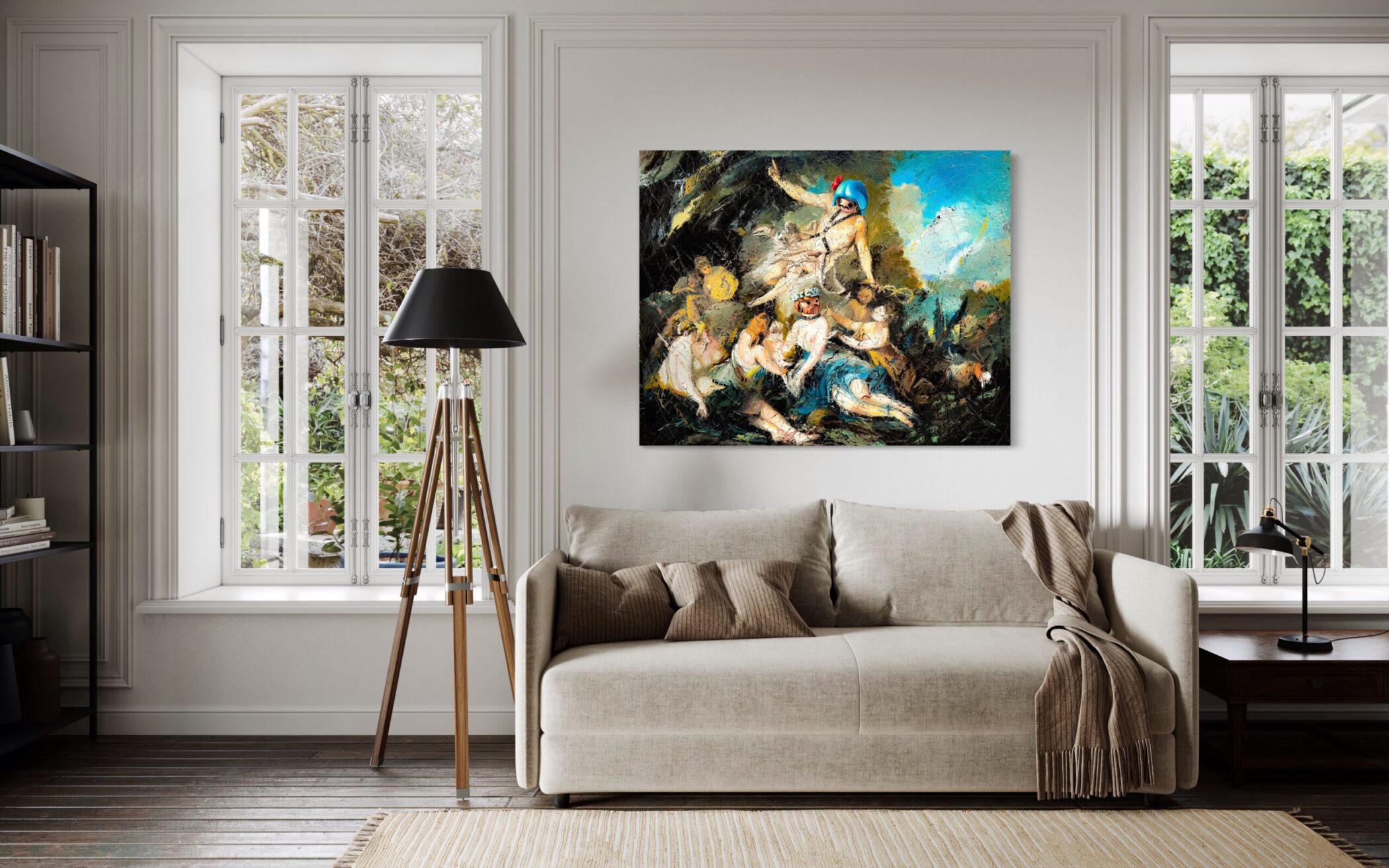 In “God is Diversity”, the central figure, wearing a blue helmet, appears to ascend dramatically, surrounded by other whimsical characters, including one with a flower crown.The background uses broad, expressive brushstrokes in dark earthy tones and bright blues, adding depth and contrast. This mix of classical techniques with contemporary figures invites viewers to explore themes of history, mythology, and modernity in a playful yet profound way.
