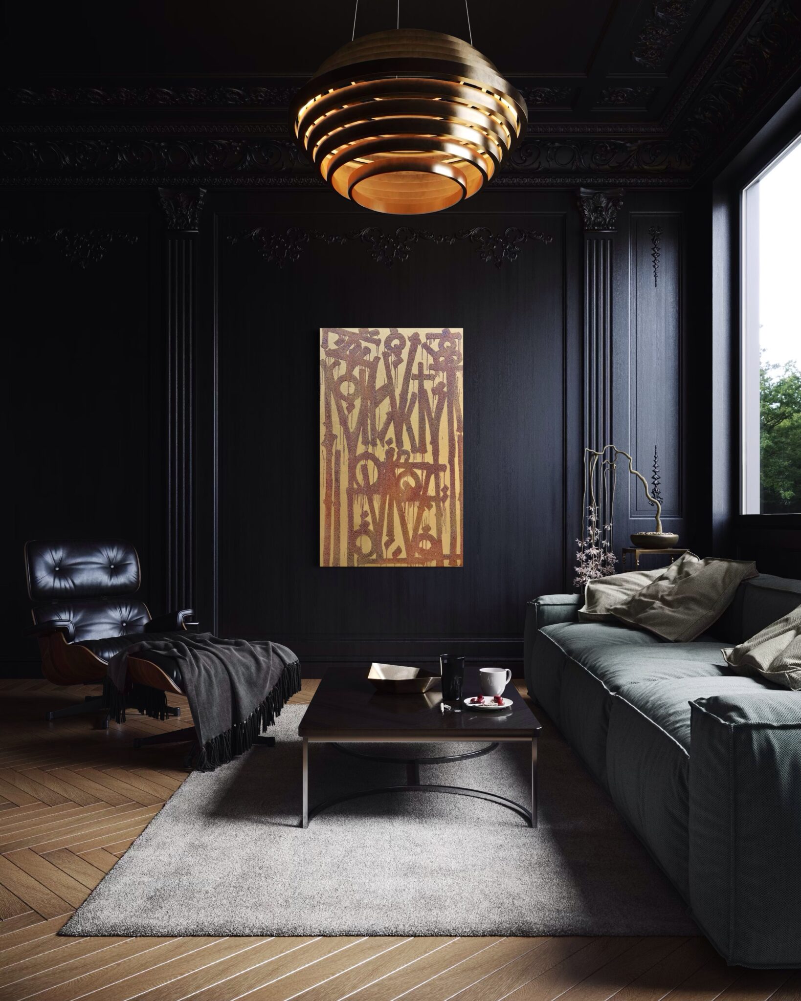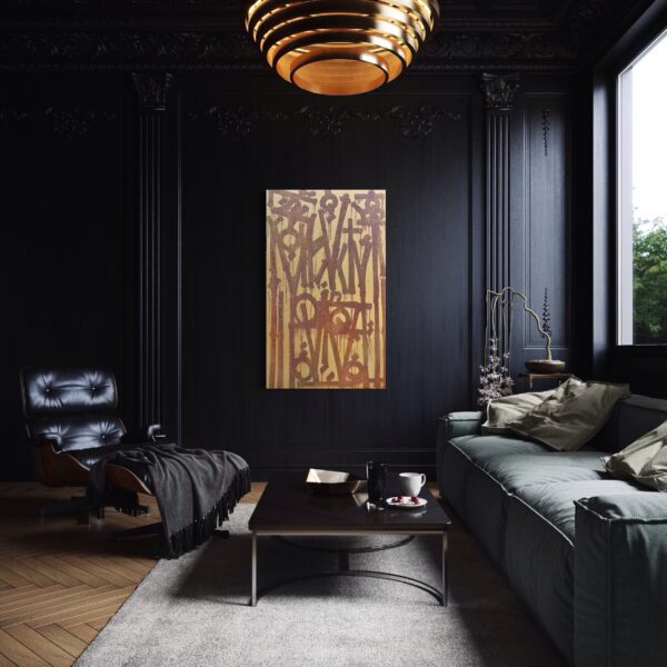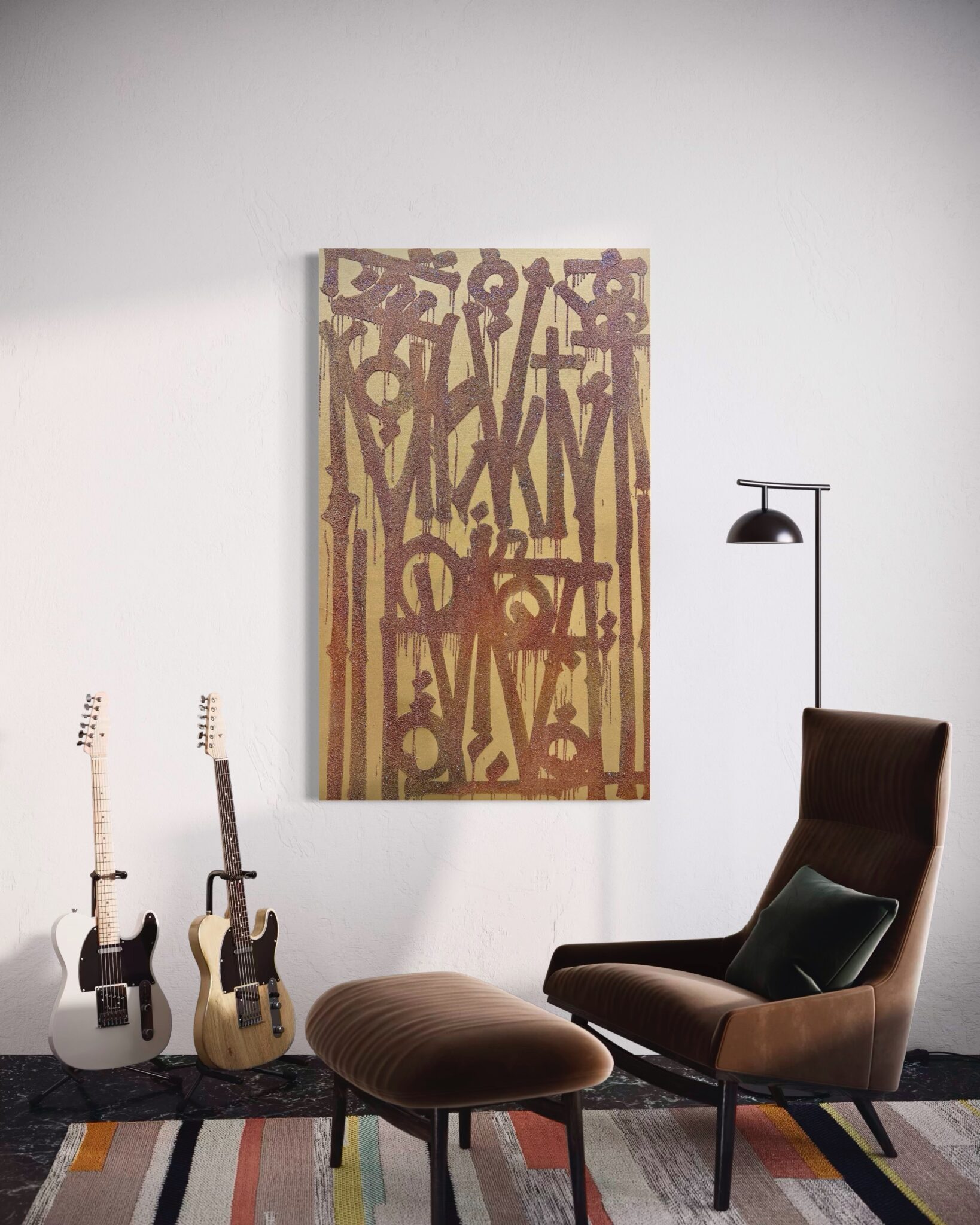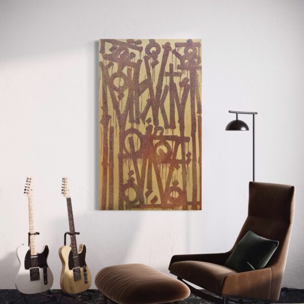 The vertical arrangement of symbols evokes the structure of a sacred scroll or ancient manuscript, while expressive drips and raw textures ground the piece in the visual language of graffiti and street art. Rather than conveying literal meaning, RETNA’s script functions as a rhythmic pattern—a visual mantra that embodies memory, identity, and movement.