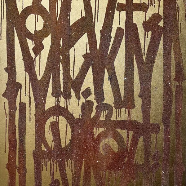 Golden Dreams by RETNA is a powerful example of contemporary urban art fused with spiritual symbolism. Painted in rich rust enamel over a lustrous gold background, this mixed media artwork features RETNA’s signature calligraphic script—an abstract fusion of global writing systems including Arabic, Hebrew, and Gothic letterforms. Glitter embedded in the surface adds a tactile shimmer, creating a dynamic interplay between opulence and street-born grit.
