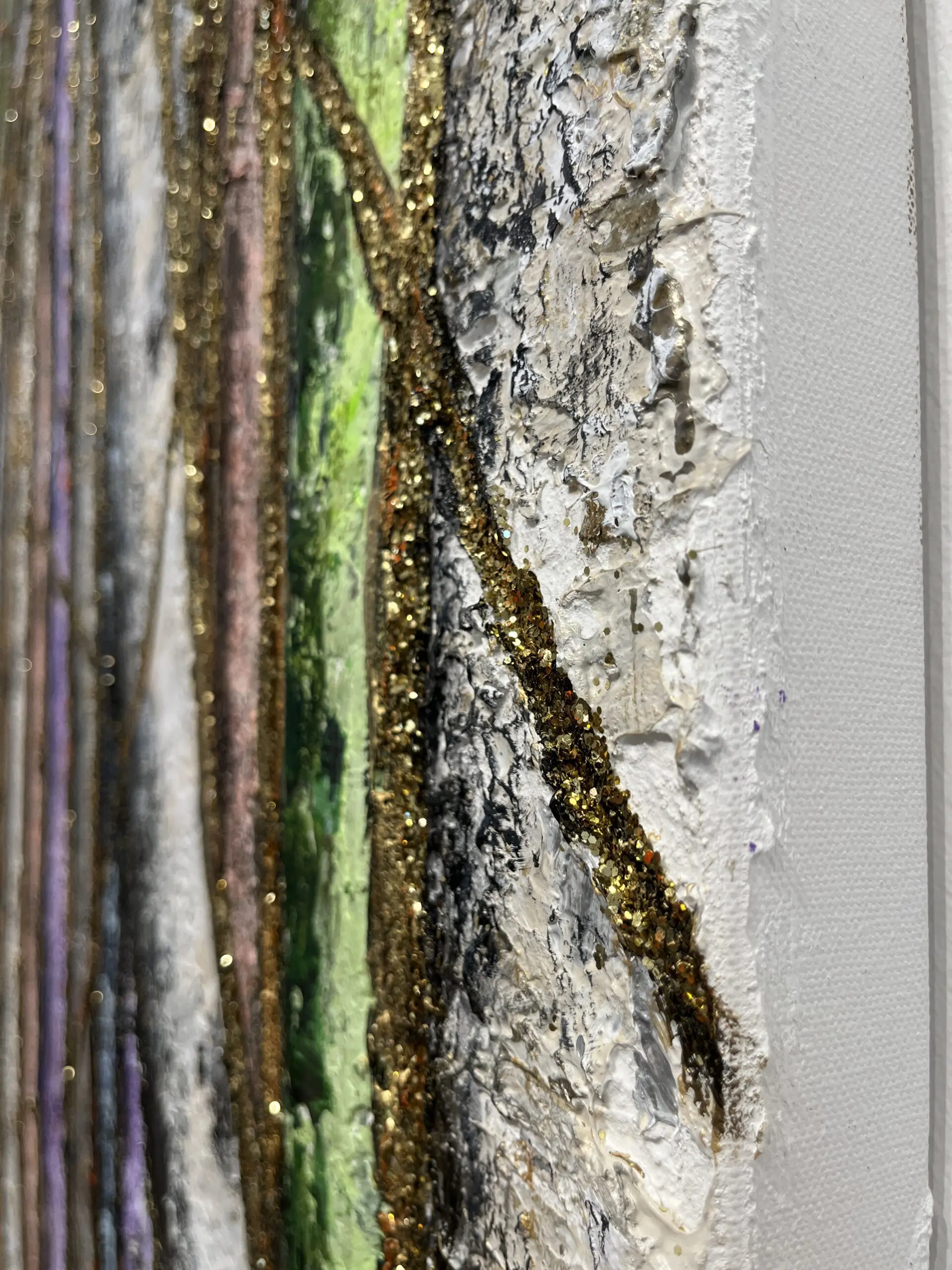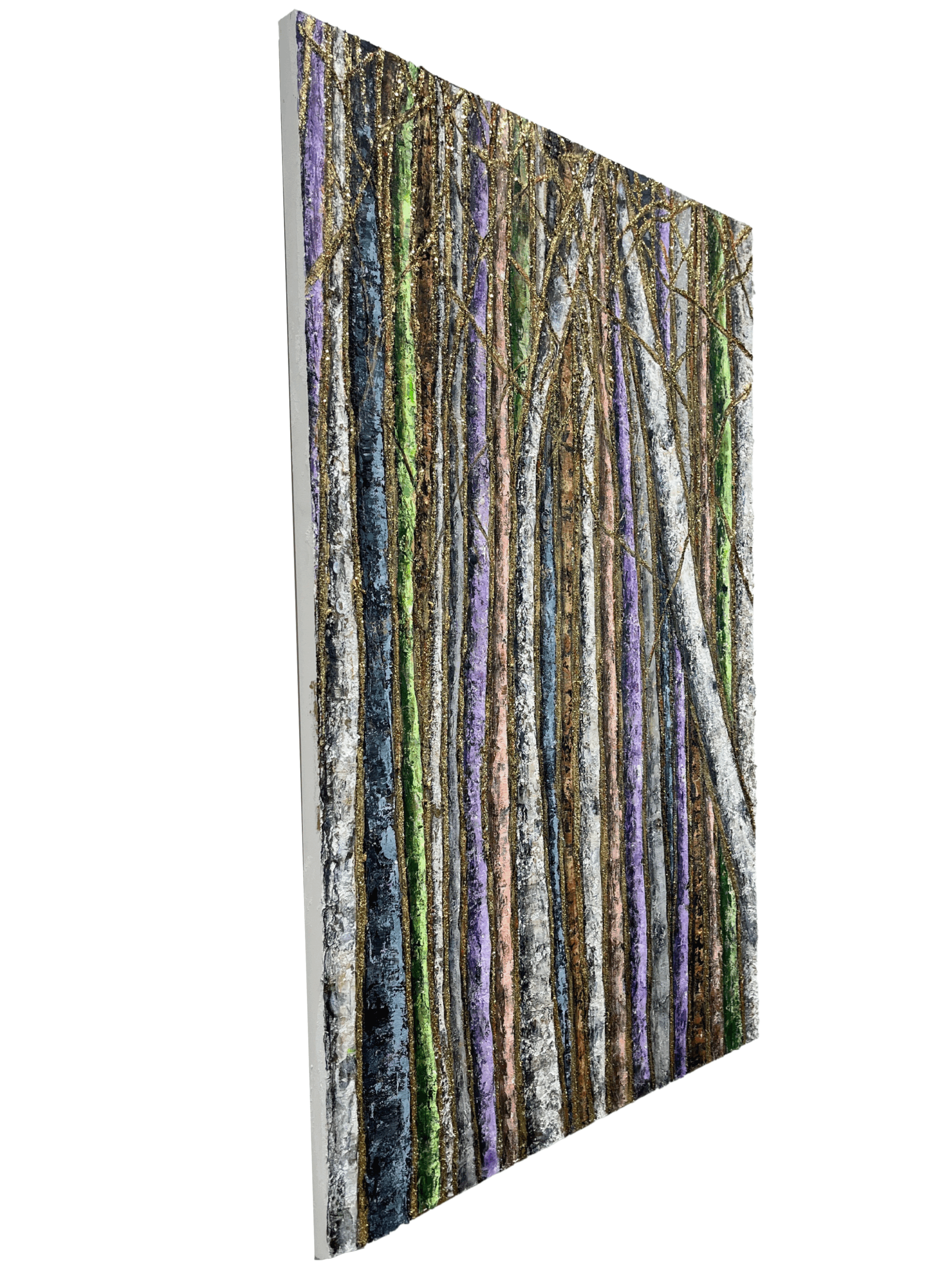 The combination of organic textures and metallic highlights makes “Golden Thread” a compelling blend of nature and luxury. The thick, sculptural paint application enhances the tactile quality of the bark, while the gold detailing provides contrast against the subdued background tones. Hints of green and deep violet peek through, suggesting the quiet transformation of seasons or the way light filters through a dense woodland.