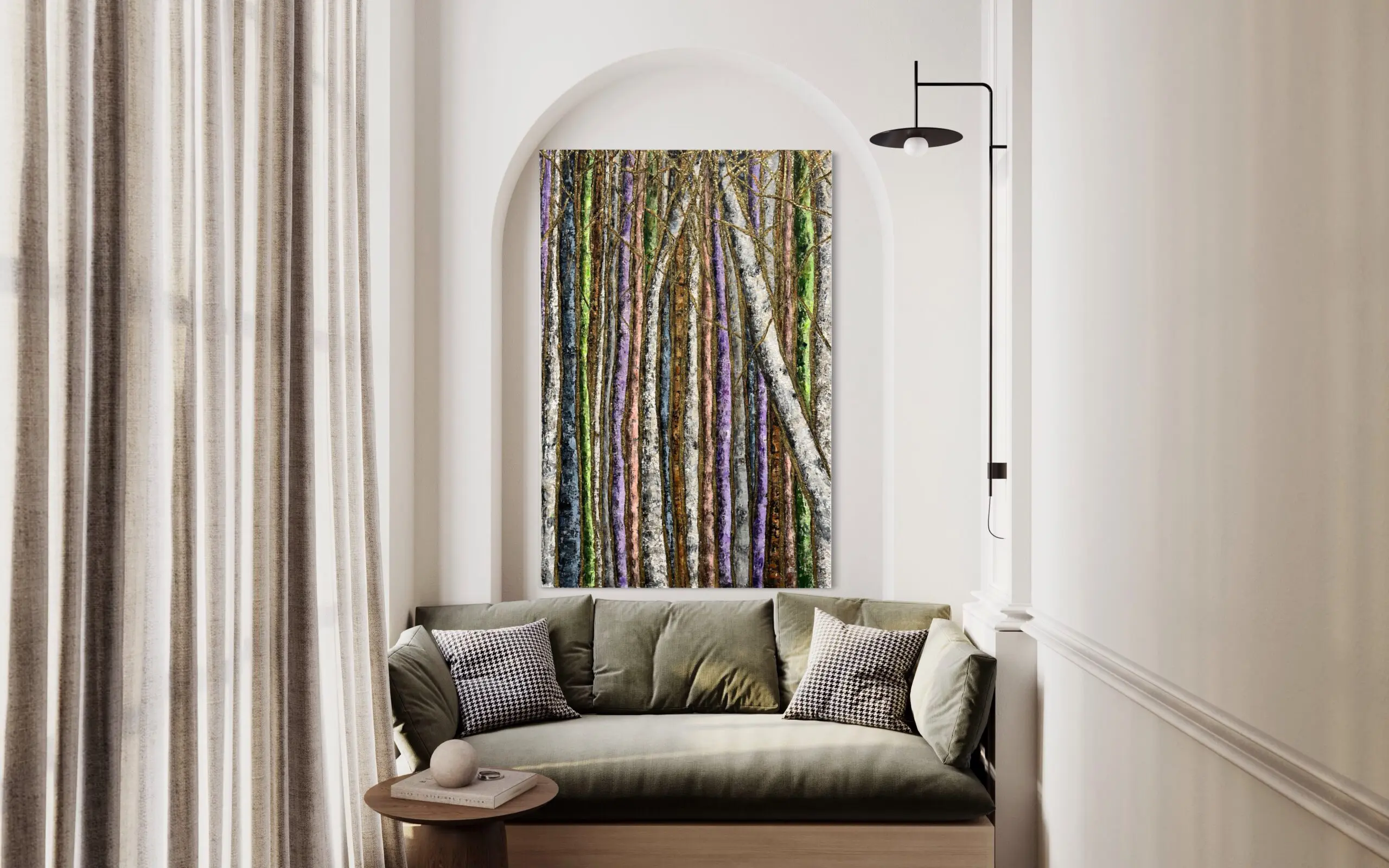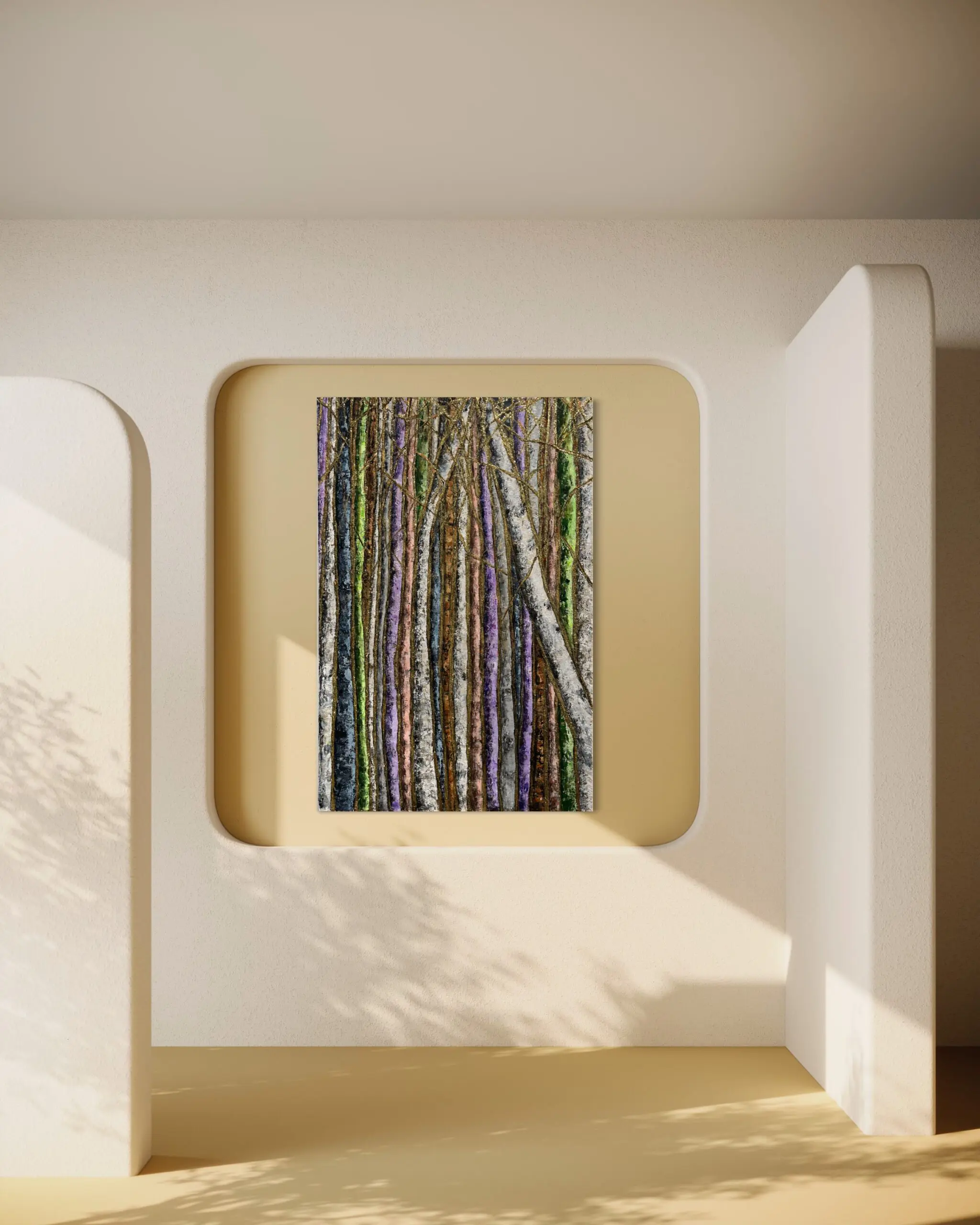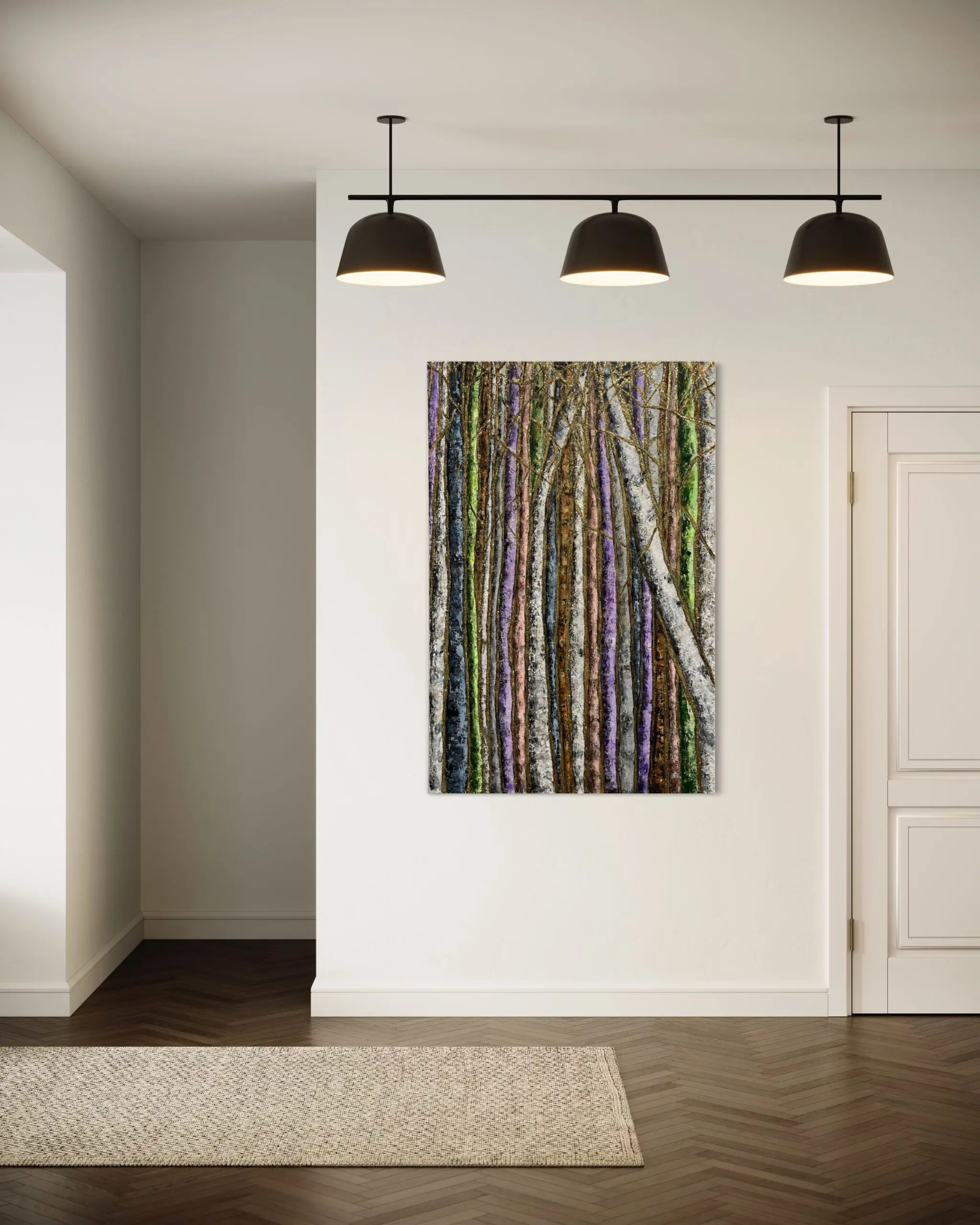 Haleh Mashian’s “Golden Thread” weaves together texture, movement, and color to create a forest scene that radiates warmth and depth. Tall, slender tree trunks in earthy browns, soft grays, and muted lavenders form a natural pattern, their vertical lines intersected by delicate golden accents. These shimmering threads run through the composition, adding an element of refinement that catches the light, giving the piece a dynamic, layered effect.