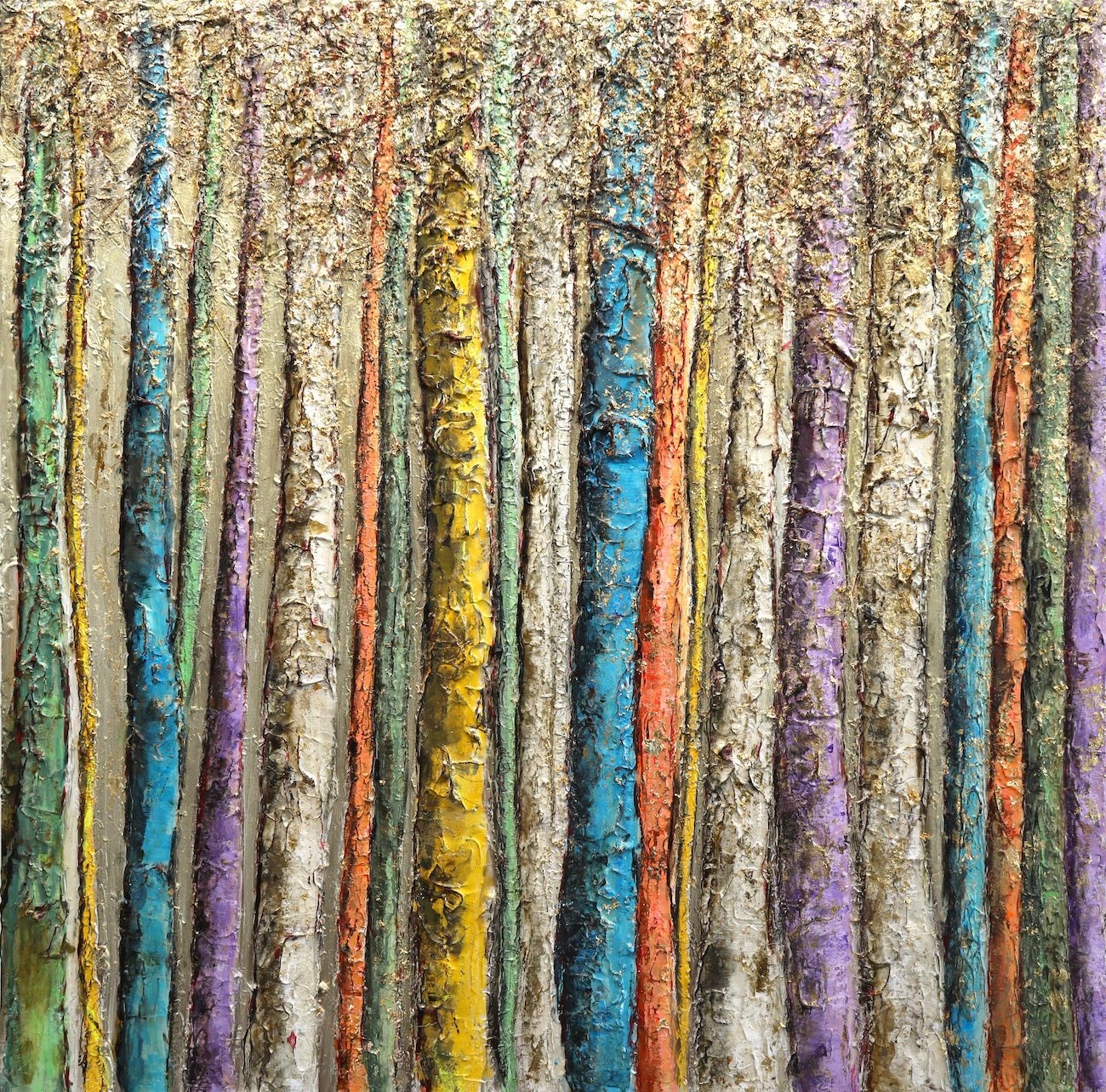 This artwork represents a dreamlike kaleidoscopic forest, where each tree trunk is adorned with vibrant and contrasting colors. The use of layered hues, such as yellow, blue, orange, and more, creates a soft and inviting visual effect. The continuous theme of metallic gold adds a touch of glamour and sophistication to the piece. The artwork’s textured layers and vibrant colors come together to form a beautiful and visually striking scene.