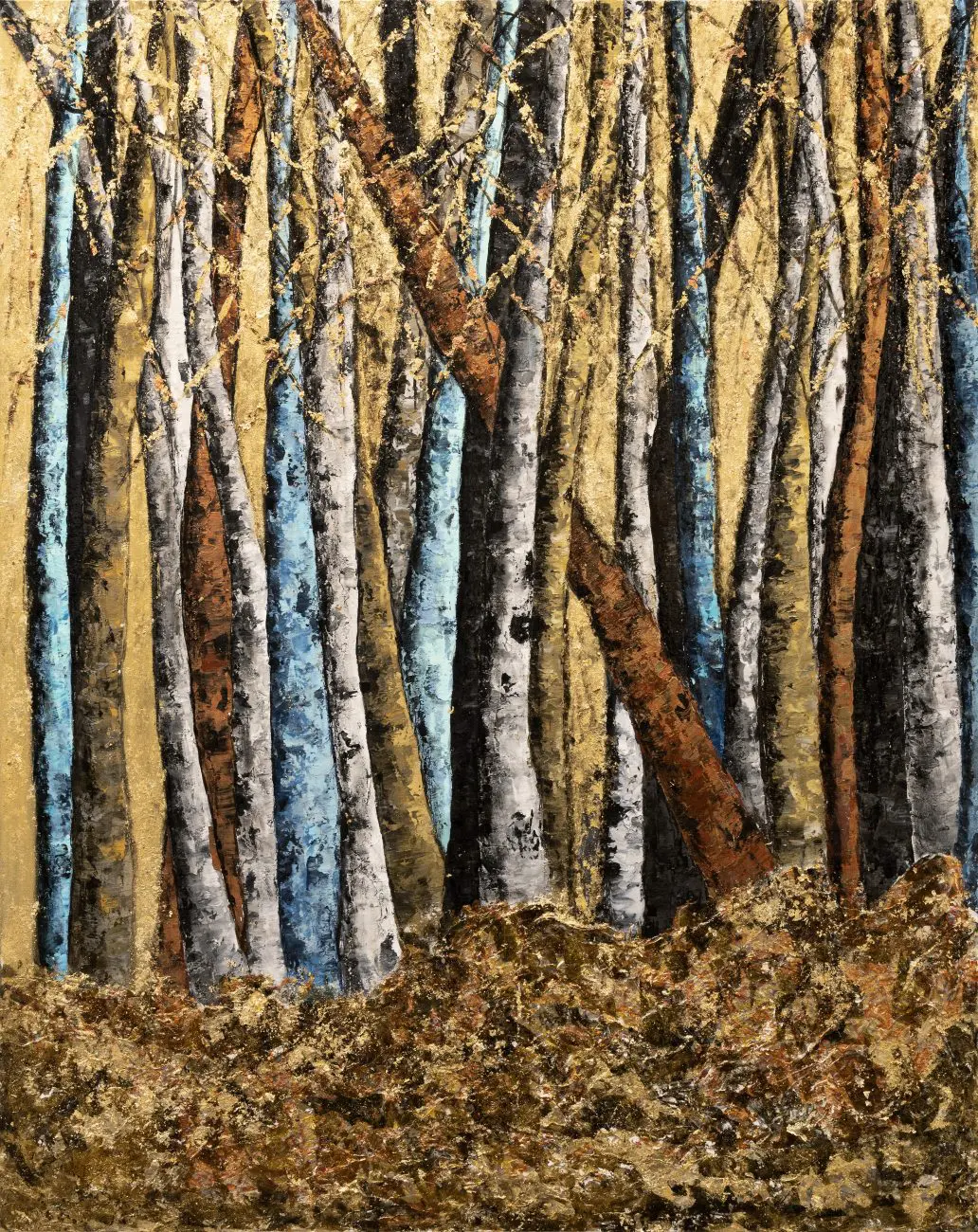 Through bold, gestural strokes and intricate layering, Mashian brings depth and movement to the canvas. The trees, rendered in shades of white, black, and sienna, rise against a backdrop of cool cerulean blues and shimmering gold leaf accents, evoking a sense of timeless beauty.