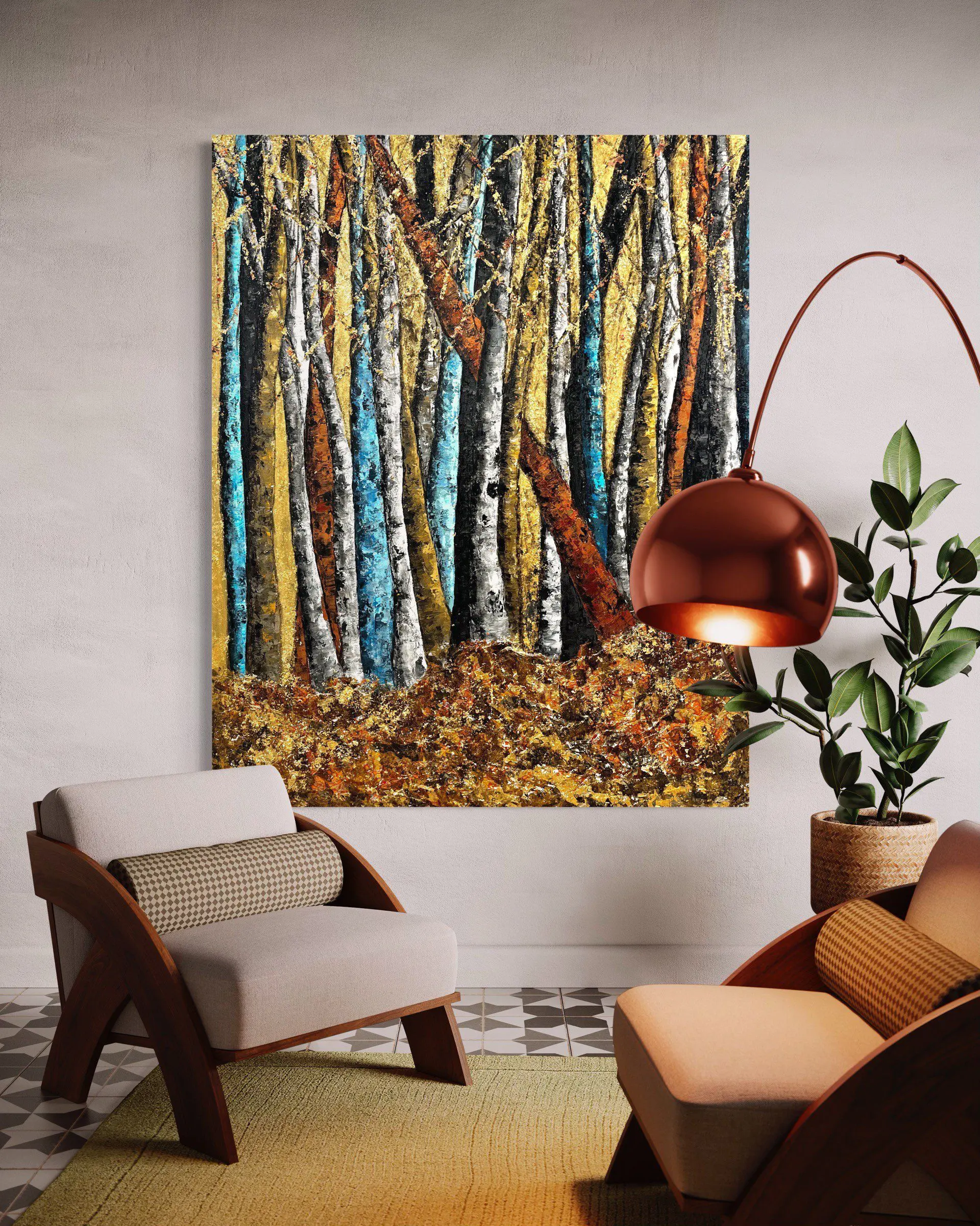 The dimensionality of the piece, achieved through thick applications of pigment and sculptural relief work, gives the impression of a tactile, living forest. The textured bark and layered gold create a sense of tangible luxury, making this painting as much about physicality as it is about visual storytelling. Its fusion of earthy warmth and metallic opulence makes it an ideal focal point for spaces that embrace modern elegance, organic textures, and high-end aesthetics.