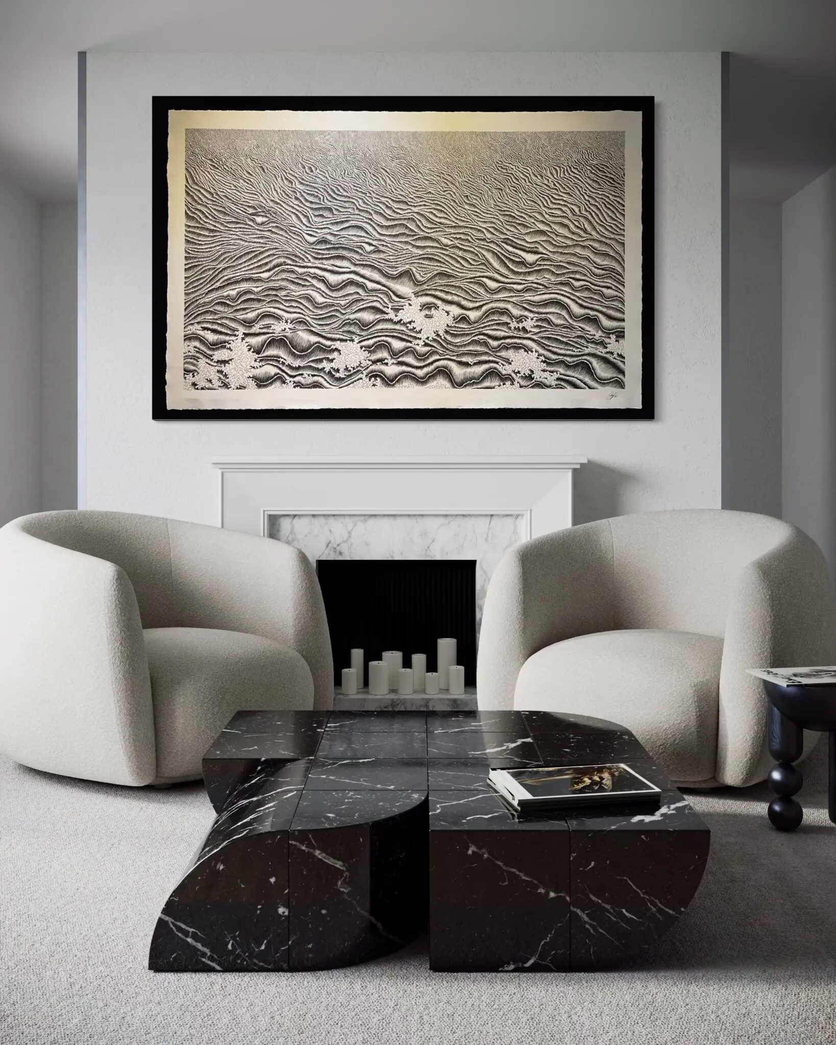 Rice’s drawing practice, rooted in repetition and endurance, is both meditative and corporeal. The undulating textures of Gratitude feel alive, vibrating with an internal rhythm that mirrors natural forces—tides, wind, erosion, even breath. Yet the work never lapses into chaos. Instead, it balances control and surrender, offering a visual meditation on the complexity of simplicity. There is a generosity in her process, an offering of time and attention that transforms the surface into something devotional.