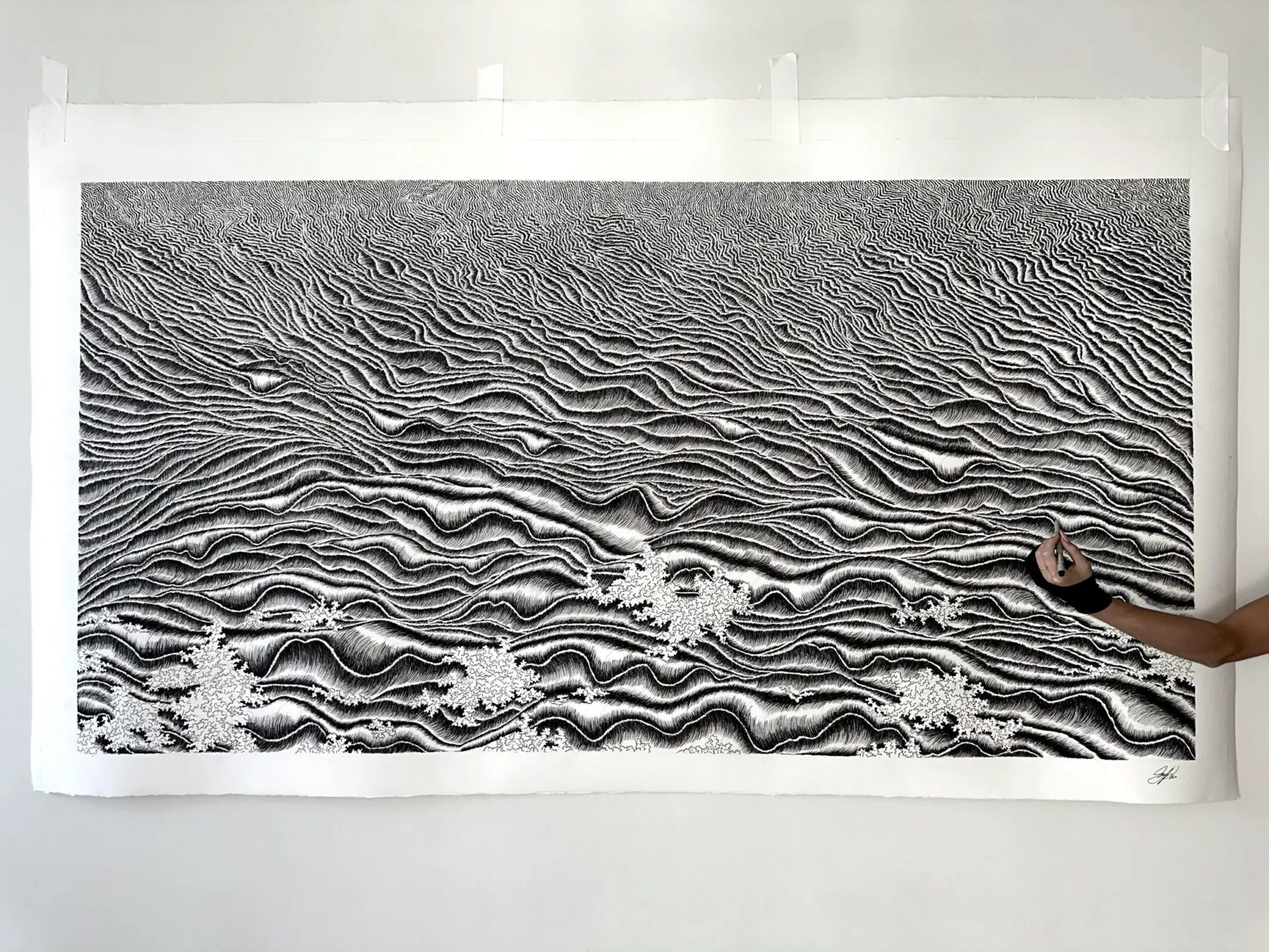 In Gratitude, Sarah Rice renders the intangible with obsessive clarity. What appears at first as an expansive terrain—perhaps an aerial landscape, a shifting seascape, or magnified skin—gradually reveals itself as something less literal and more sensory. Composed entirely of hand-drawn ink lines, the work breathes with quiet intensity, each mark an act of presence, discipline, and release.