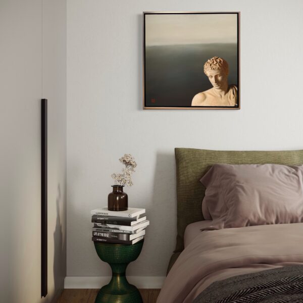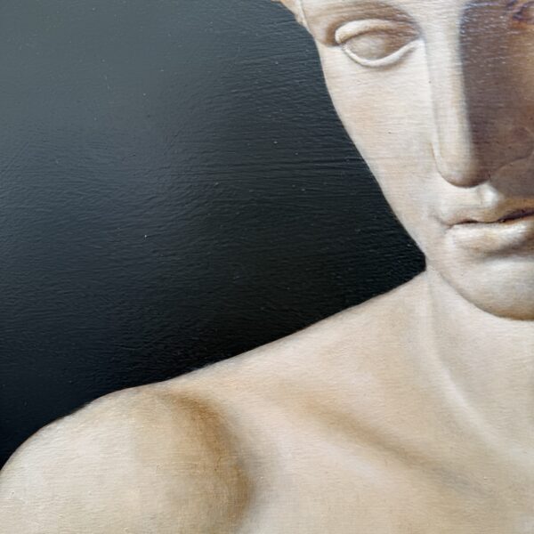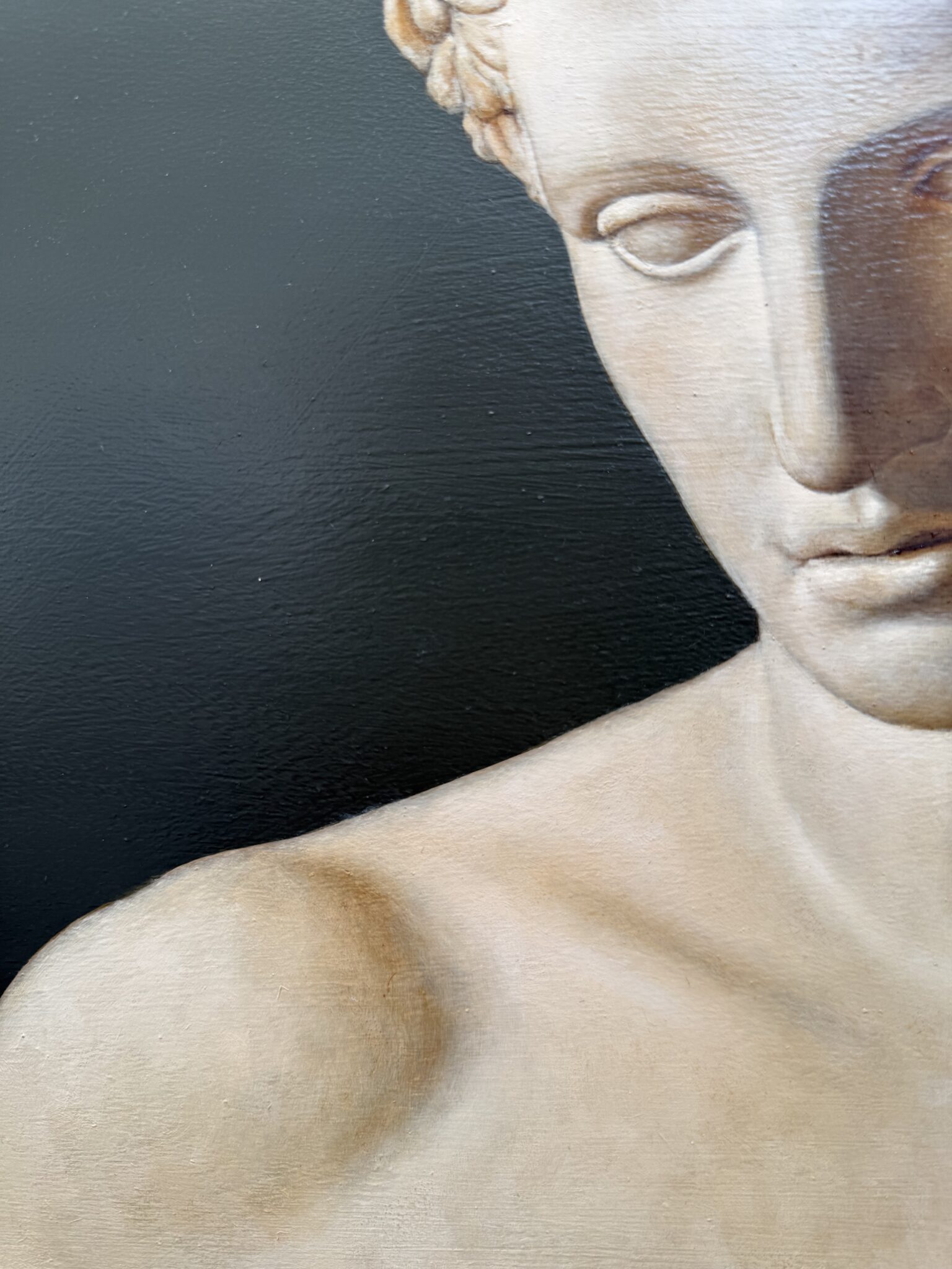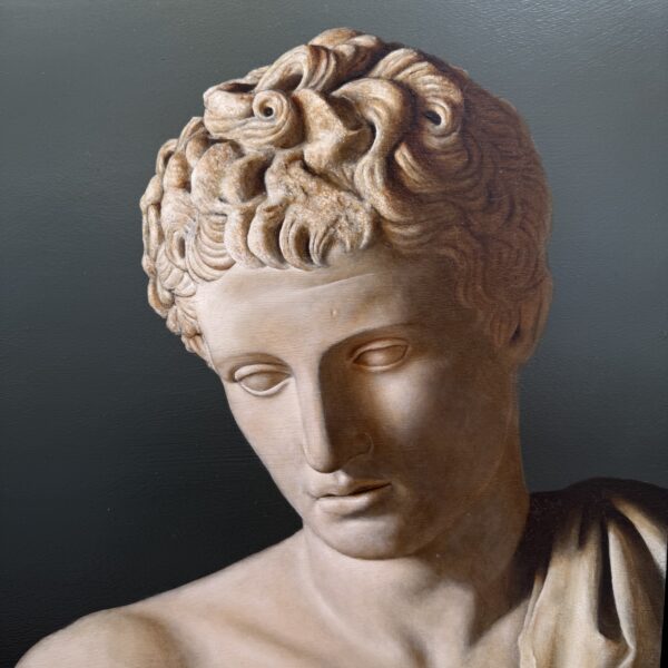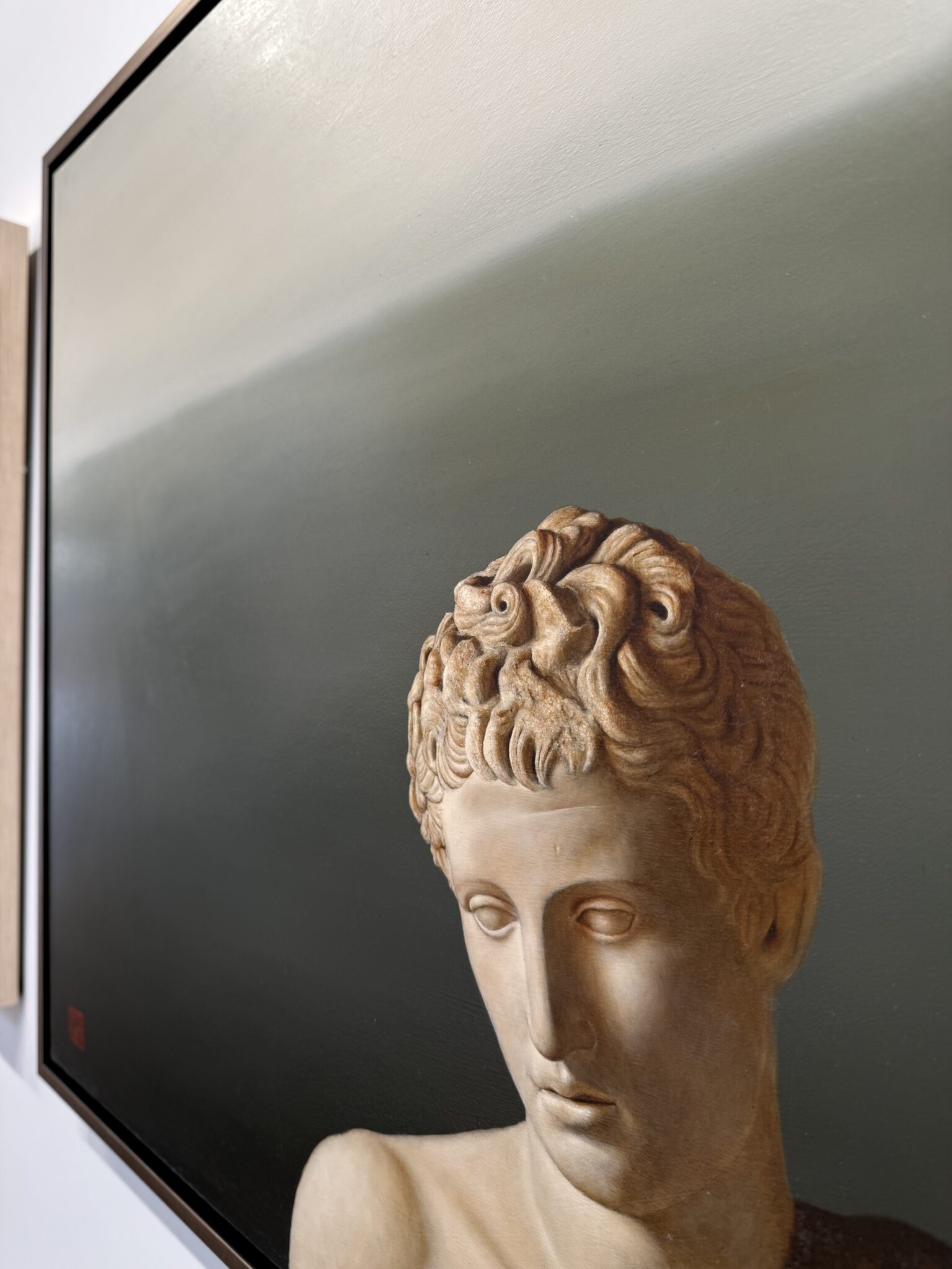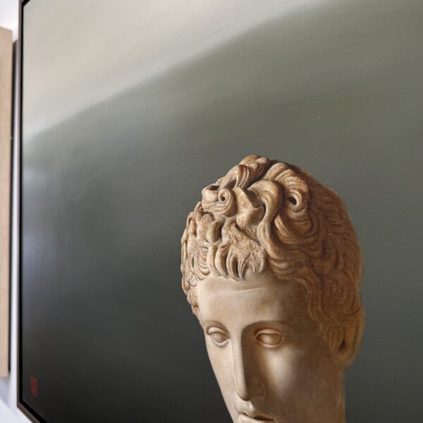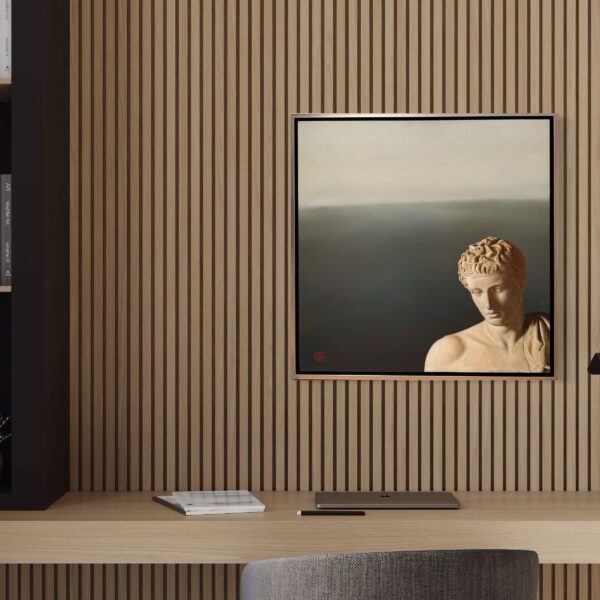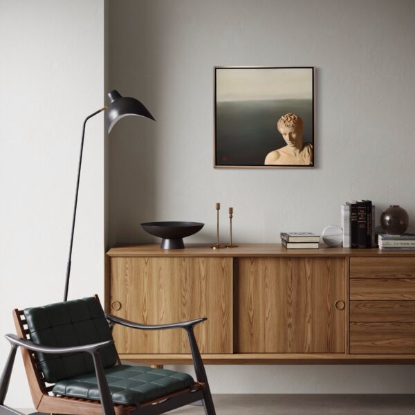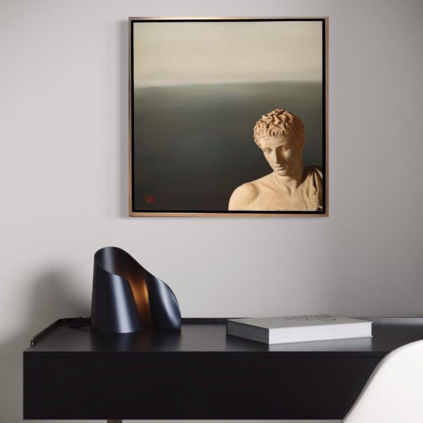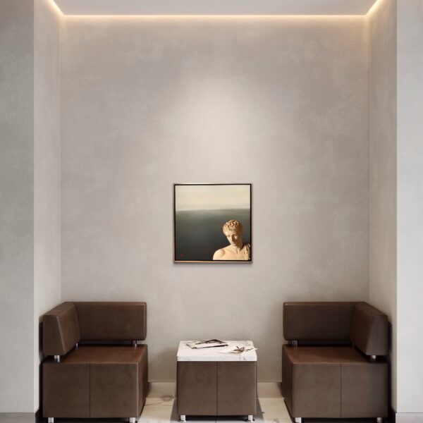 By blending the timeless elegance of Greek sculpture with the meditative vastness of the horizon, “Green Horizon” invites viewers into a space of serenity and reflection. This work is ideal for collectors of contemporary figurative art, mythology-inspired paintings, and realistic oil on canvas works that bridge classical antiquity and modern sensibility.