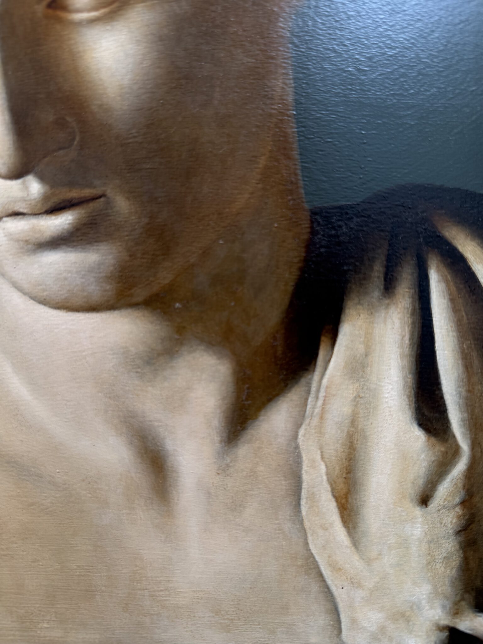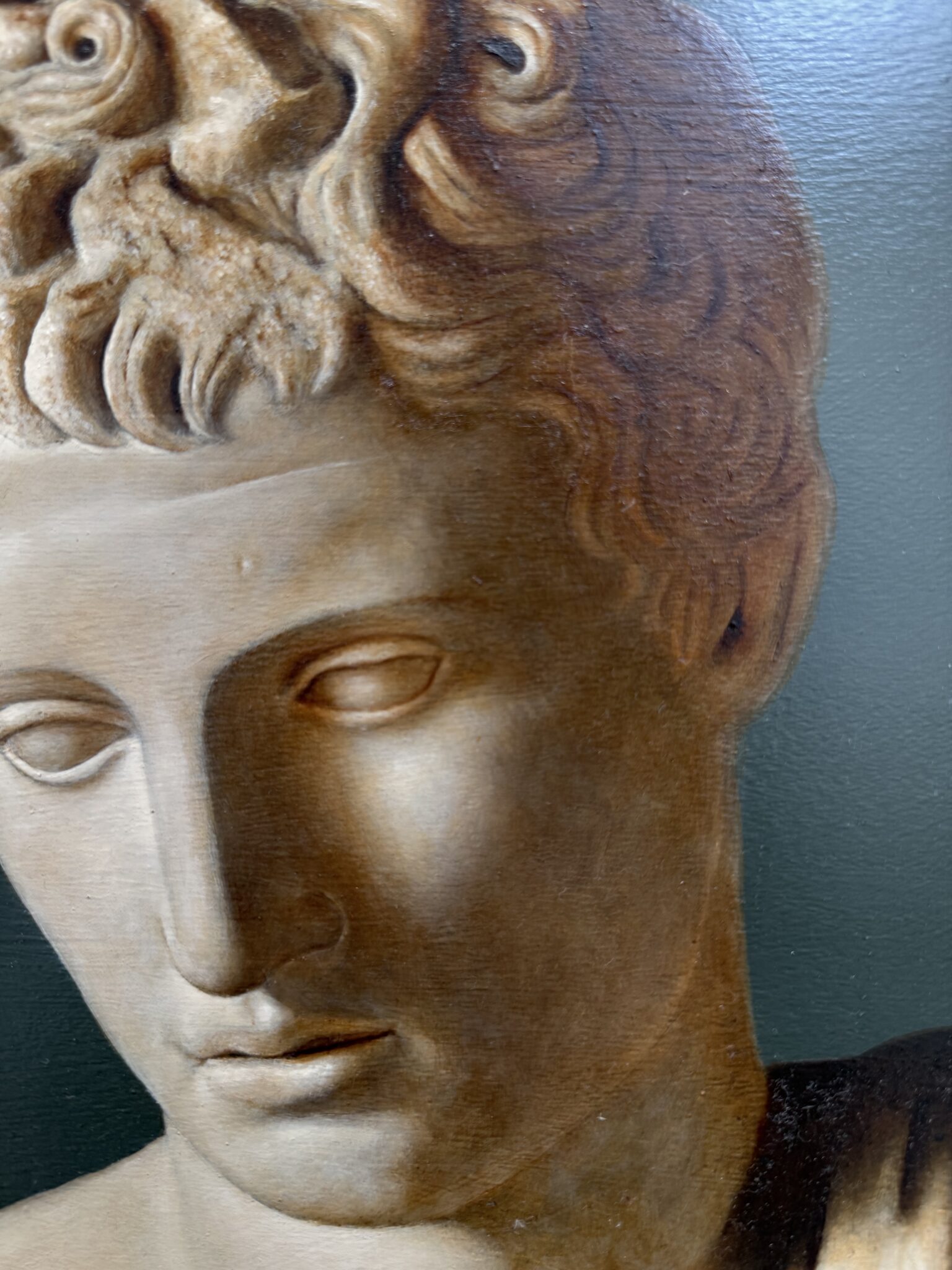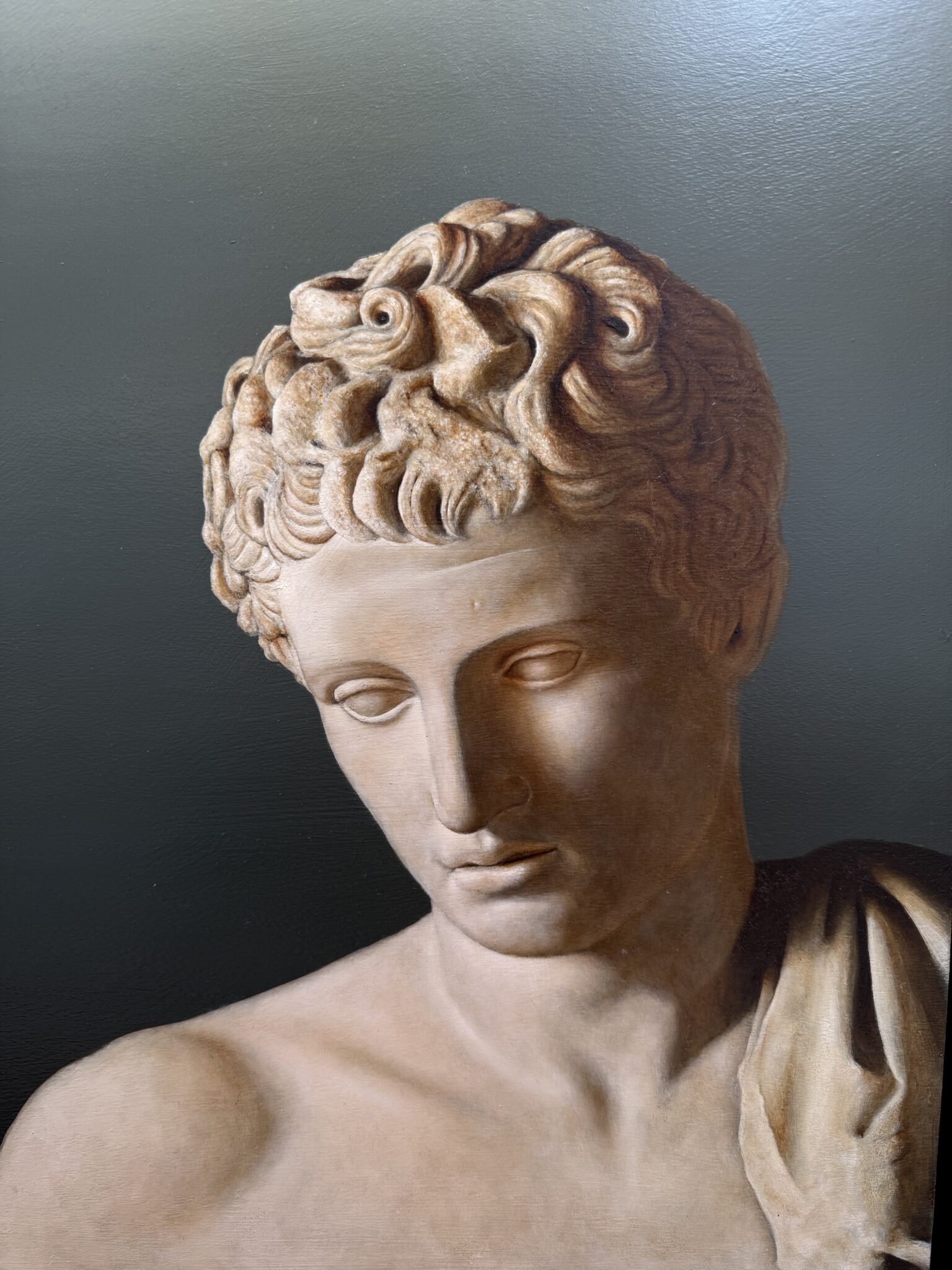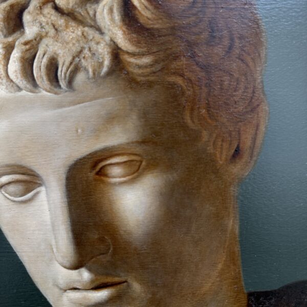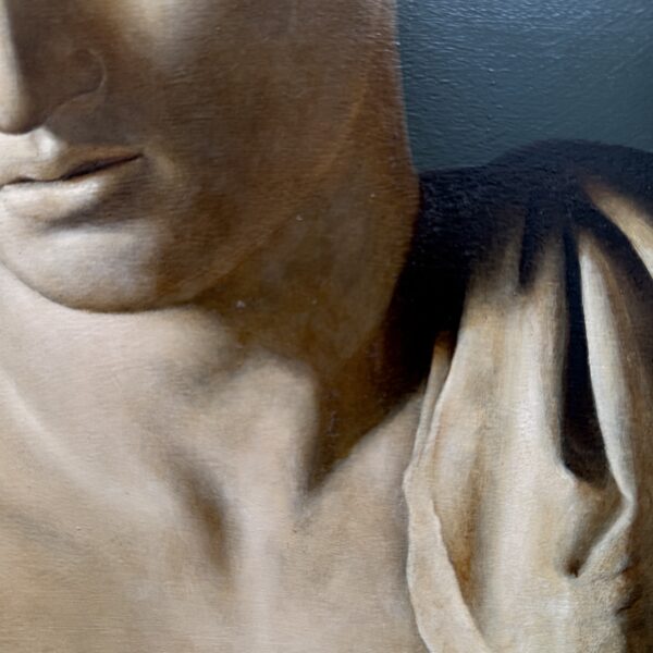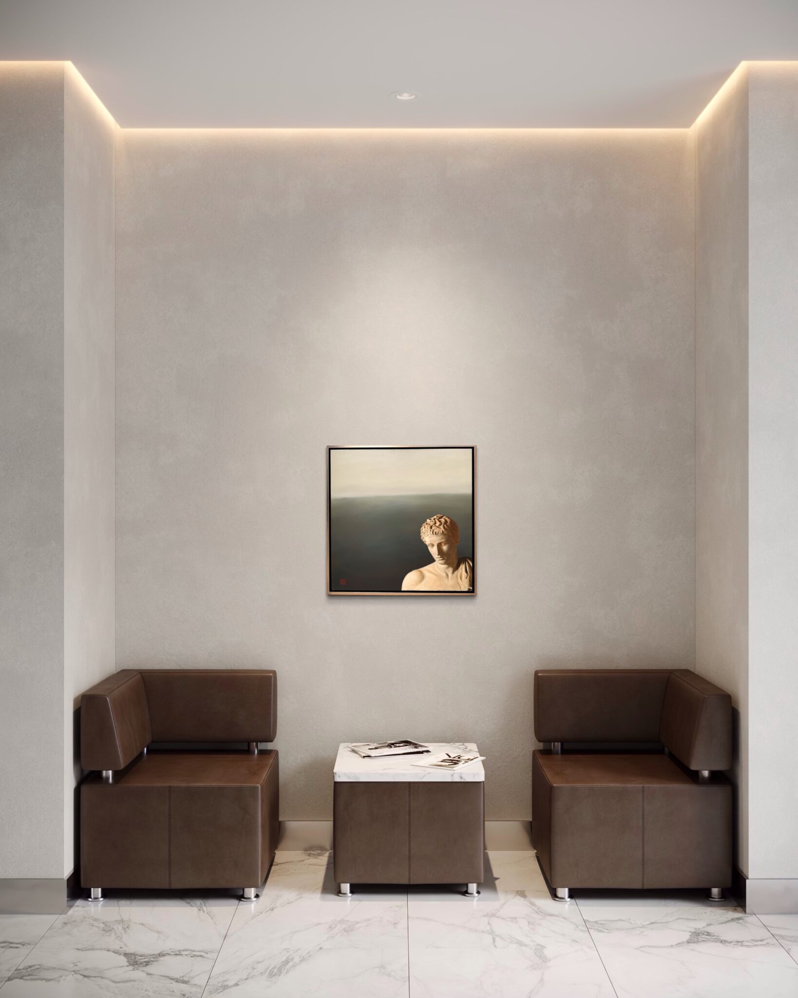By blending the timeless elegance of Greek sculpture with the meditative vastness of the horizon, “Green Horizon” invites viewers into a space of serenity and reflection. This work is ideal for collectors of contemporary figurative art, mythology-inspired paintings, and realistic oil on canvas works that bridge classical antiquity and modern sensibility.