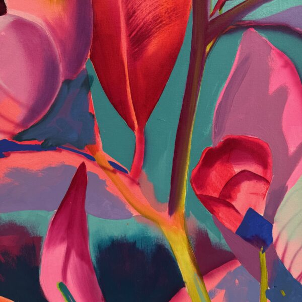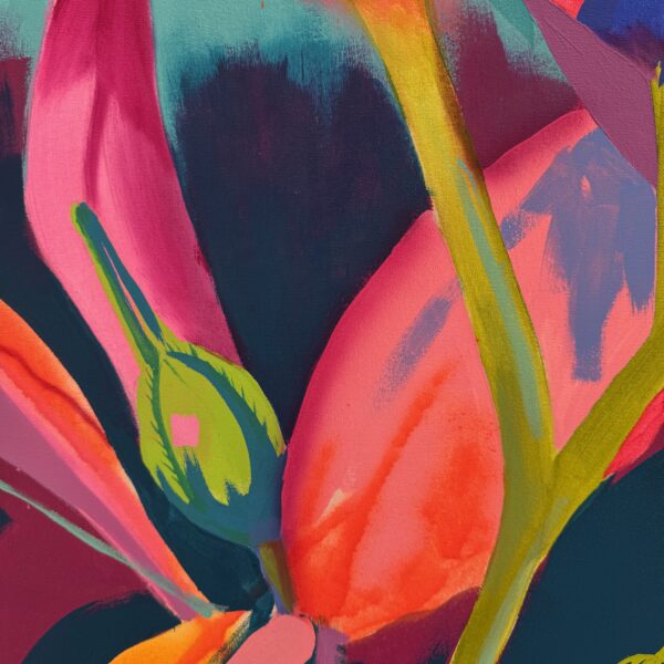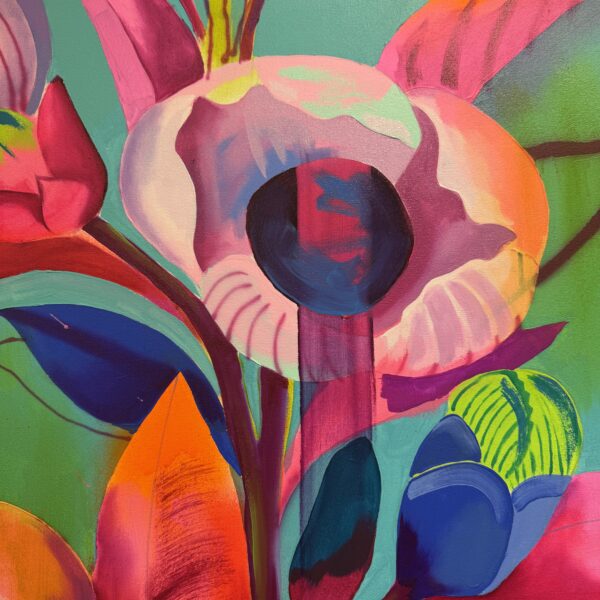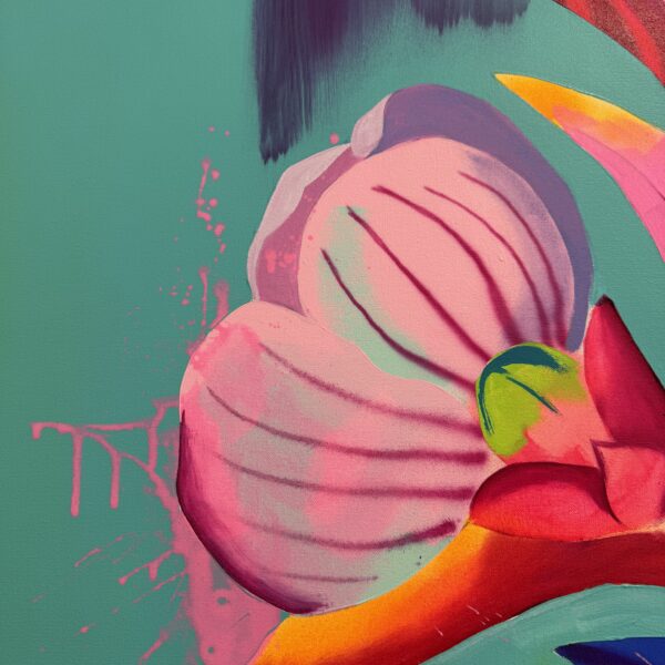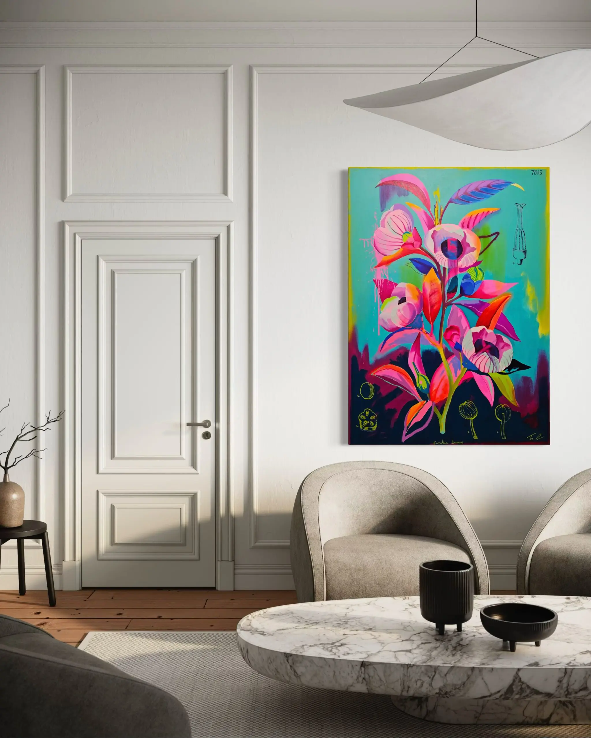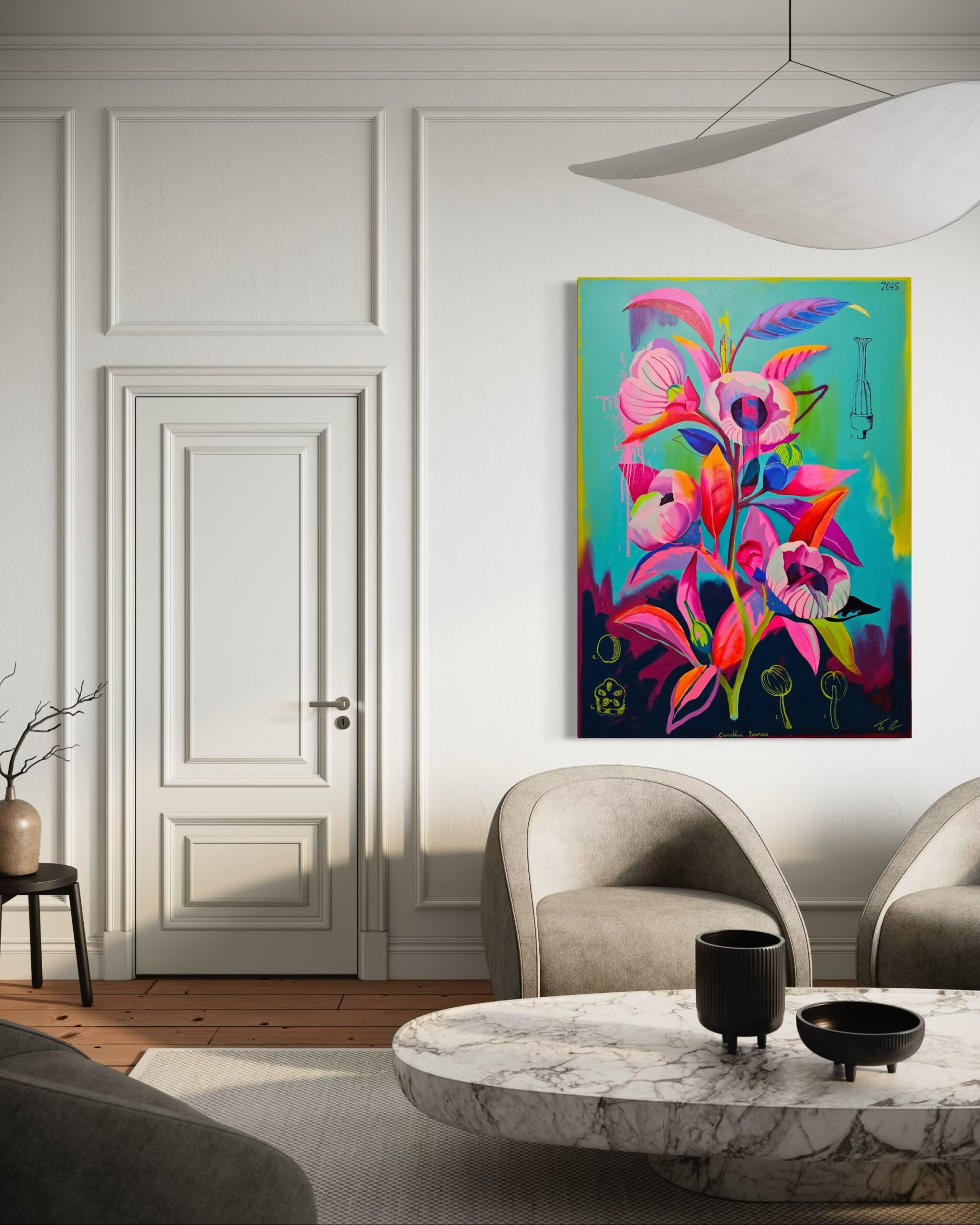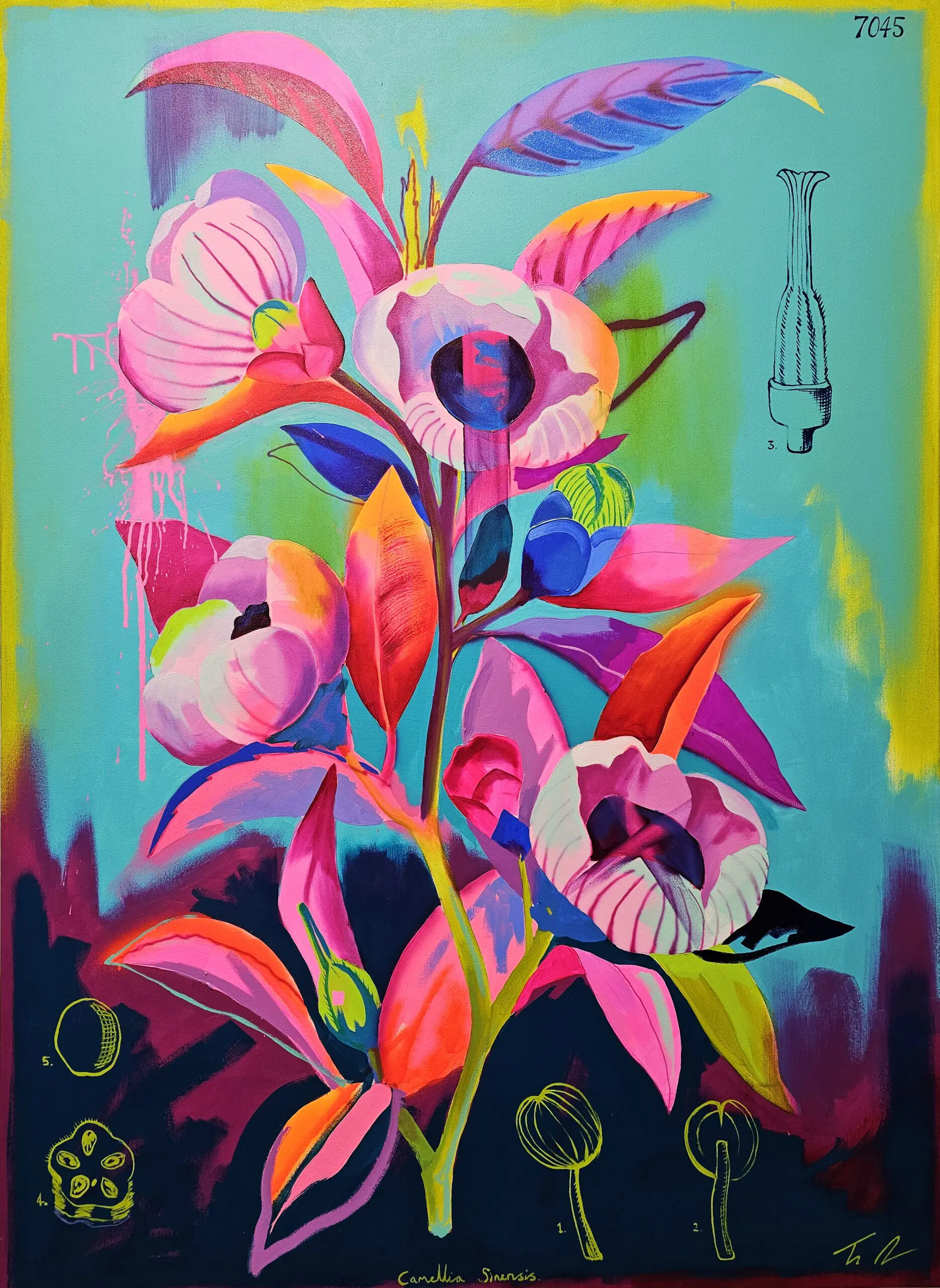 Fowler’s “Green Tea” is a vivid, electrified reimagining of botanical illustration, where the organic world is transformed into a pulsating explosion of color, abstraction, and surreal energy. Inspired by the namesake tea plant, Fowler’s work transcends traditional scientific botanical studies, infusing them with contemporary neon surrealism and expressive painterly gestures.