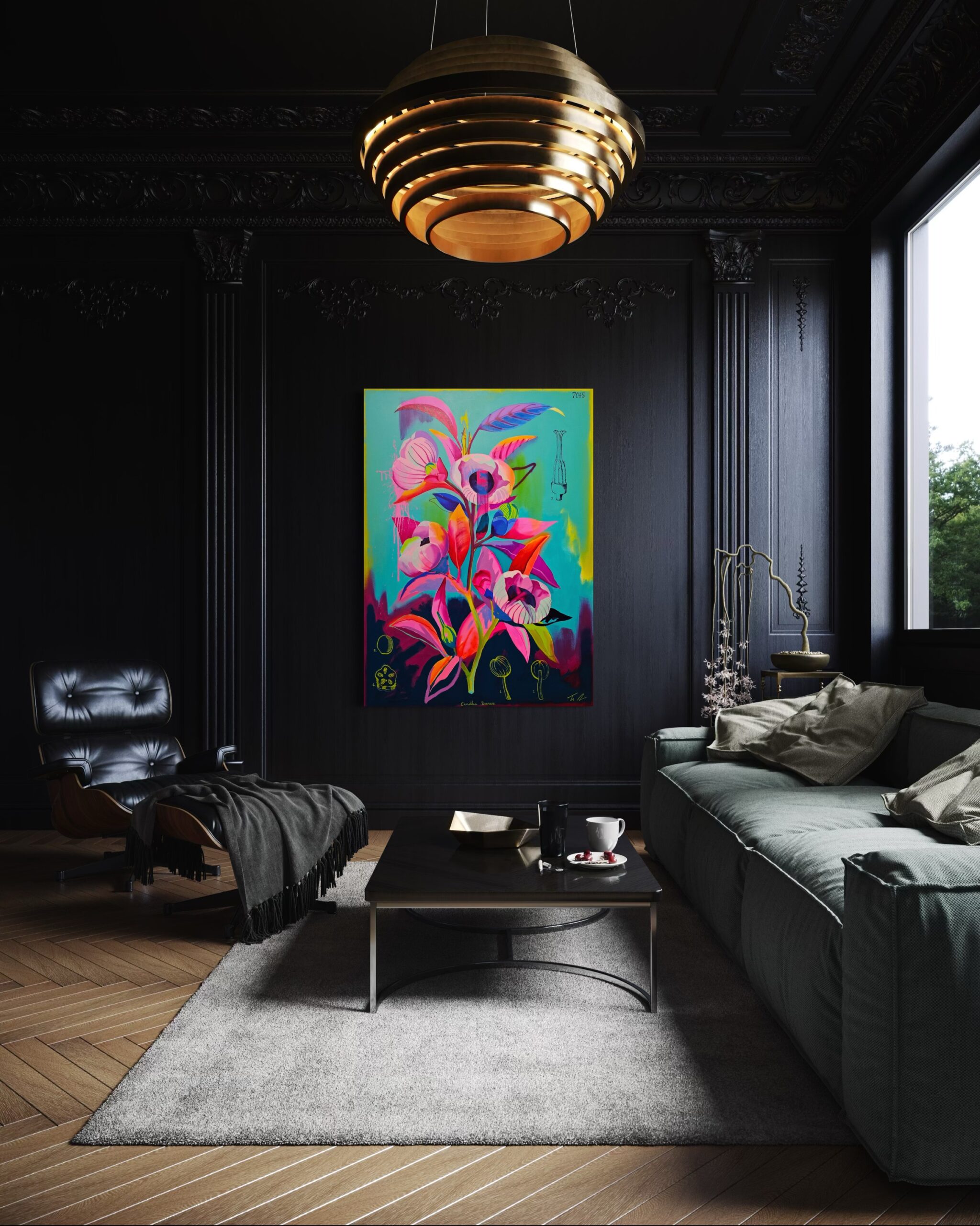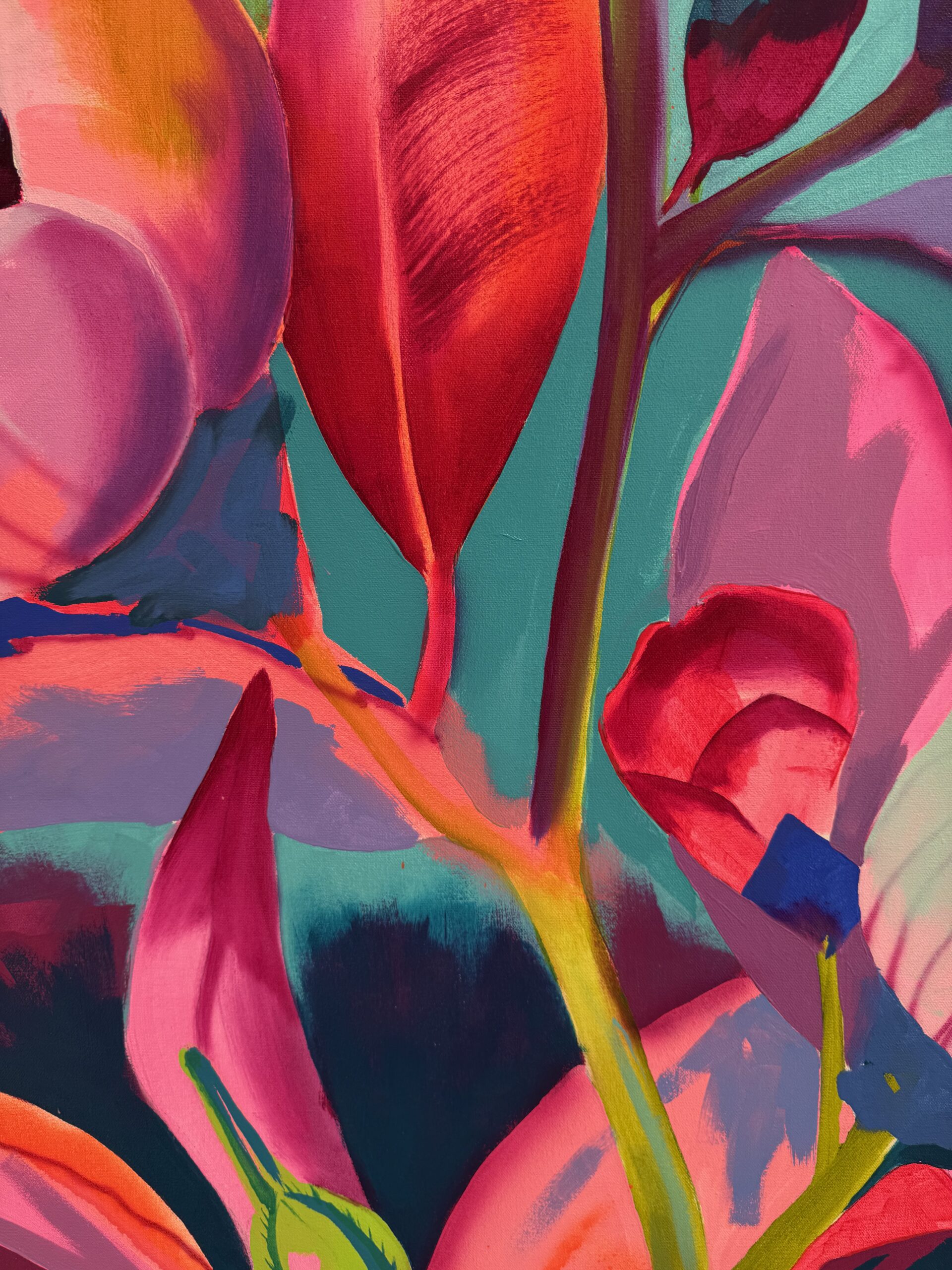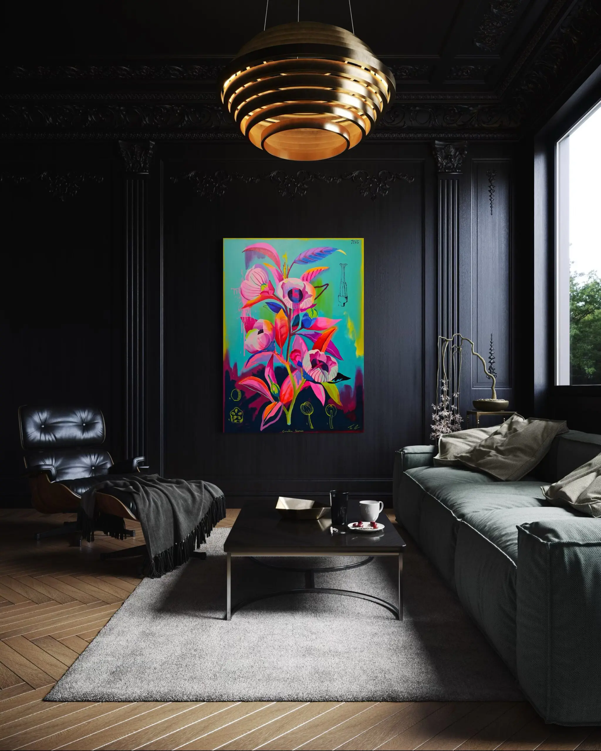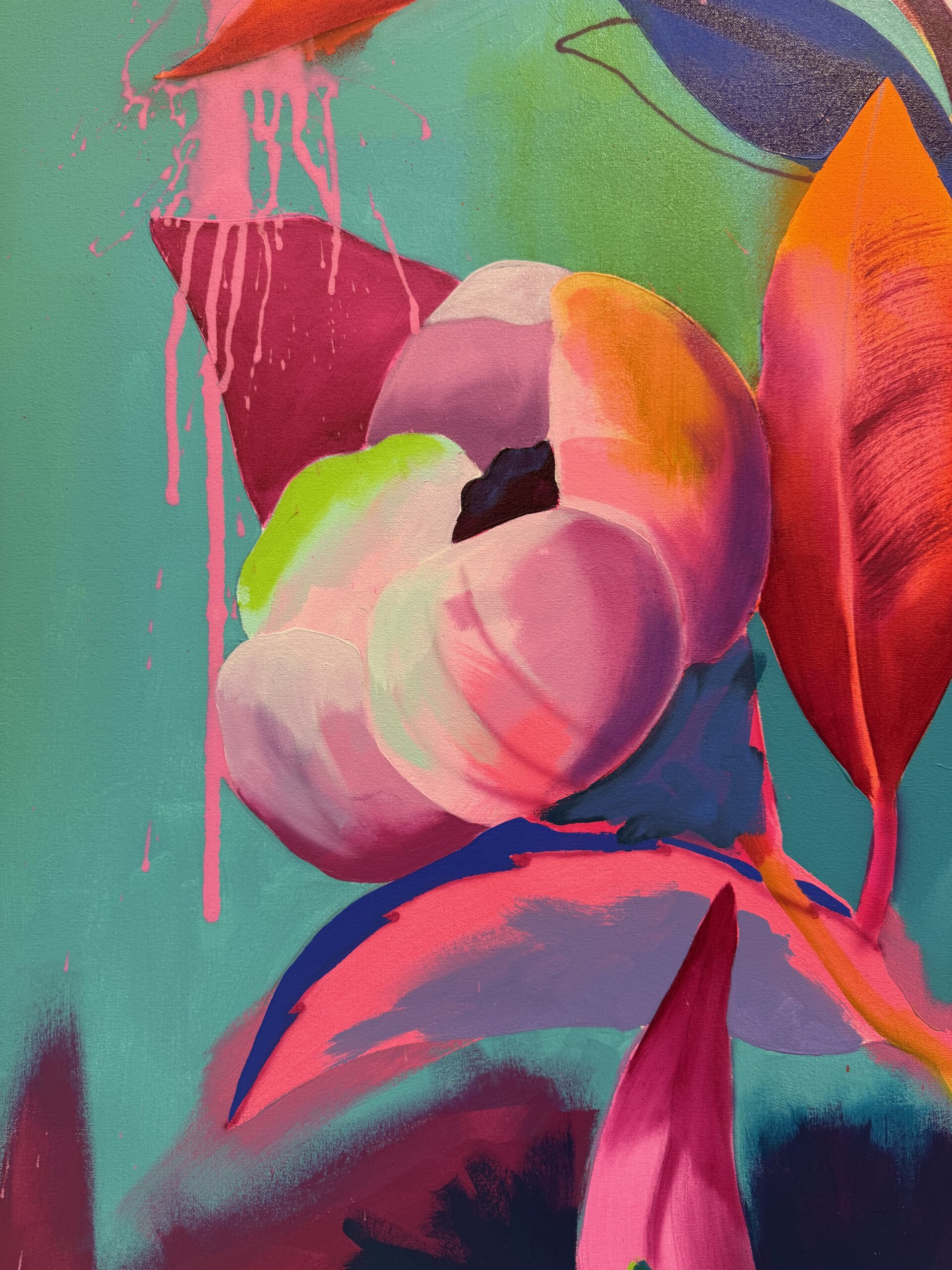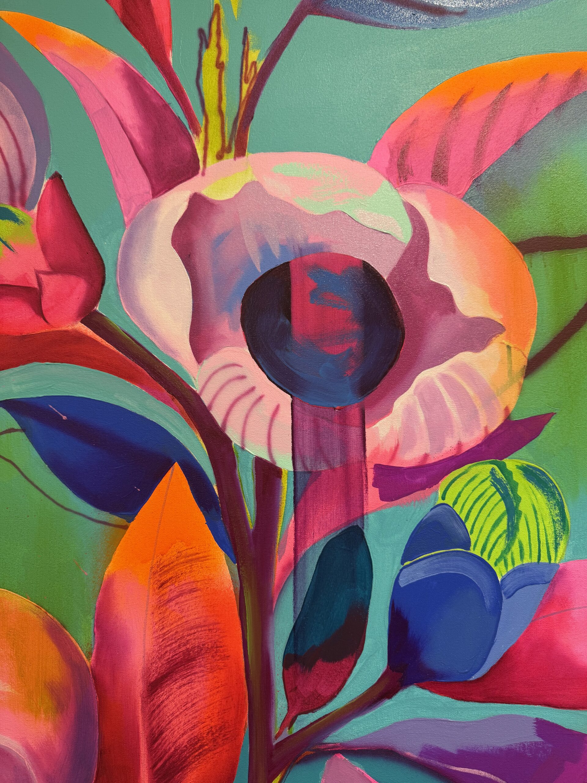 Fowler’s “Green Tea” is a vivid, electrified reimagining of botanical illustration, where the organic world is transformed into a pulsating explosion of color, abstraction, and surreal energy. Inspired by the namesake tea plant, Fowler’s work transcends traditional scientific botanical studies, infusing them with contemporary neon surrealism and expressive painterly gestures.
