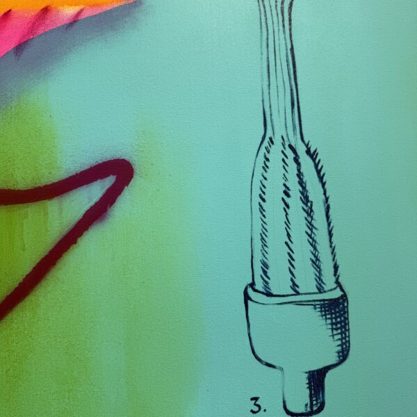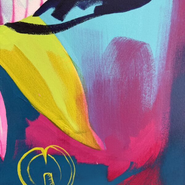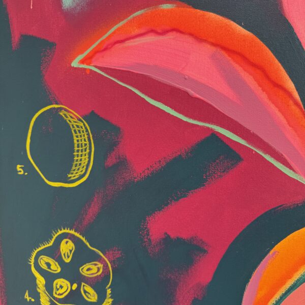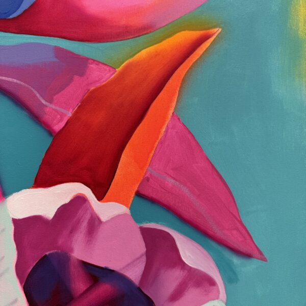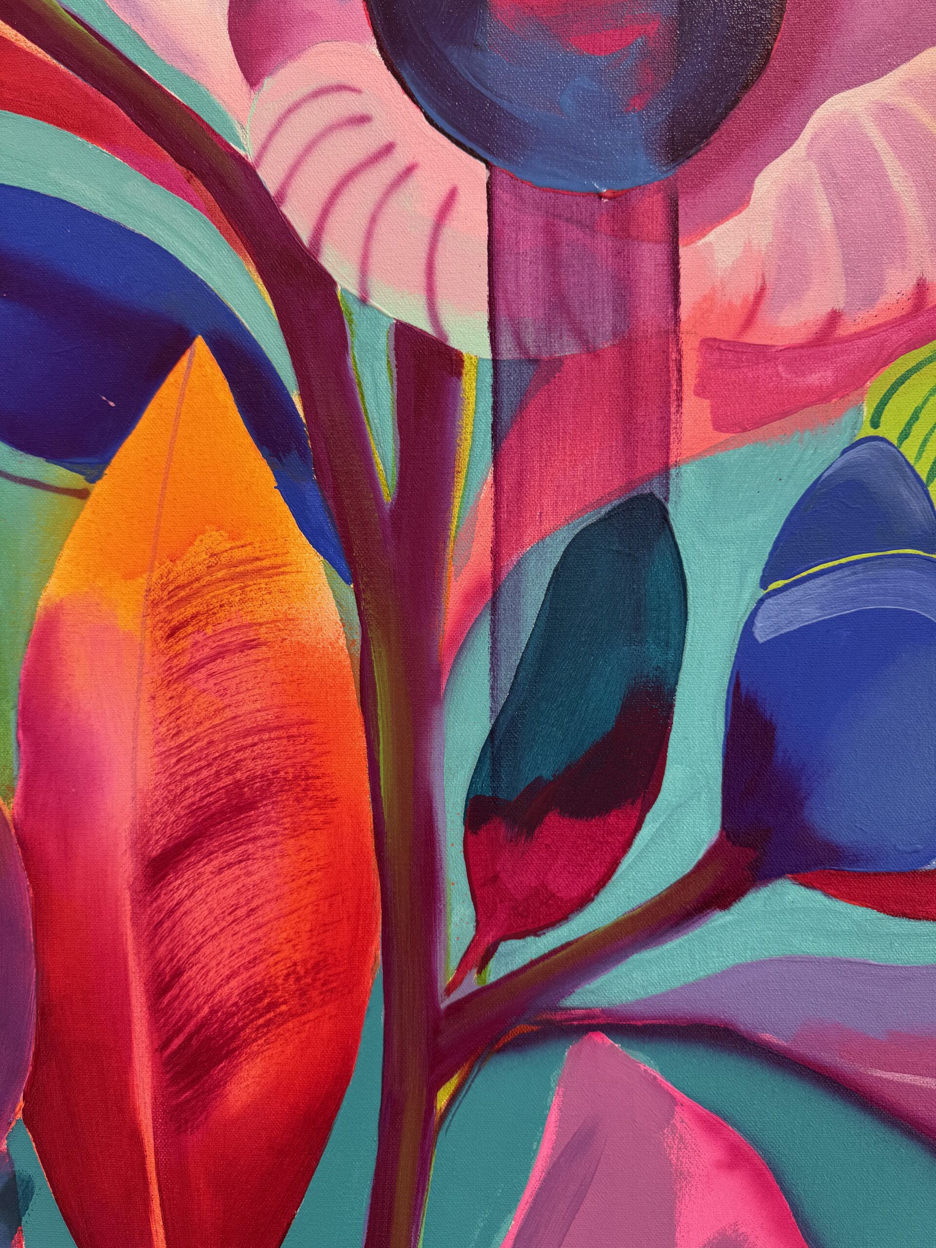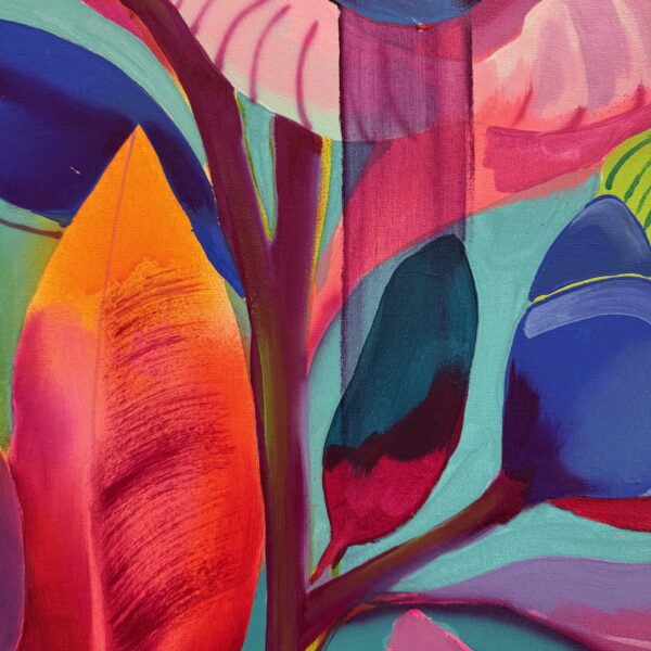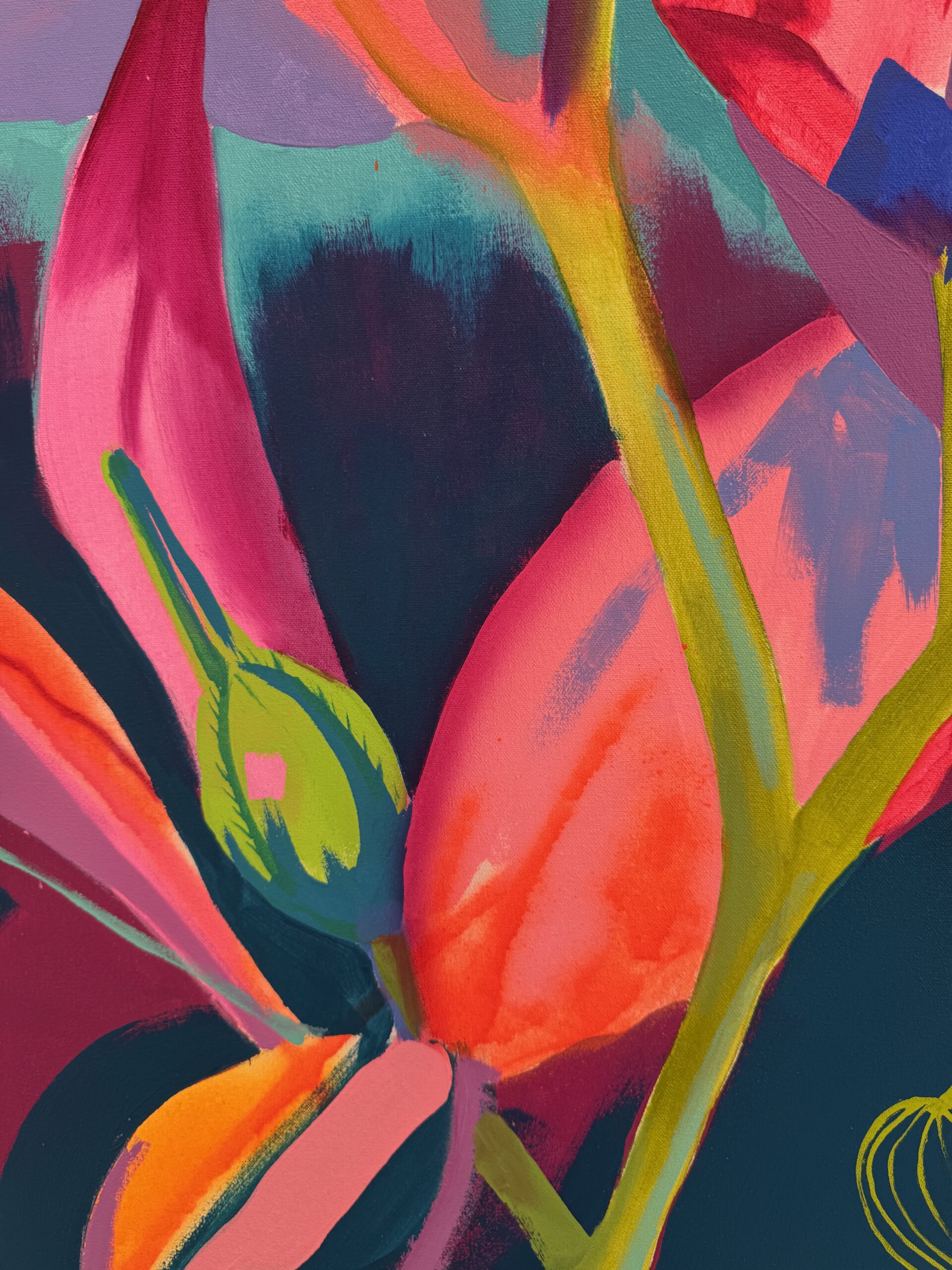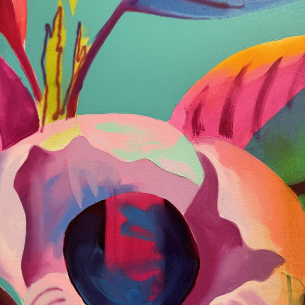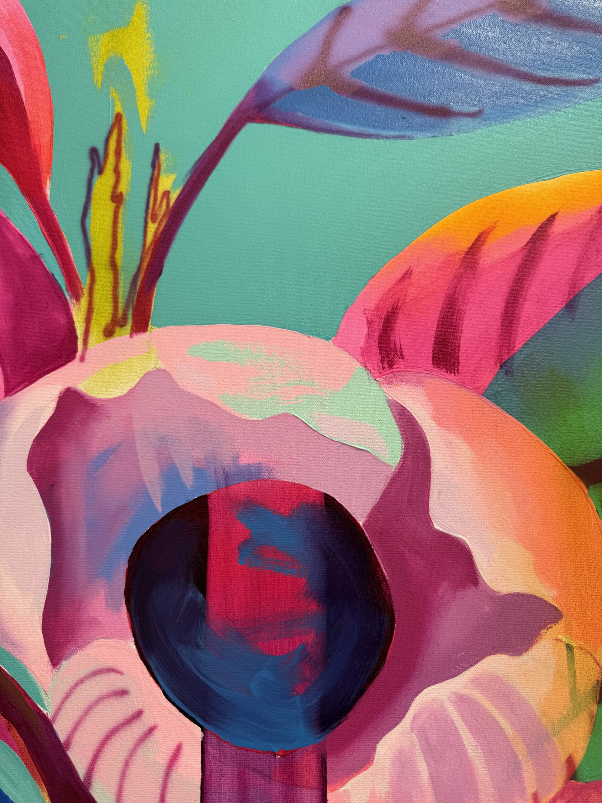 Fowler’s “Green Tea” is a vivid, electrified reimagining of botanical illustration, where the organic world is transformed into a pulsating explosion of color, abstraction, and surreal energy. Inspired by the namesake tea plant, Fowler’s work transcends traditional scientific botanical studies, infusing them with contemporary neon surrealism and expressive painterly gestures.