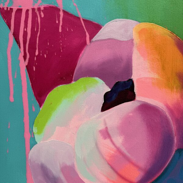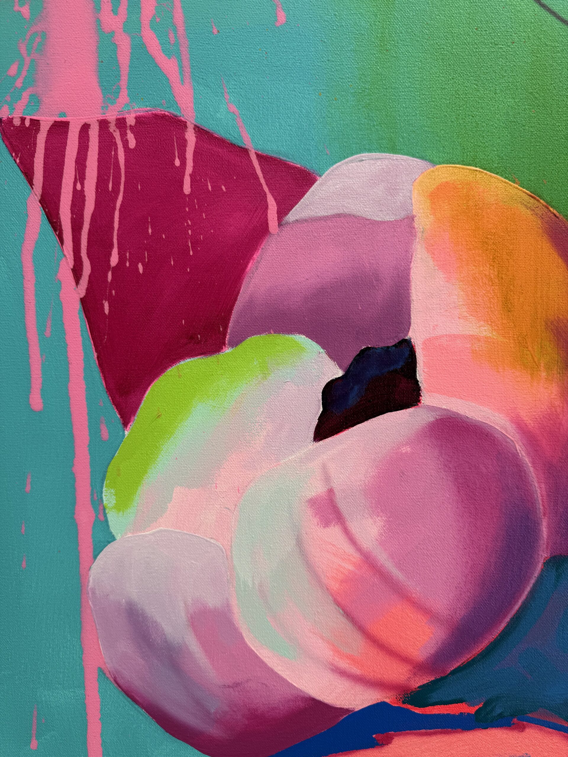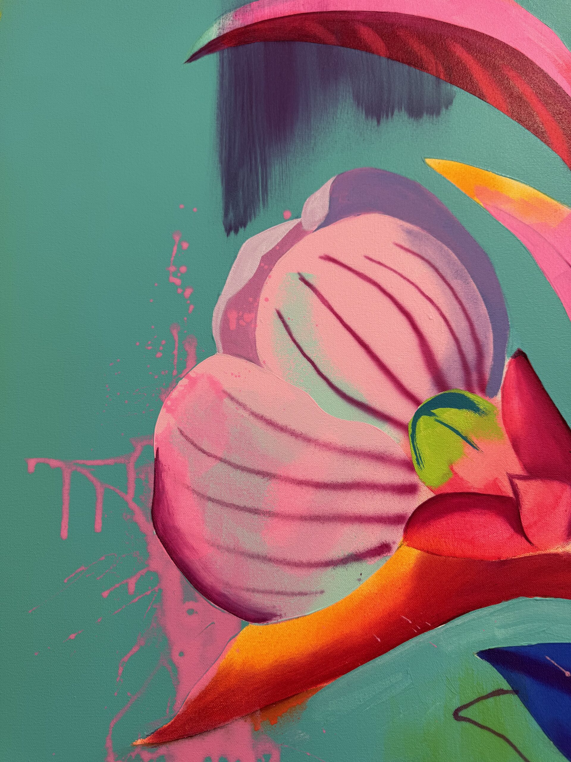 Fowler’s signature bold color blocking, layered textures, and expressive distortions create a work that feels both raw and refined. “Green Tea” challenges the viewer to consider nature not just as it is, but as it could be—intensified, reimagined, and alive with vibrant possibility. It is a celebration of organic form through a contemporary, urban lens, making it an unmistakable statement piece in the realm of modern botanical art.