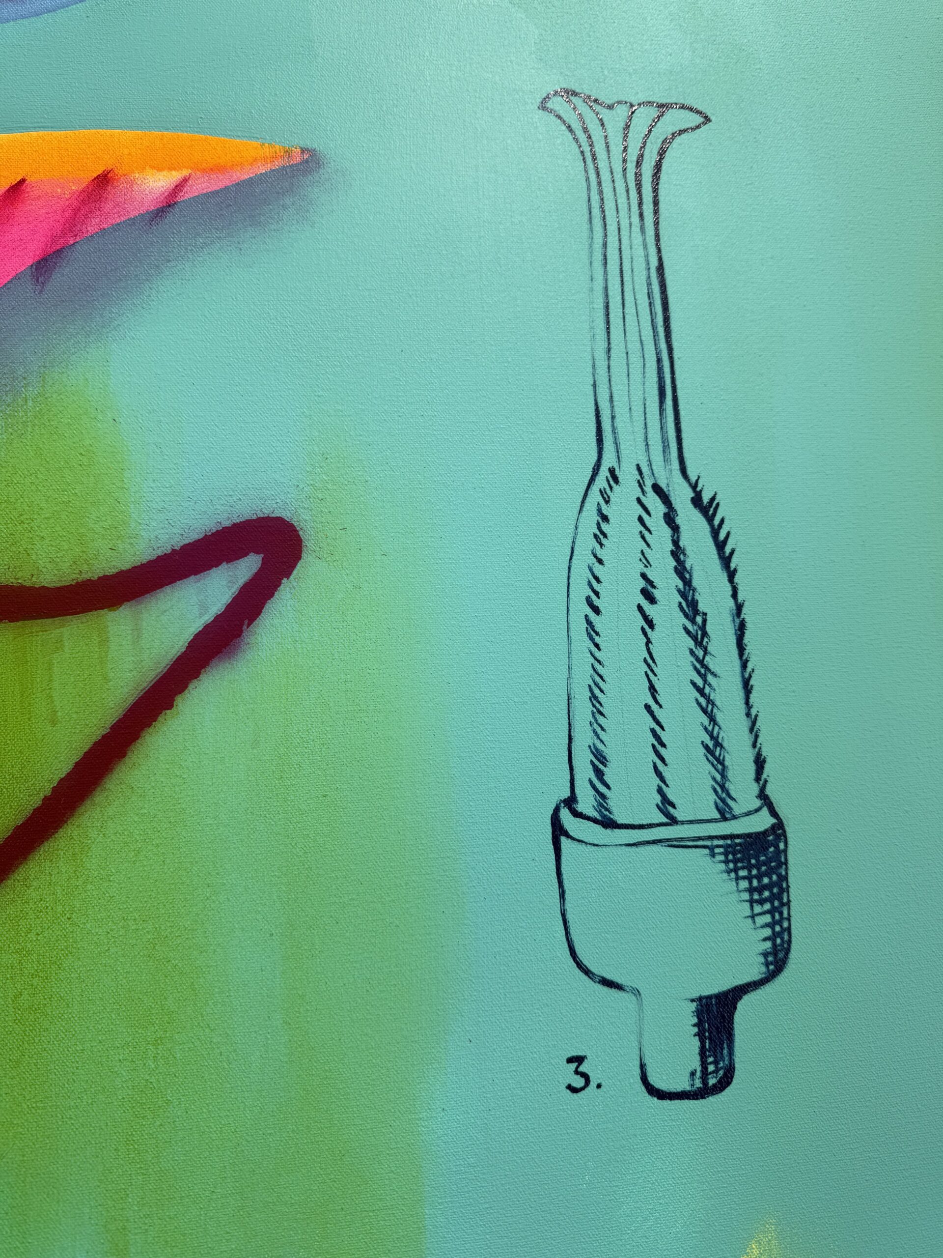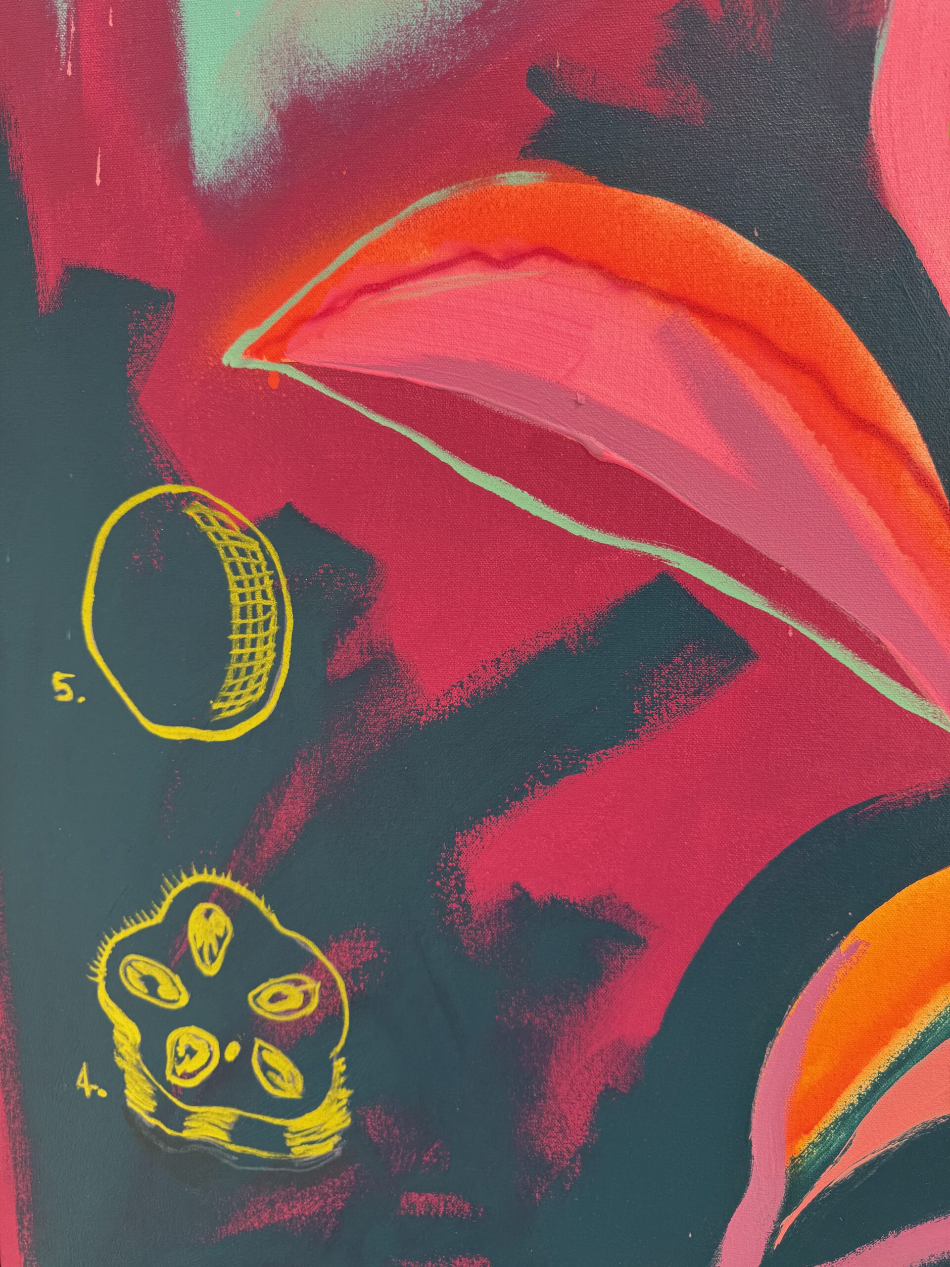 Hints of scientific illustration appear at the periphery—hand-drawn botanical schematics and numbered diagrams give a nod to taxonomy and botanical study, yet they are fragmented and surreal, reinforcing the collision between traditional knowledge and abstract reinterpretation. A pale turquoise background, streaked with drips and energetic brushwork, adds to the sense of a living, breathing composition—one that refuses to remain static.