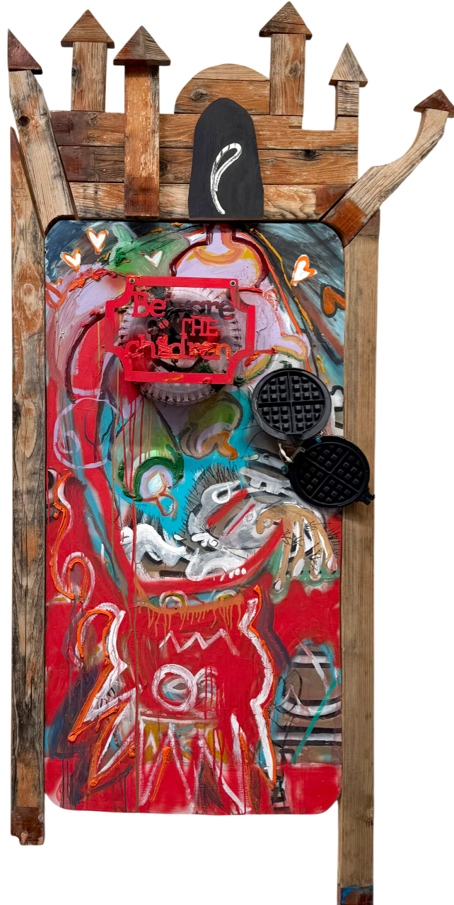 This vibrant mixed media assemblage is a celebration—and interrogation—of childhood imagination, nostalgia, and the manufactured fantasies we grow up with. Constructed on a large wooden panel, the piece fuses painting, sculpture, and found objects to build a chaotic yet intentional universe where memory, myth, and marketing collide.