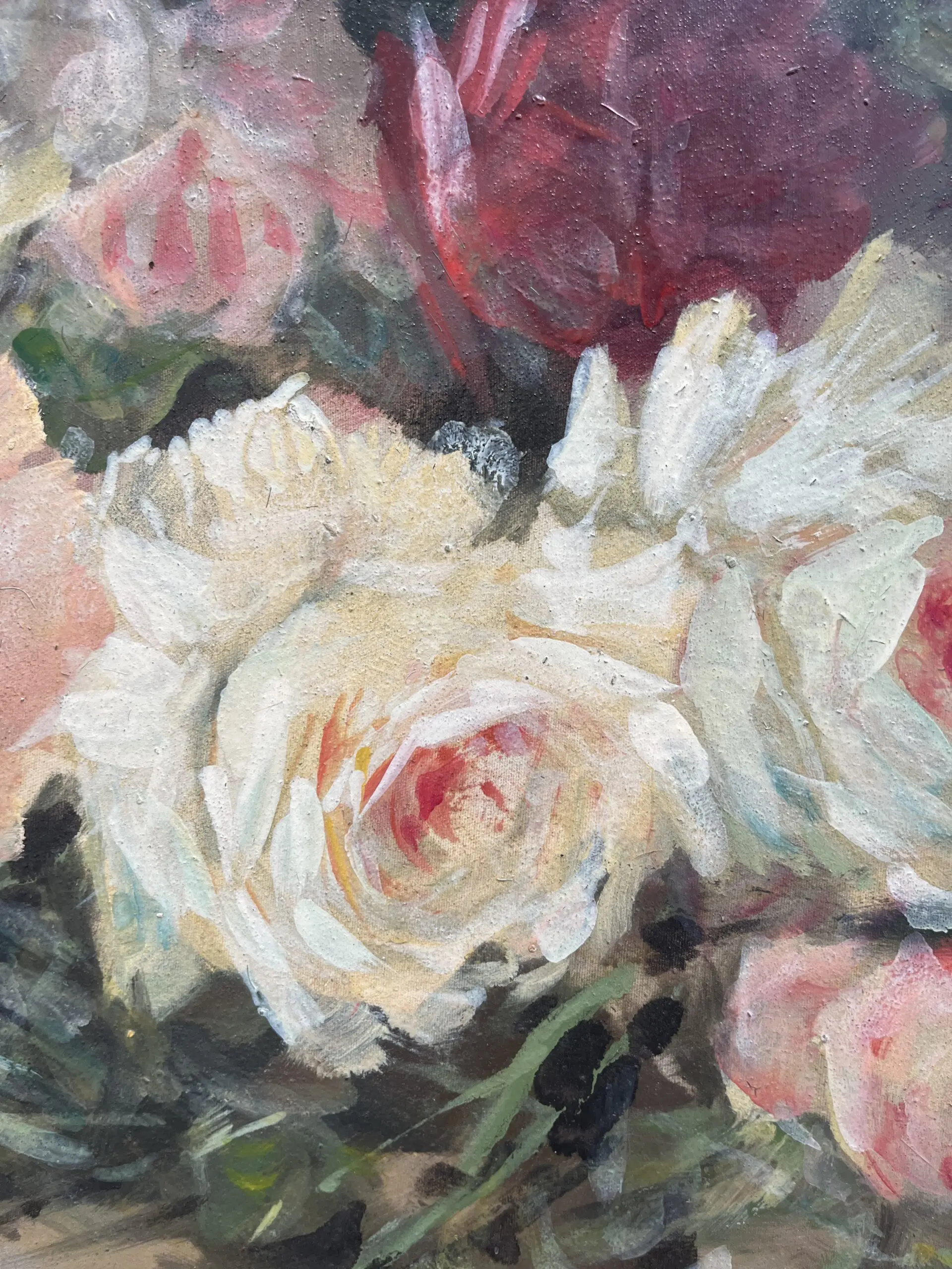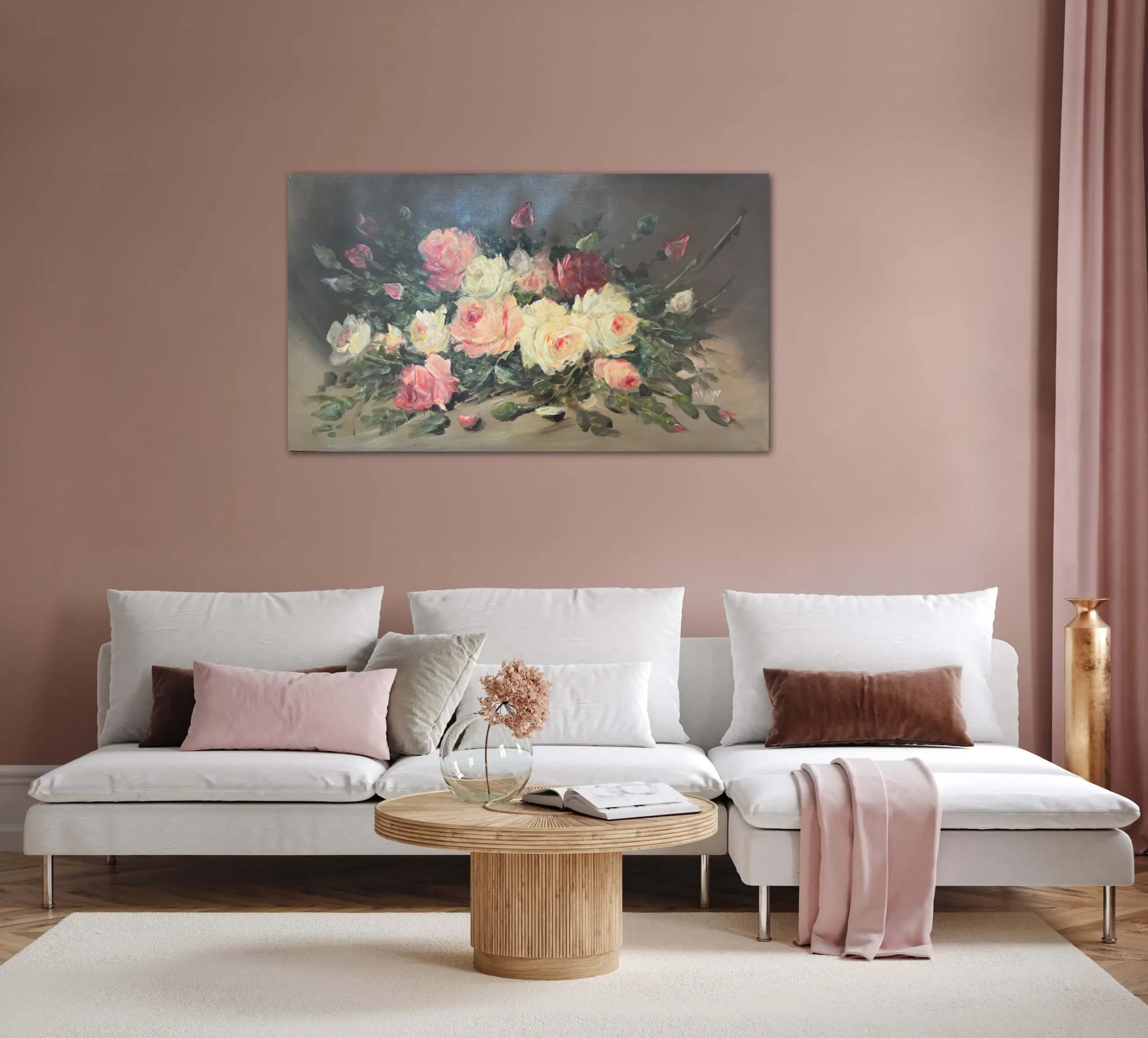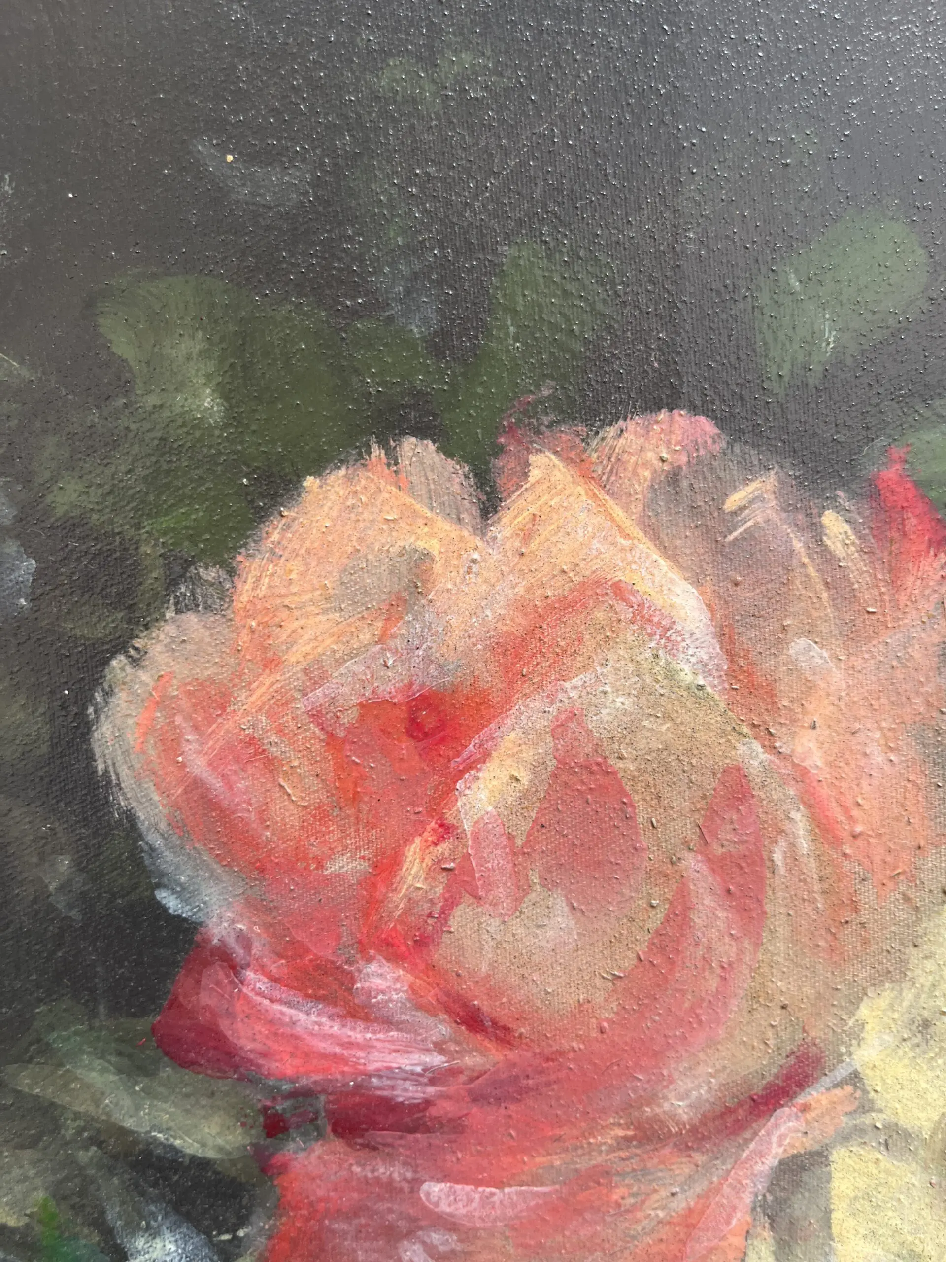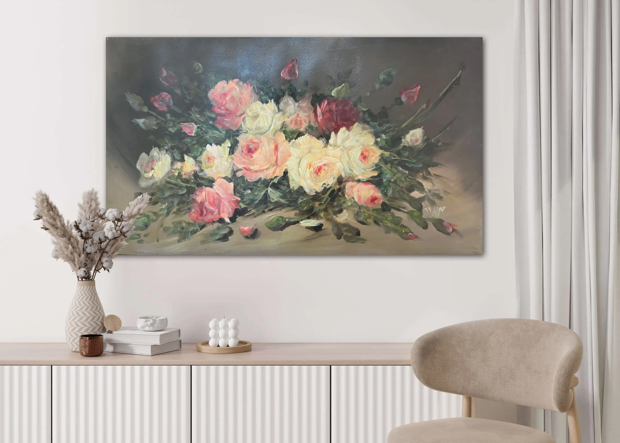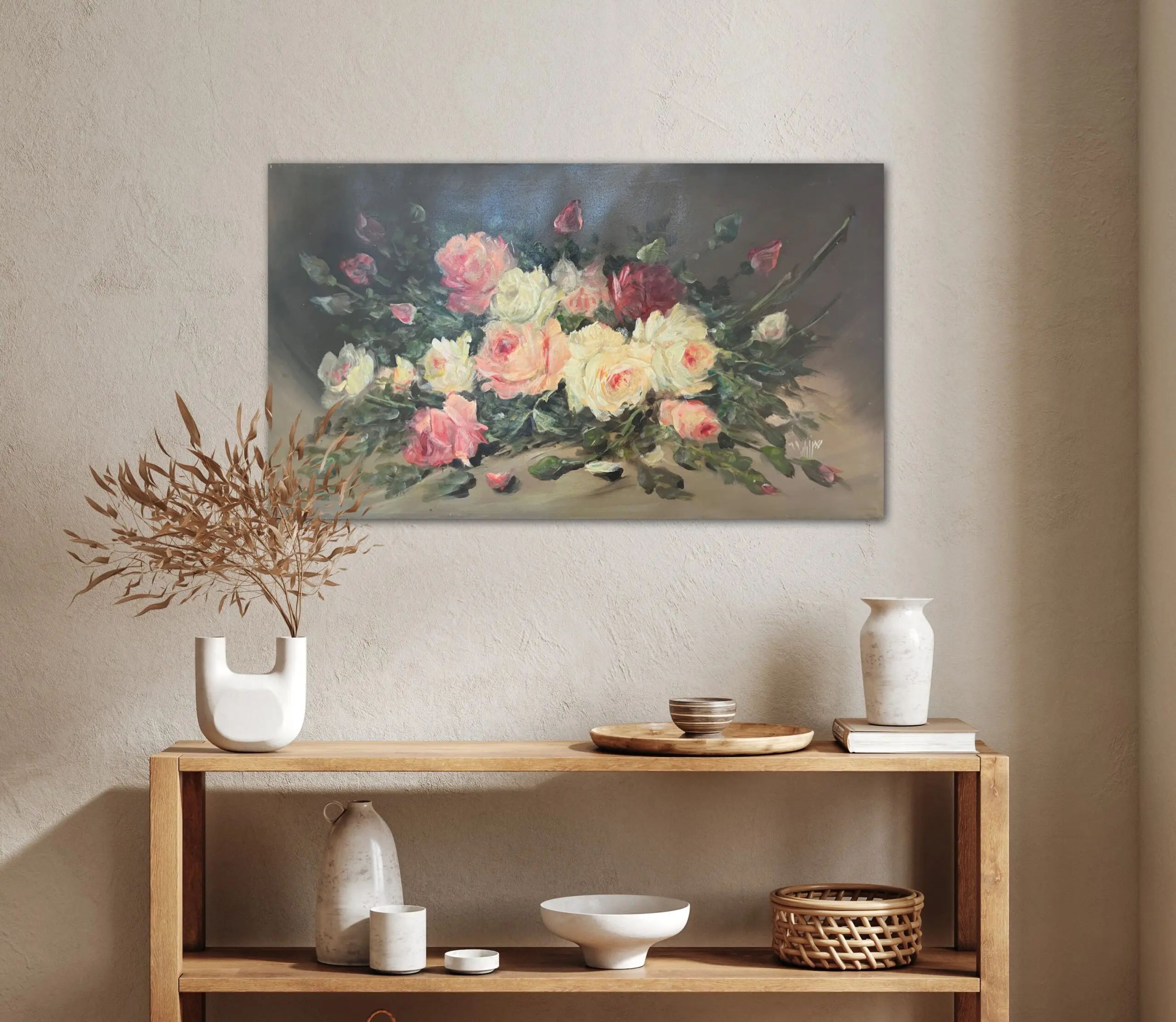 This stunning bouquet of roses exudes a vibrant energy through the artist’s expressive energy. It is a perfect balance between freedom and control, allowing the subject matter to come to life on the canvas. The brushstrokes possess a dynamic quality, capturing the essence of movement and spontaneity. The flowers seem to burst forth from the canvas, their petals appearing soft and delicate, yet infused with a sense of vitality. The creamy white hues of the roses stand out against the darker background, creating a visual contrast, adding depth and dimension to the artwork.
