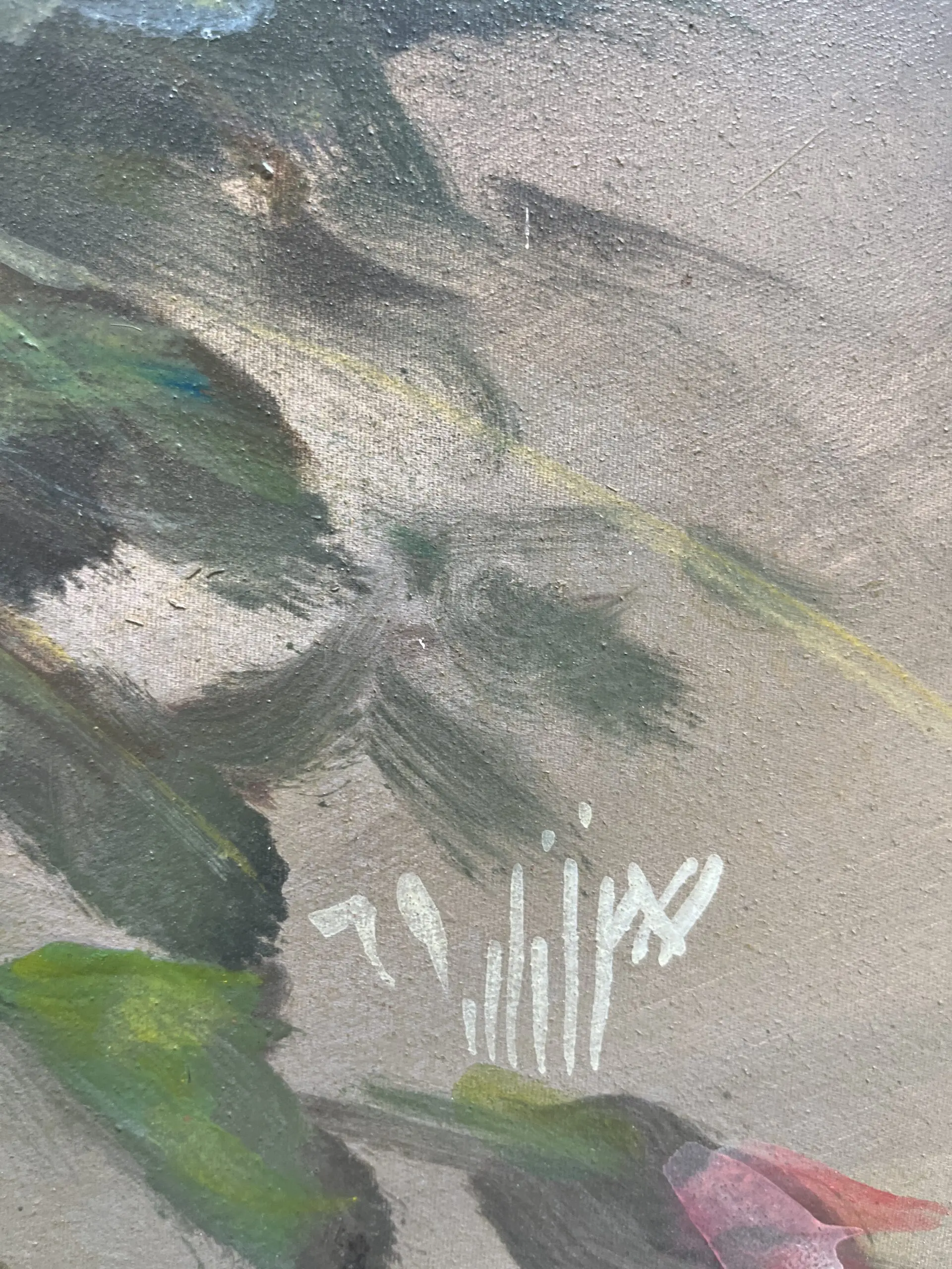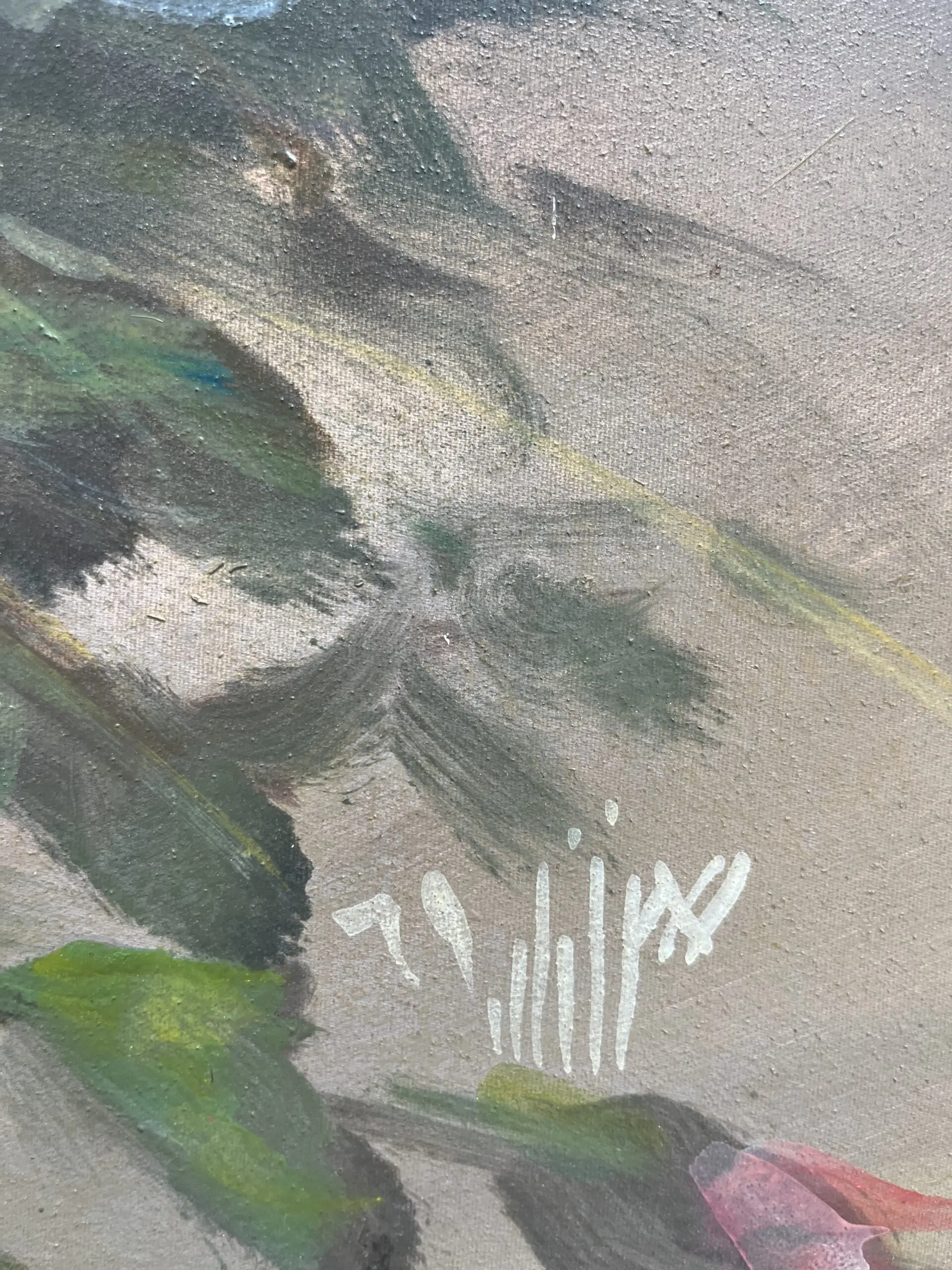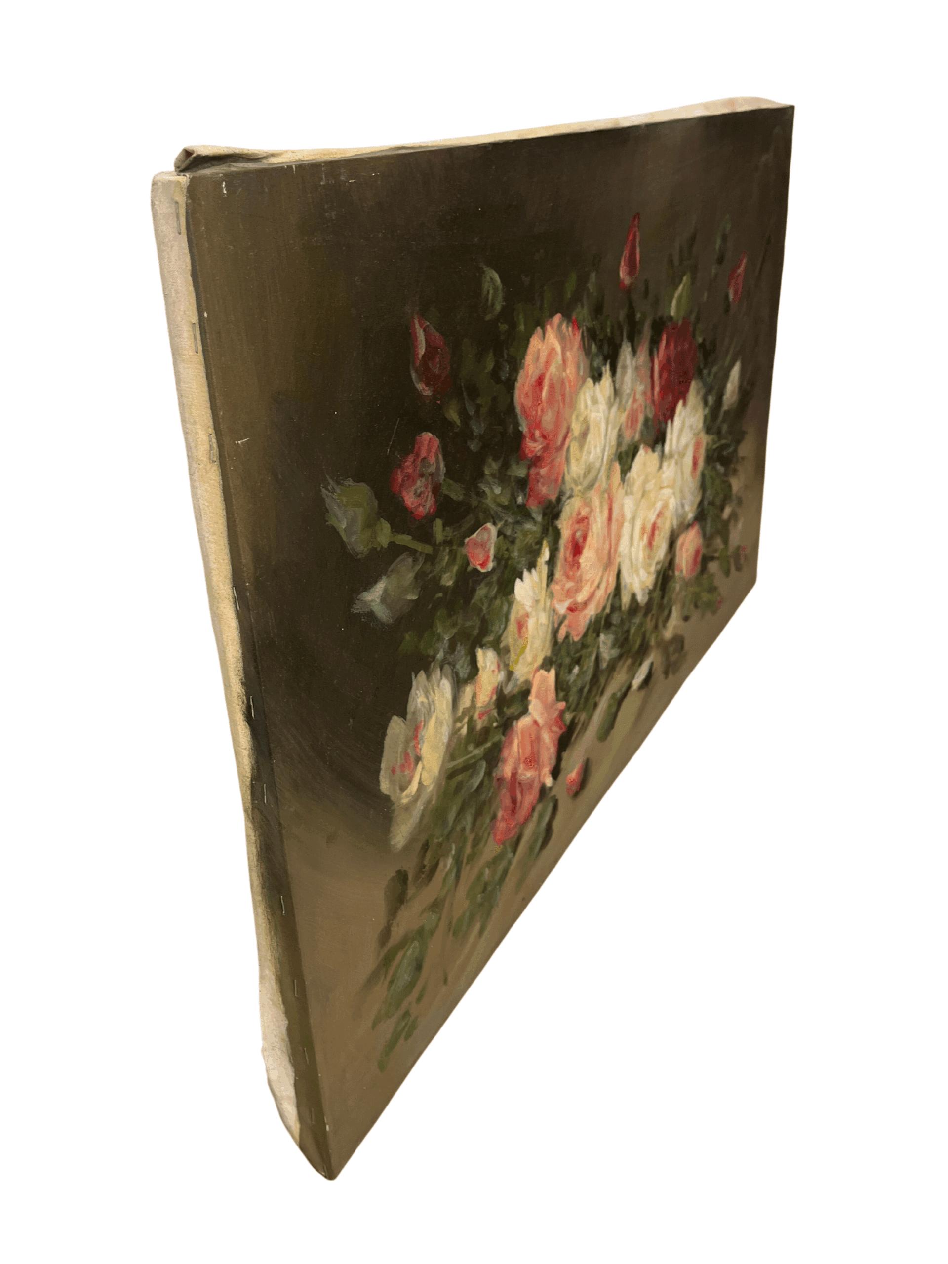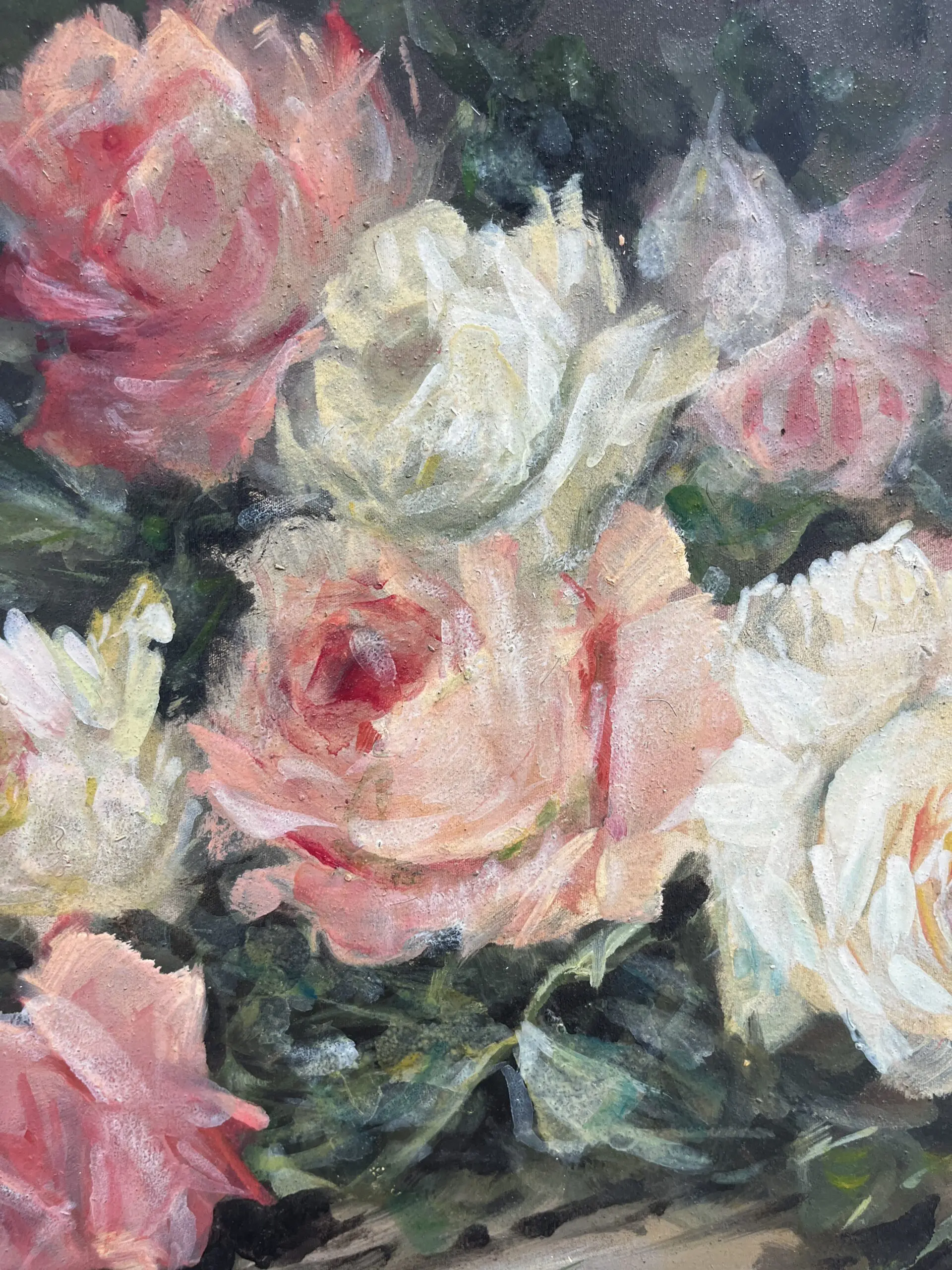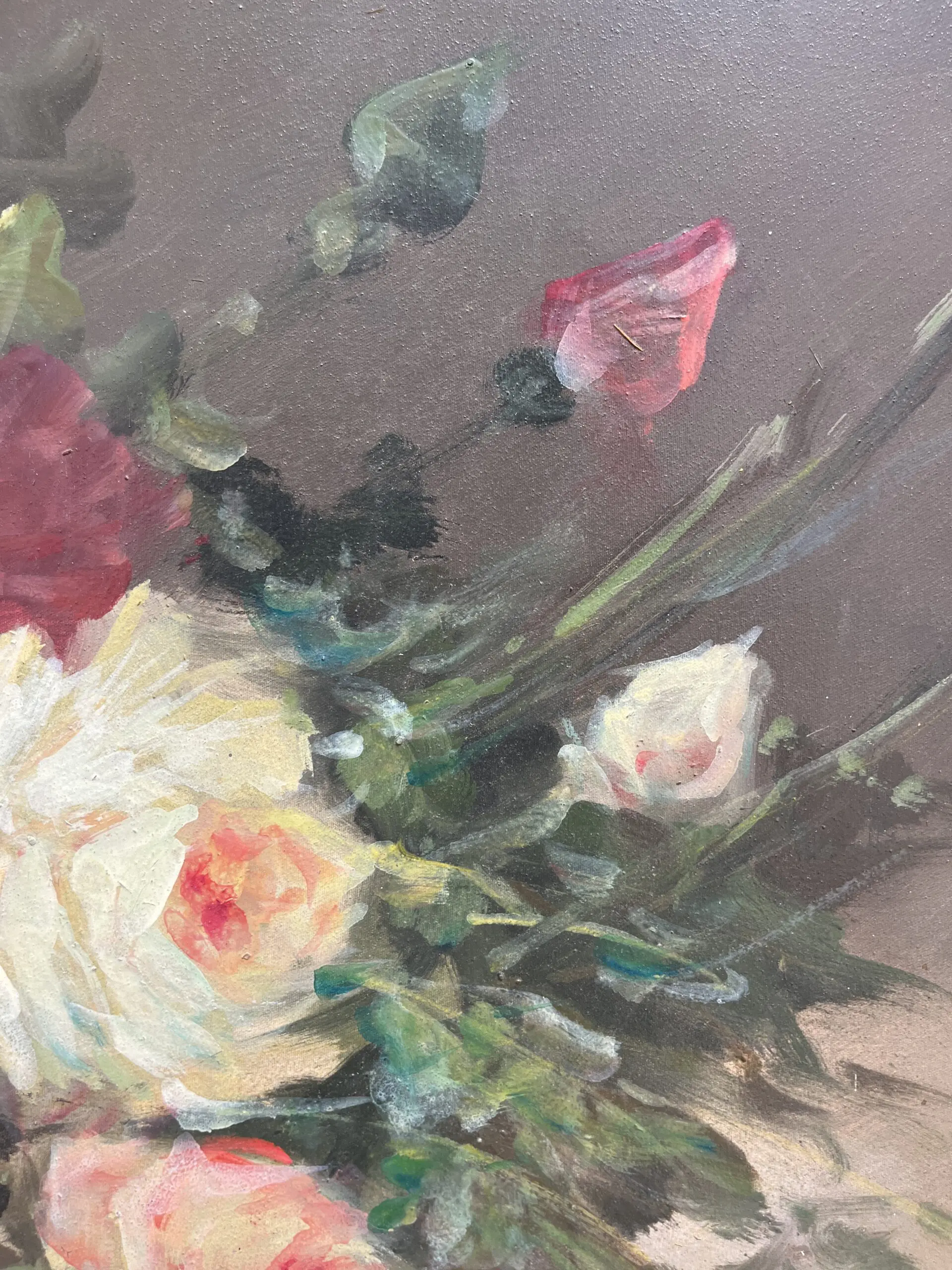This stunning bouquet of roses exudes a vibrant energy through the artist’s expressive energy. It is a perfect balance between freedom and control, allowing the subject matter to come to life on the canvas. The brushstrokes possess a dynamic quality, capturing the essence of movement and spontaneity. The flowers seem to burst forth from the canvas, their petals appearing soft and delicate, yet infused with a sense of vitality. The creamy white hues of the roses stand out against the darker background, creating a visual contrast, adding depth and dimension to the artwork.