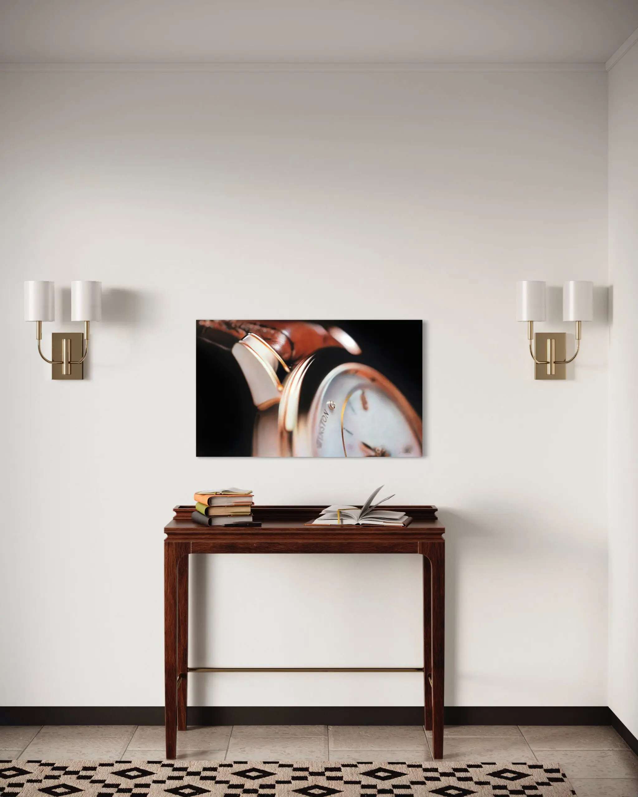 A realistic close-up of a Harry Wilson watch takes center stage. The painting showcases the watch facing the viewer, appearing incredibly lifelike and almost as if it could be touched. The focus is on the top of the painting, where the material of the watch and the name “Winston” are prominently displayed. The gold metallic tones of the watch contrast beautifully with the rich leather strap, adding depth and texture to the artwork.