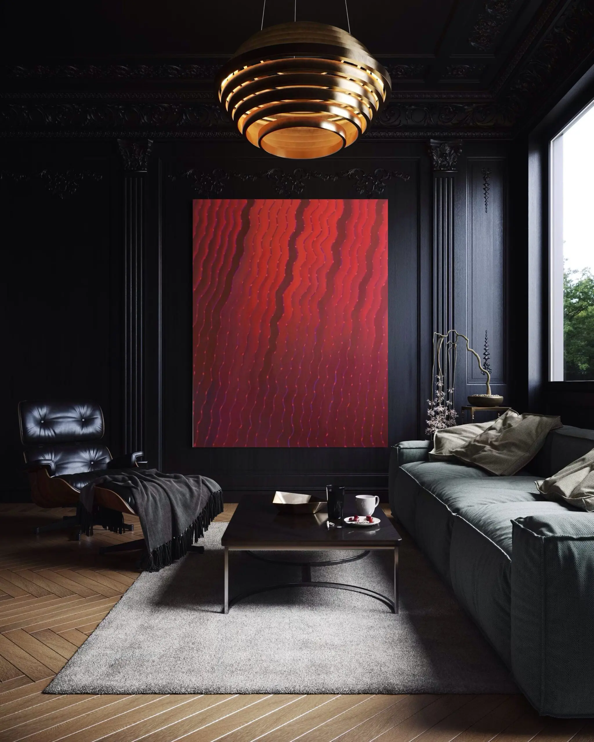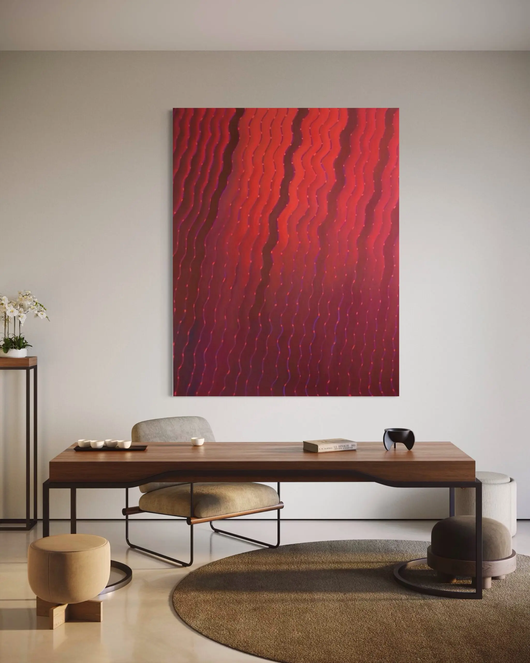 Heart Waves is a large-scale oil and oil bar painting that translates rhythm, emotion, and optical movement into a luminous field of undulating vertical lines. Rendered in a radiant spectrum of reds, the surface appears to shift and pulse as the viewer moves before it. Small, precisely placed points of contrasting color punctuate each wave, activating the canvas with a quiet vibration.