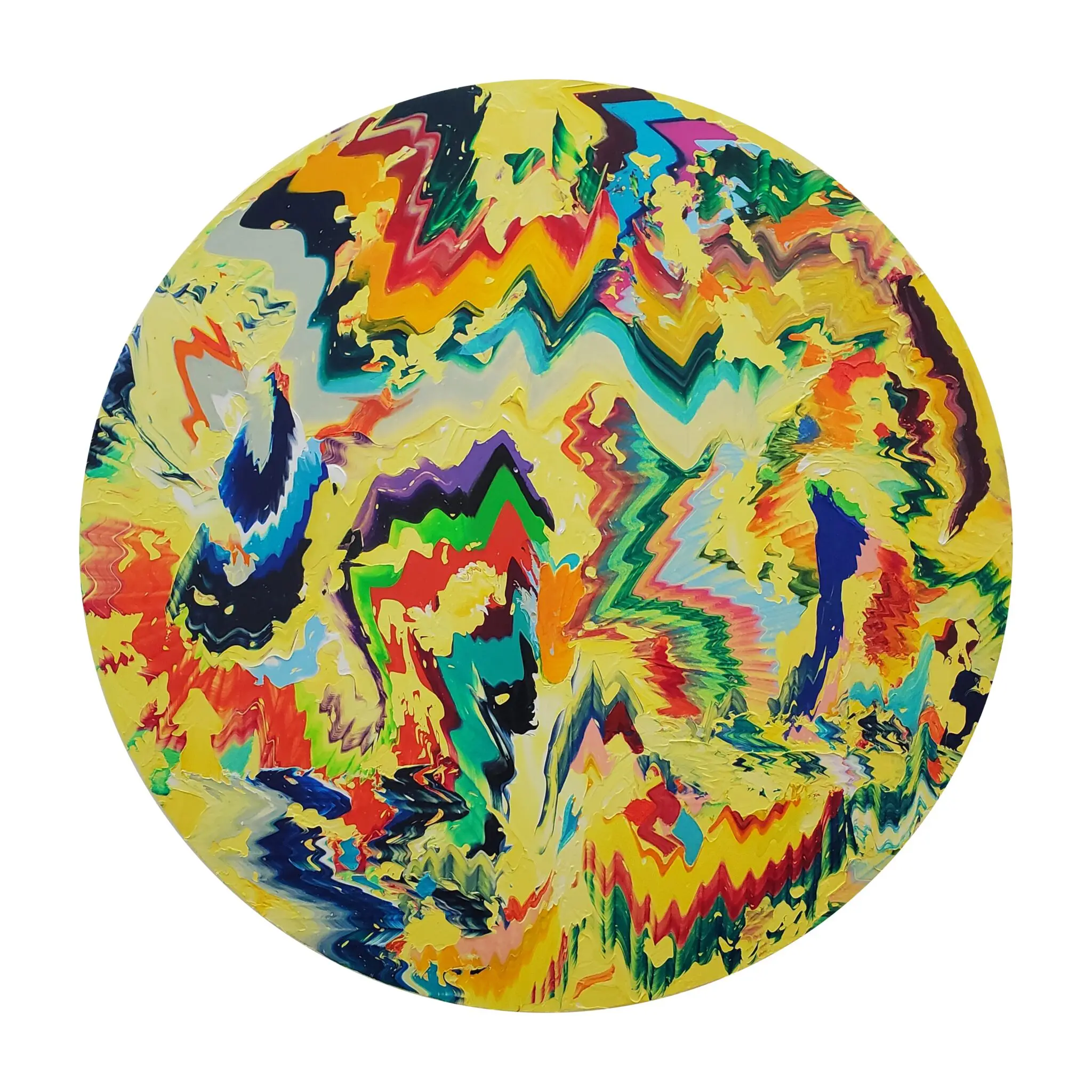 “Heliophile” is a visual ecstasy, reminiscent of the radiant rise of the sun. The composition radiates outward, with each hue maintaining its strength while complementing the others. The juxtaposition of warm and cool tones creates a sense of tension and momentum, reinforcing the dynamic and invigorating structure of the piece. The circular form encourages exploration, allowing the viewer to engage with every part of the canvas. The artist’s use of a round canvas disrupts traditional framing, enhancing the organic and fluid nature of the composition.