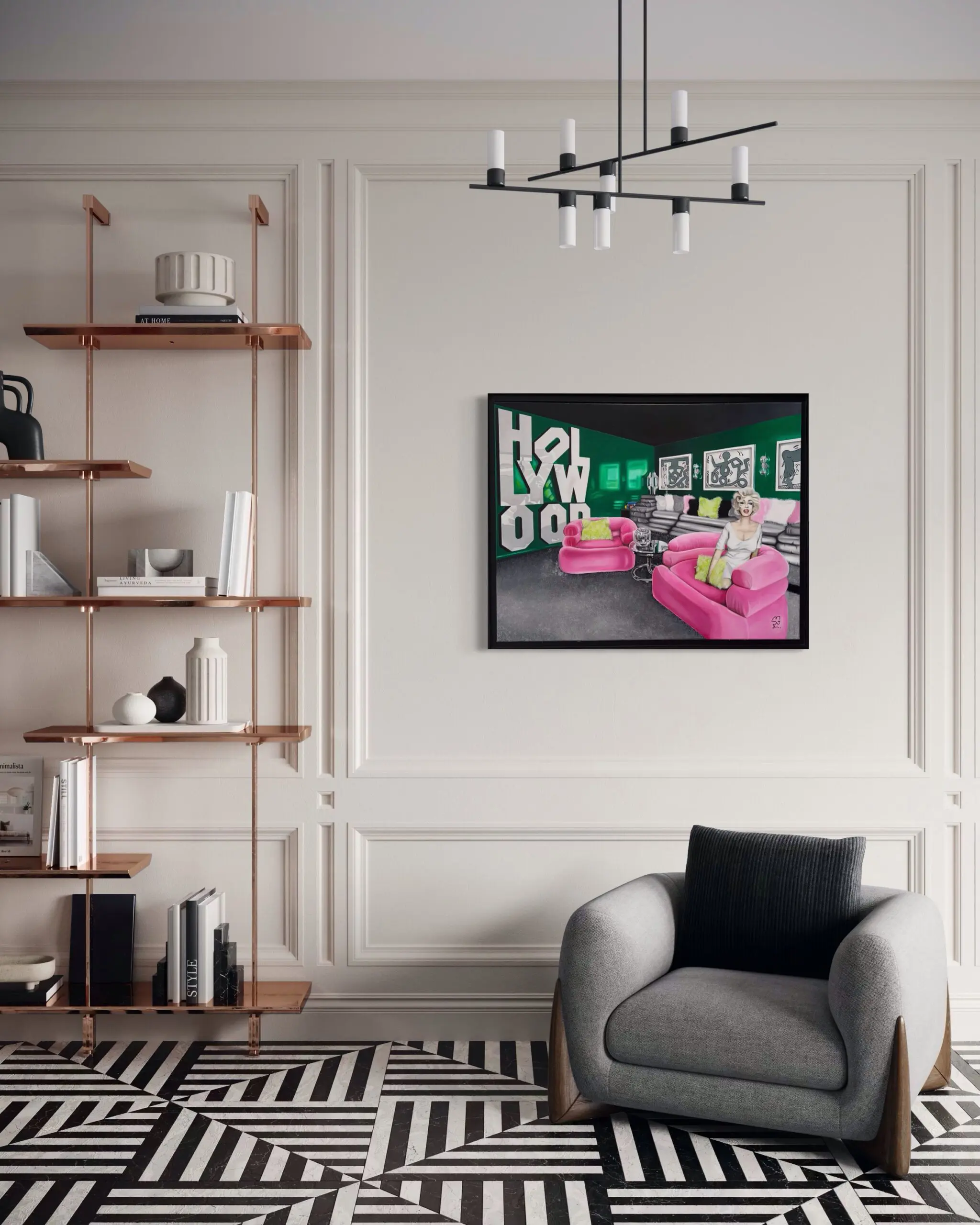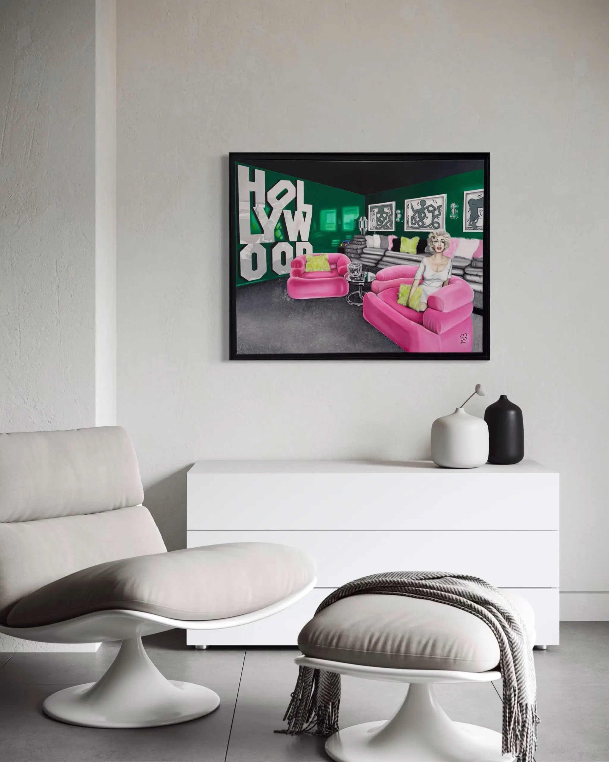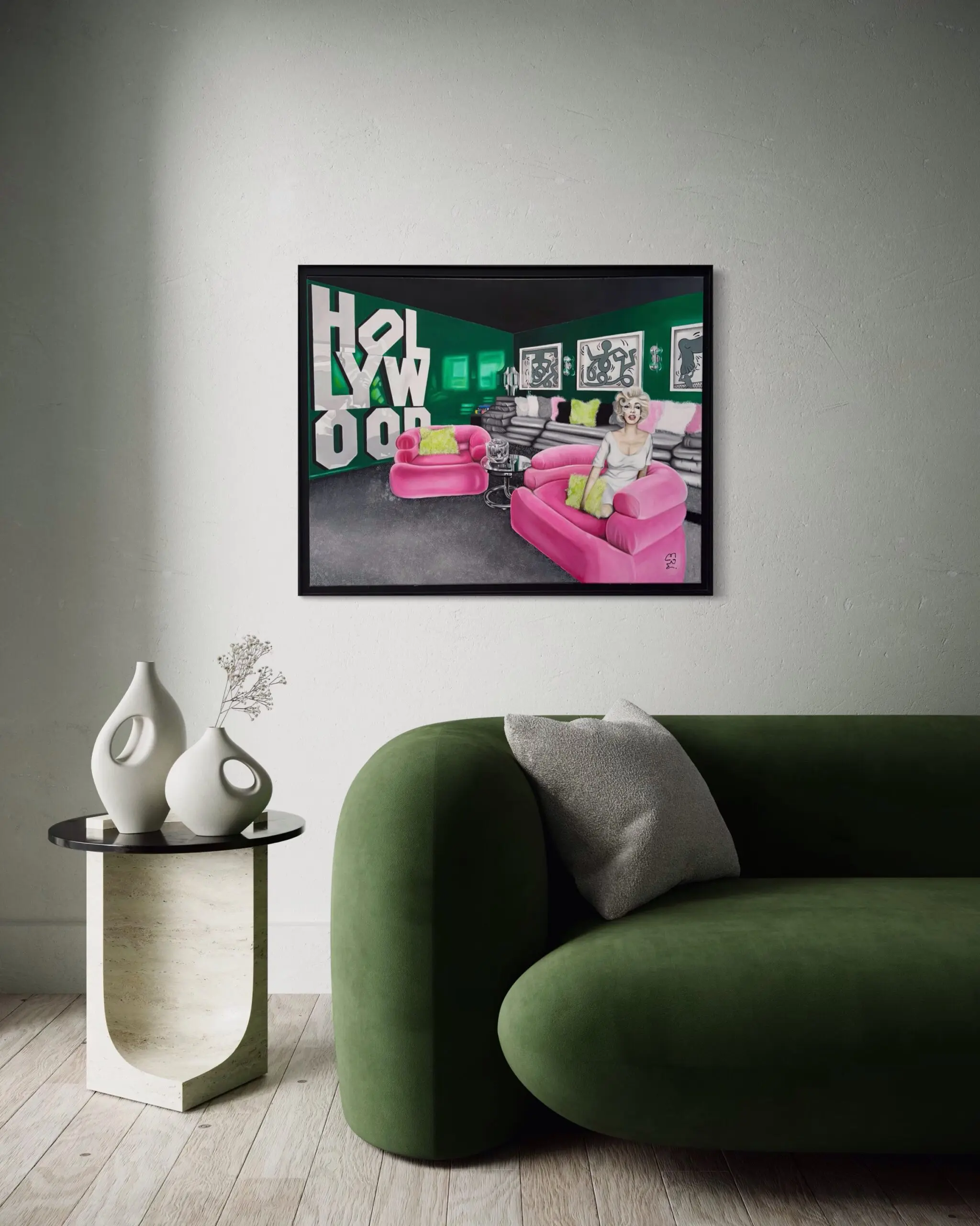 The setting unfolds as a hyper-stylized dreamscape, where neon pink sofas, lime-green pillows, and deep emerald walls create a surreal contrast, distorting light in an almost liquid manner. The Hollywood sign, traditionally an external landmark, appears inside the space, further blurring the boundaries between reality and illusion, interior and exterior, celebrity and fantasy. Black-and-white abstract artworks line the walls, their cryptic figures hinting at the faceless masses behind Hollywood’s relentless machine.