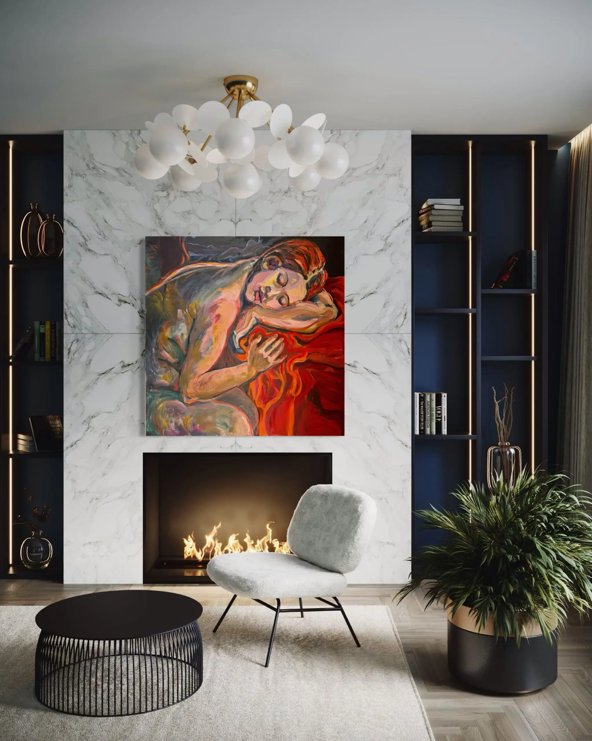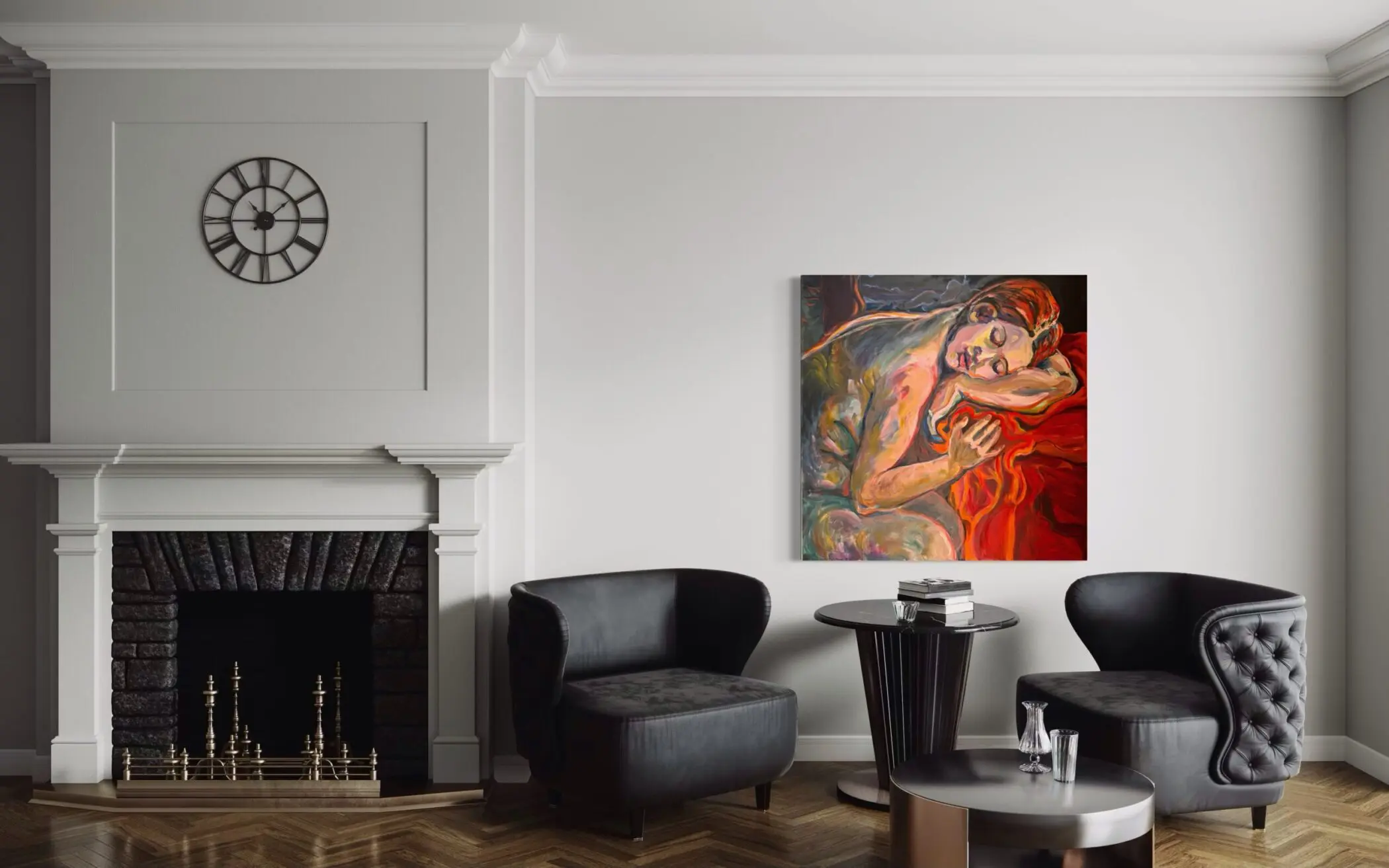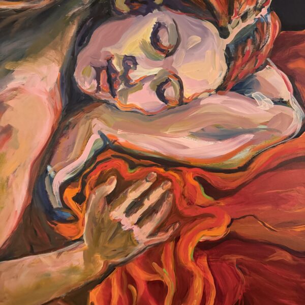 Alison Hyman’s oil painting “Hot Dreams” is a powerful exploration of intimacy, vulnerability, and subconscious desire, rendered in a luminous palette of fiery reds, oranges, and ochres. The reclining figure pulses with an almost dreamlike intensity, the expressive brushwork infusing the composition with movement, emotion, and psychological depth. The subject appears suspended in a liminal space between reality and reverie, drawing the viewer into a realm of raw sensuality and introspection.