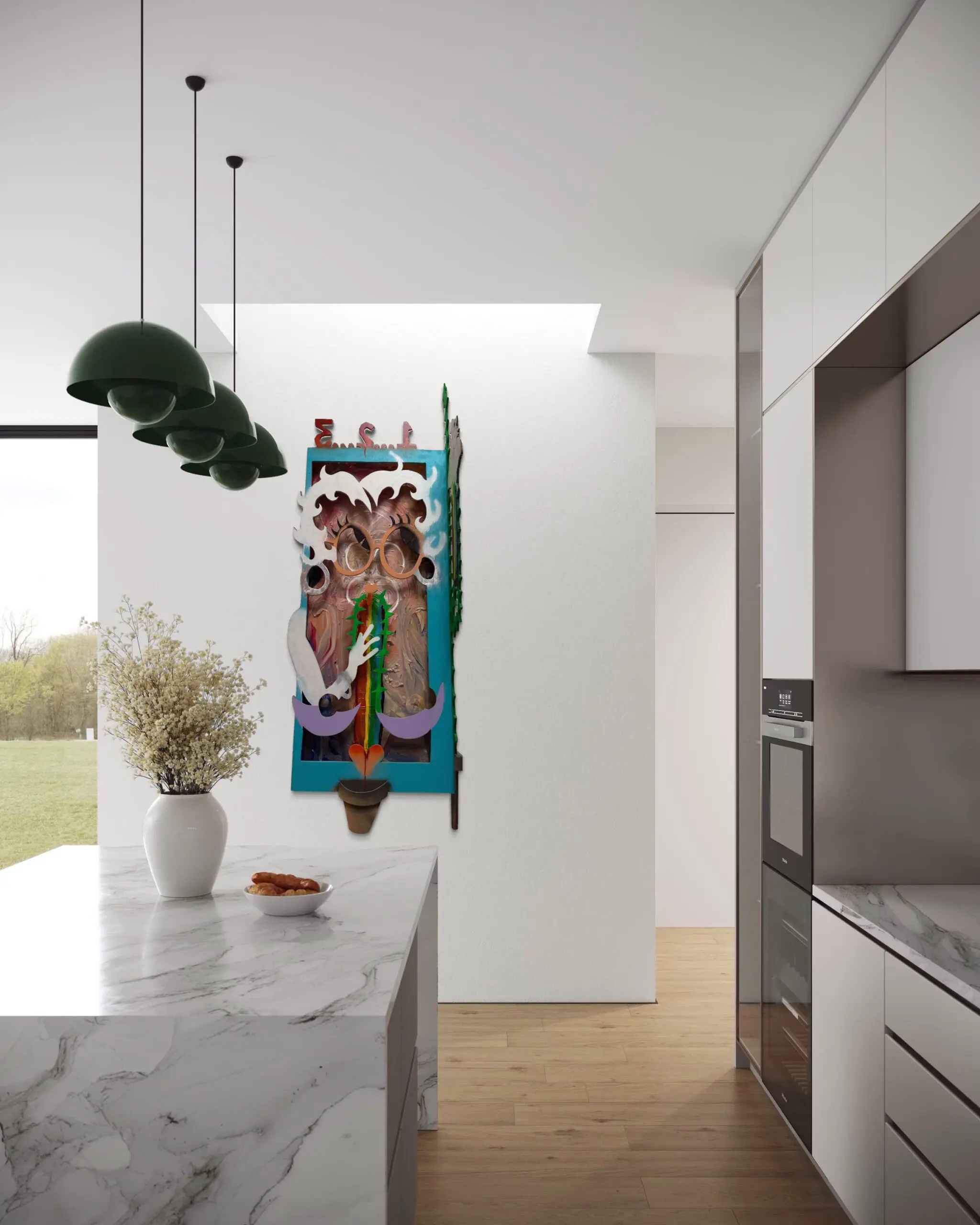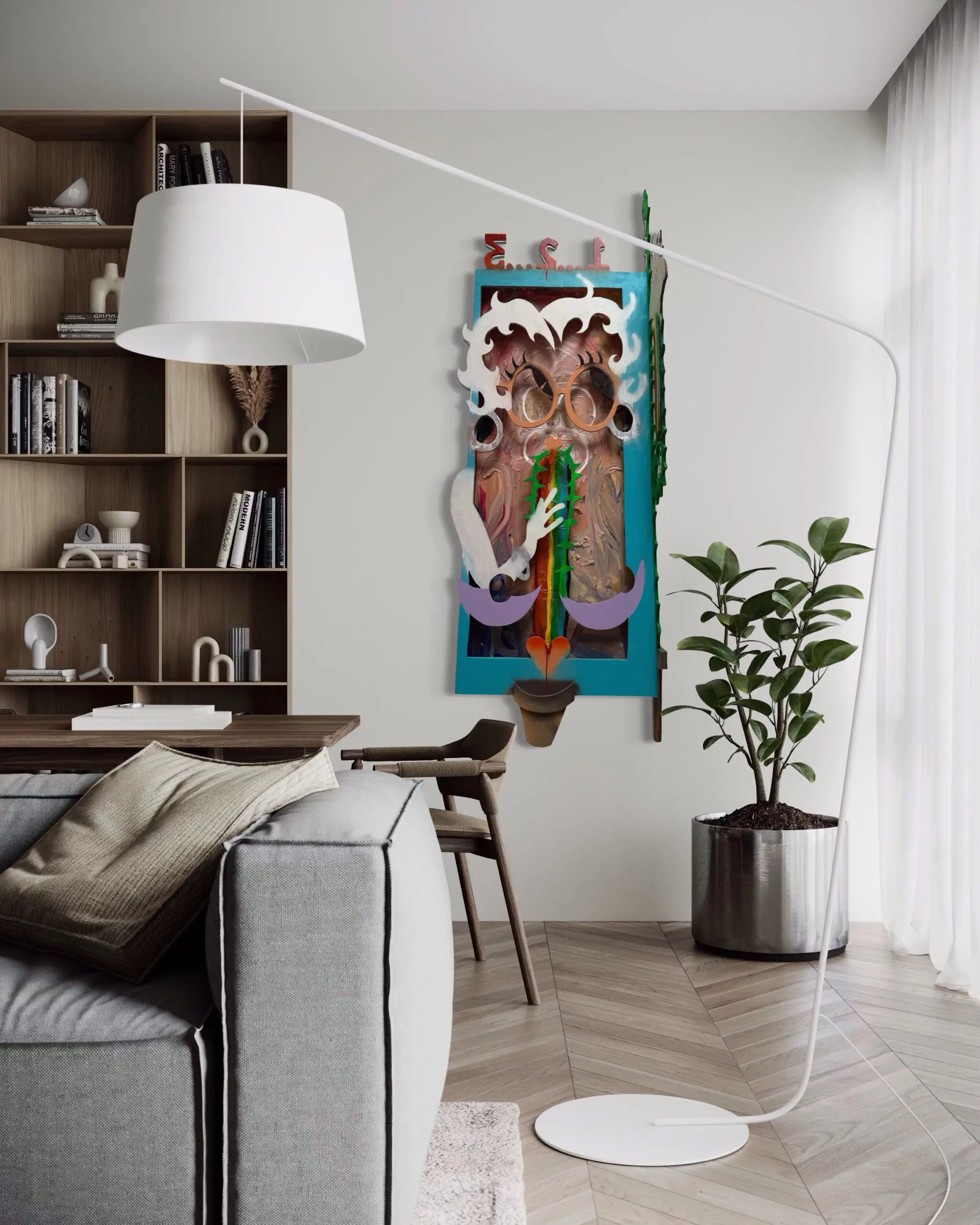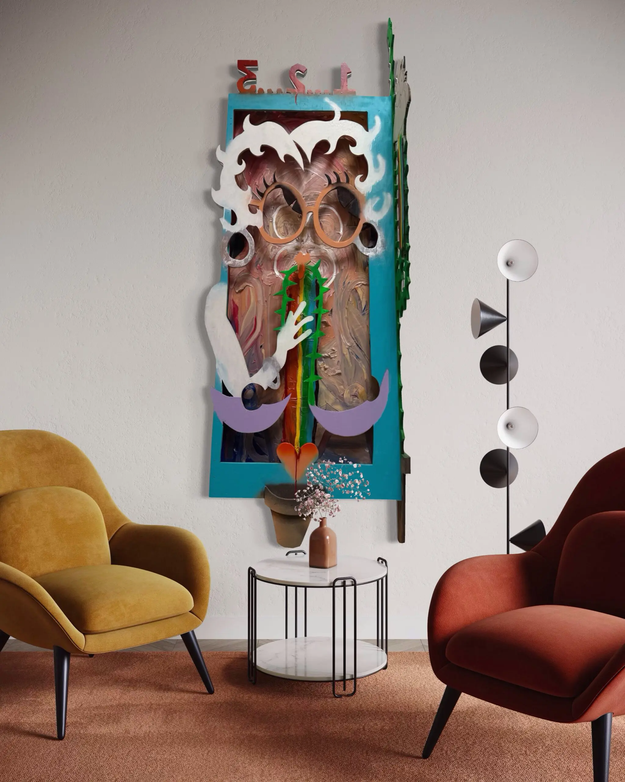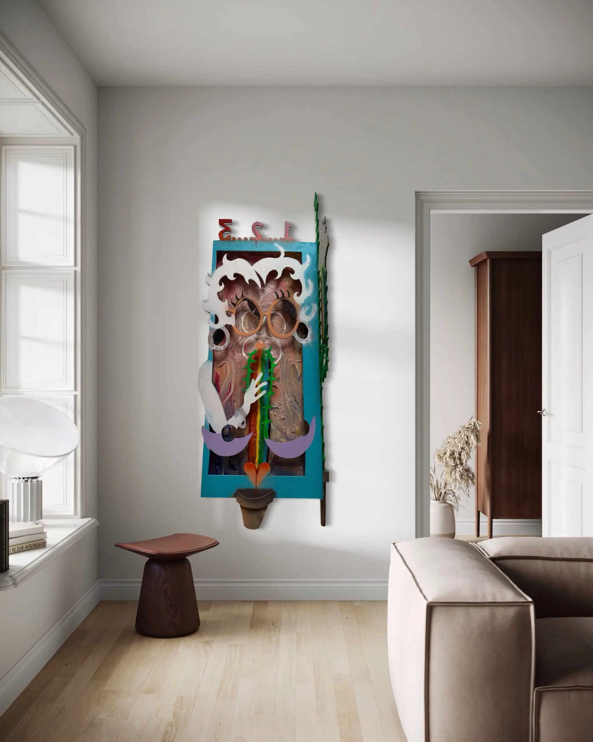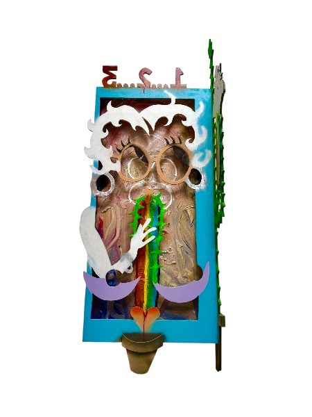 Crafted from hand-cut wood, layered acrylics, and 3D sculptural elements, the piece features Betty playfully sucking on a vibrant cactus—a visual metaphor that’s equal parts provocative and whimsical. The exaggerated features, swirling brushstrokes, and cartoon-inspired outlines create a striking sense of movement and personality.