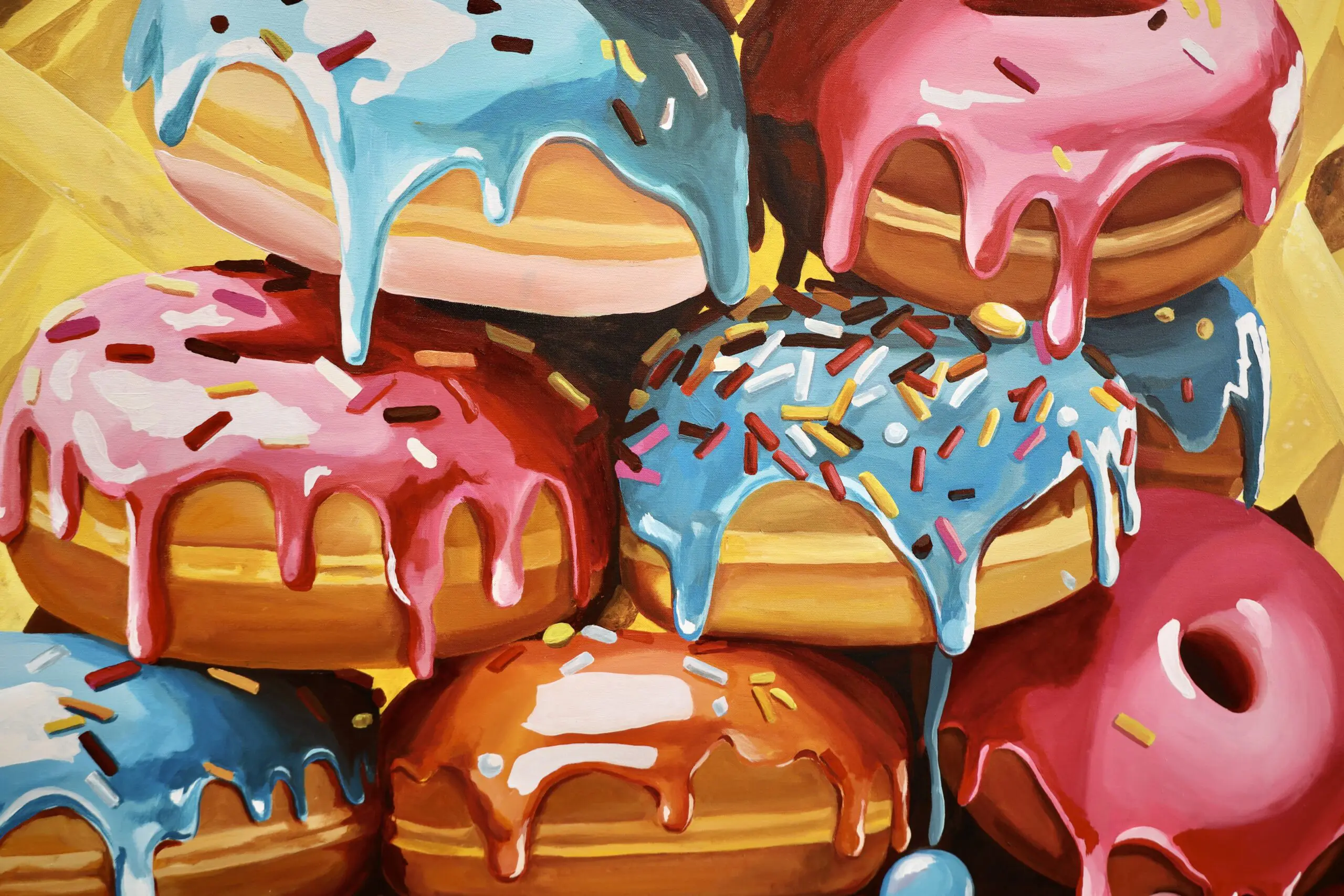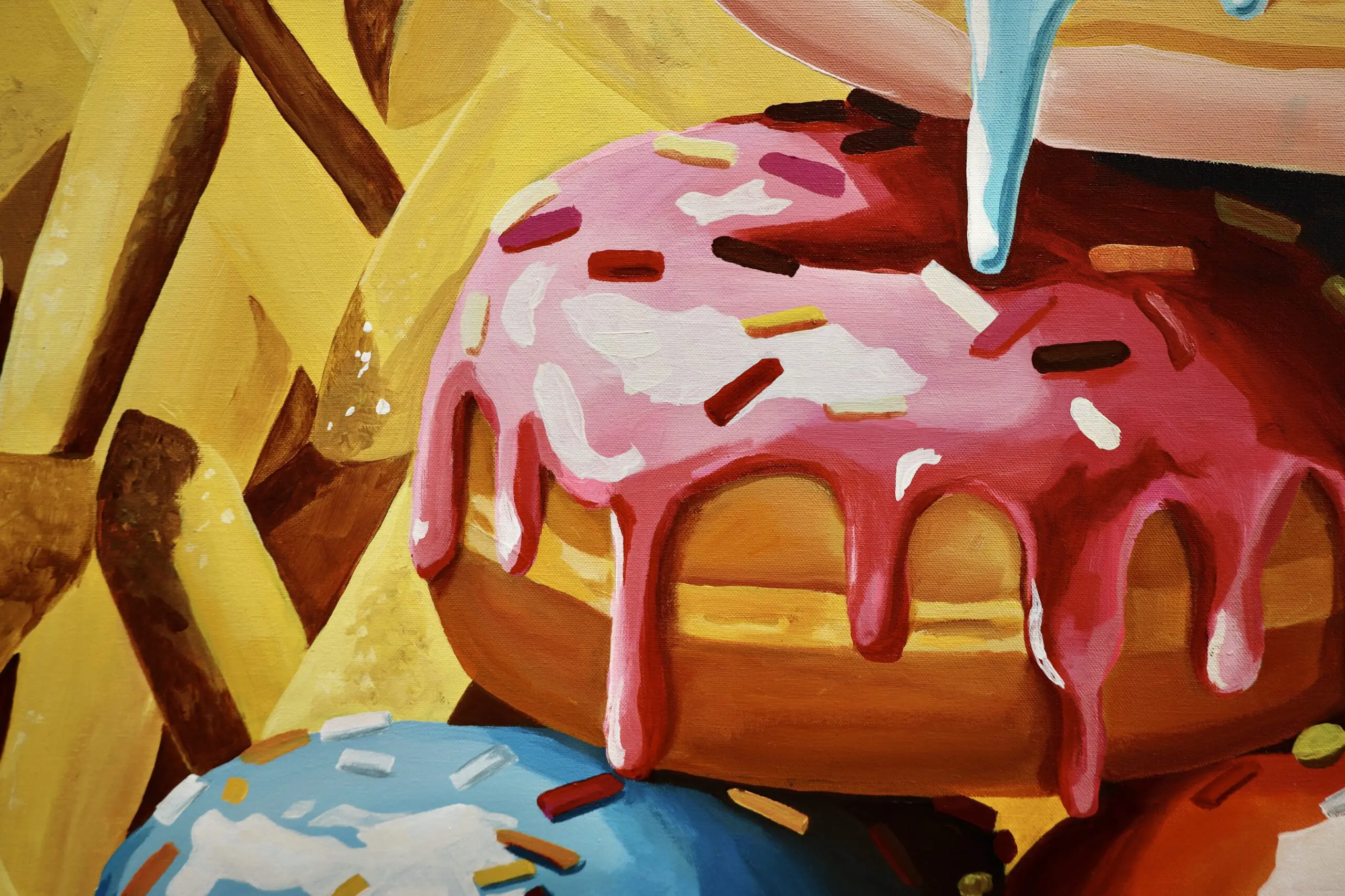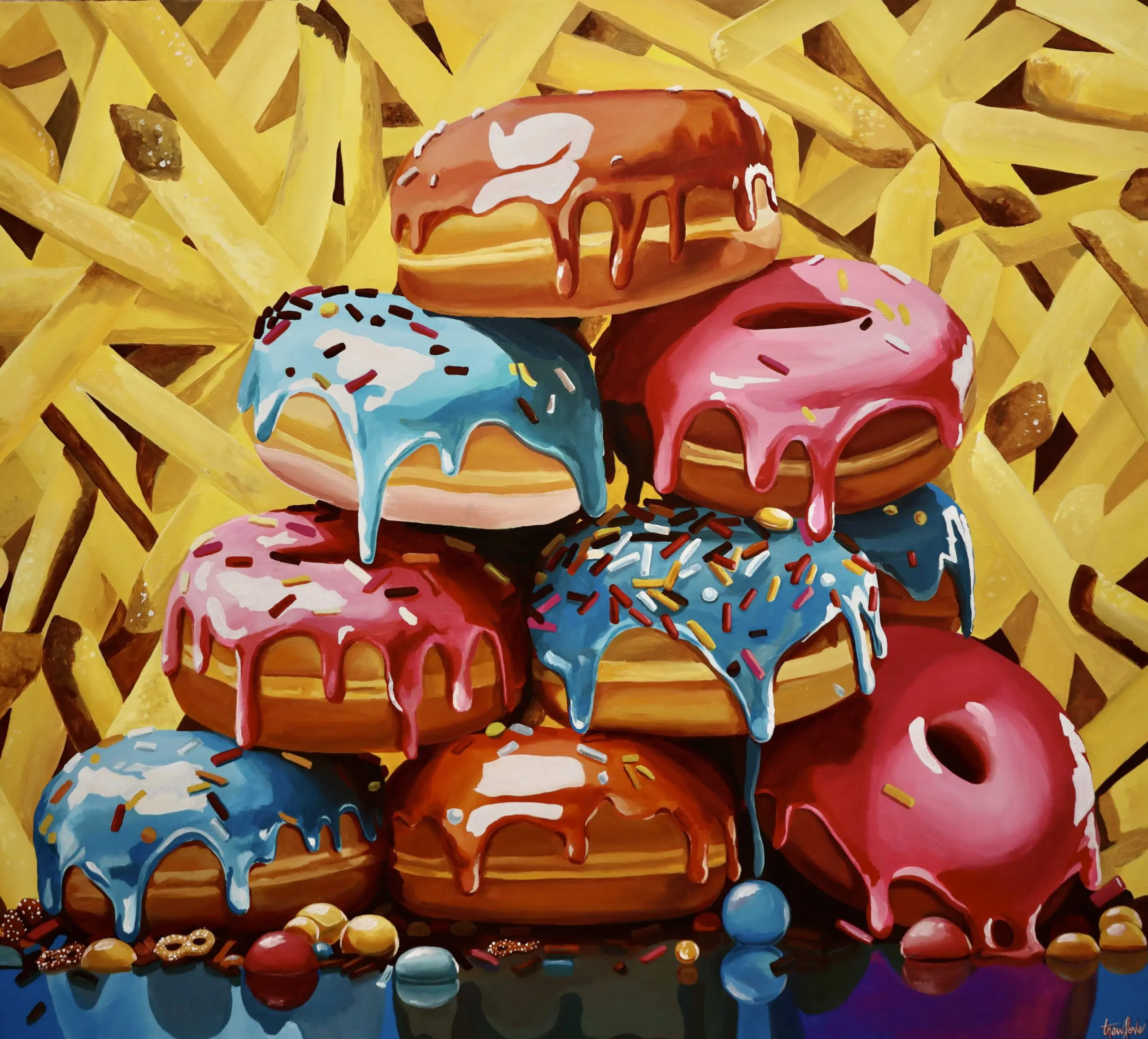 The artist presents a delightful composition featuring a stack of donuts in vibrant and varied colors. The donuts, done in a playful and eye-catching style, are adorned with dripping frosting, adding a touch of whimsy to the piece.