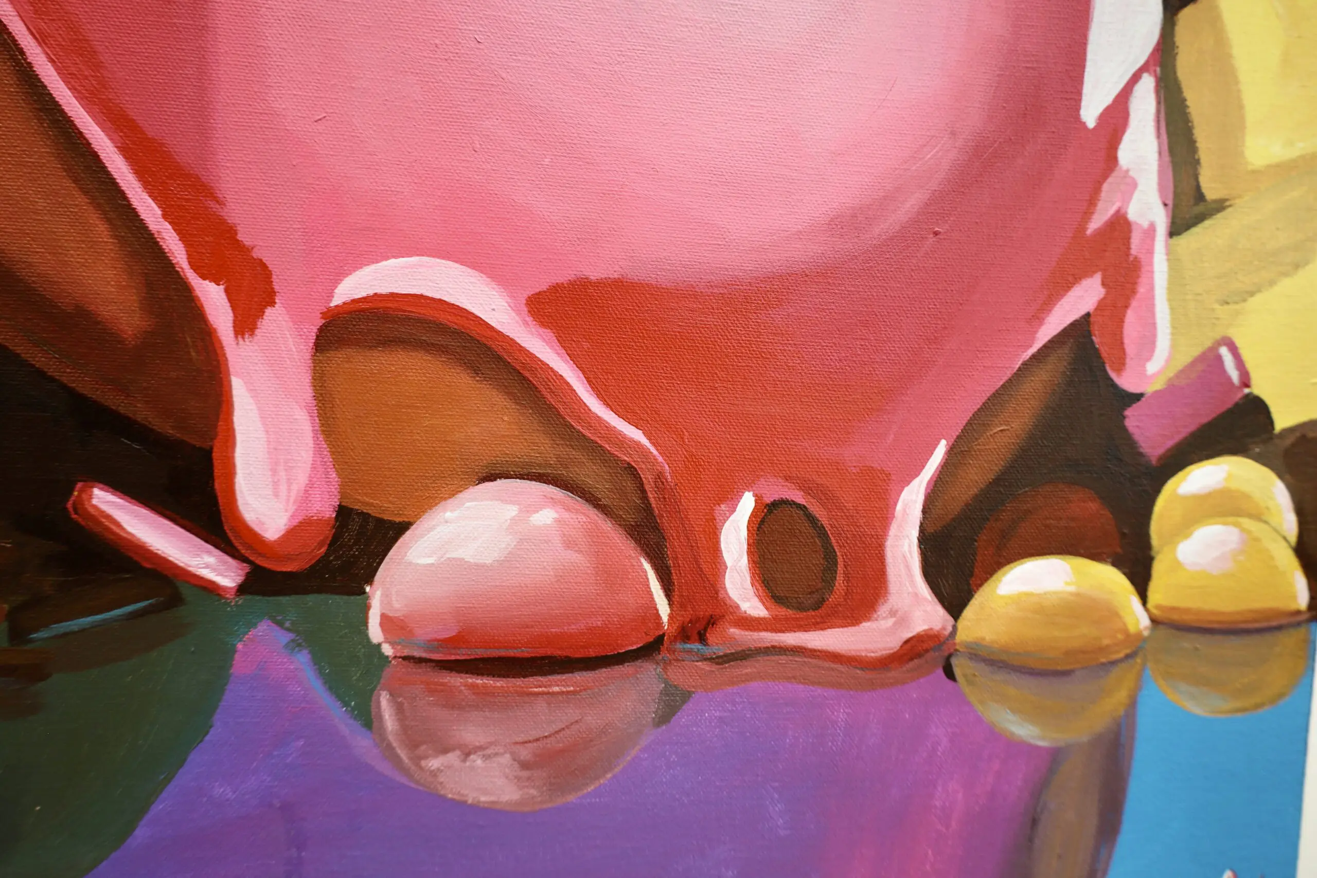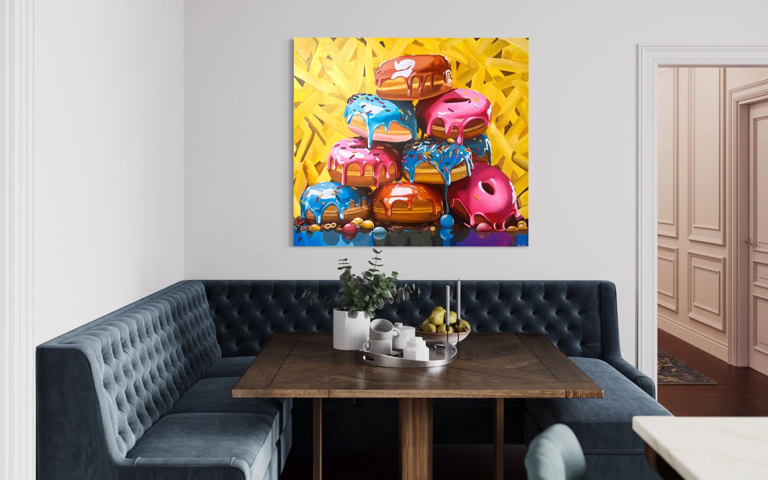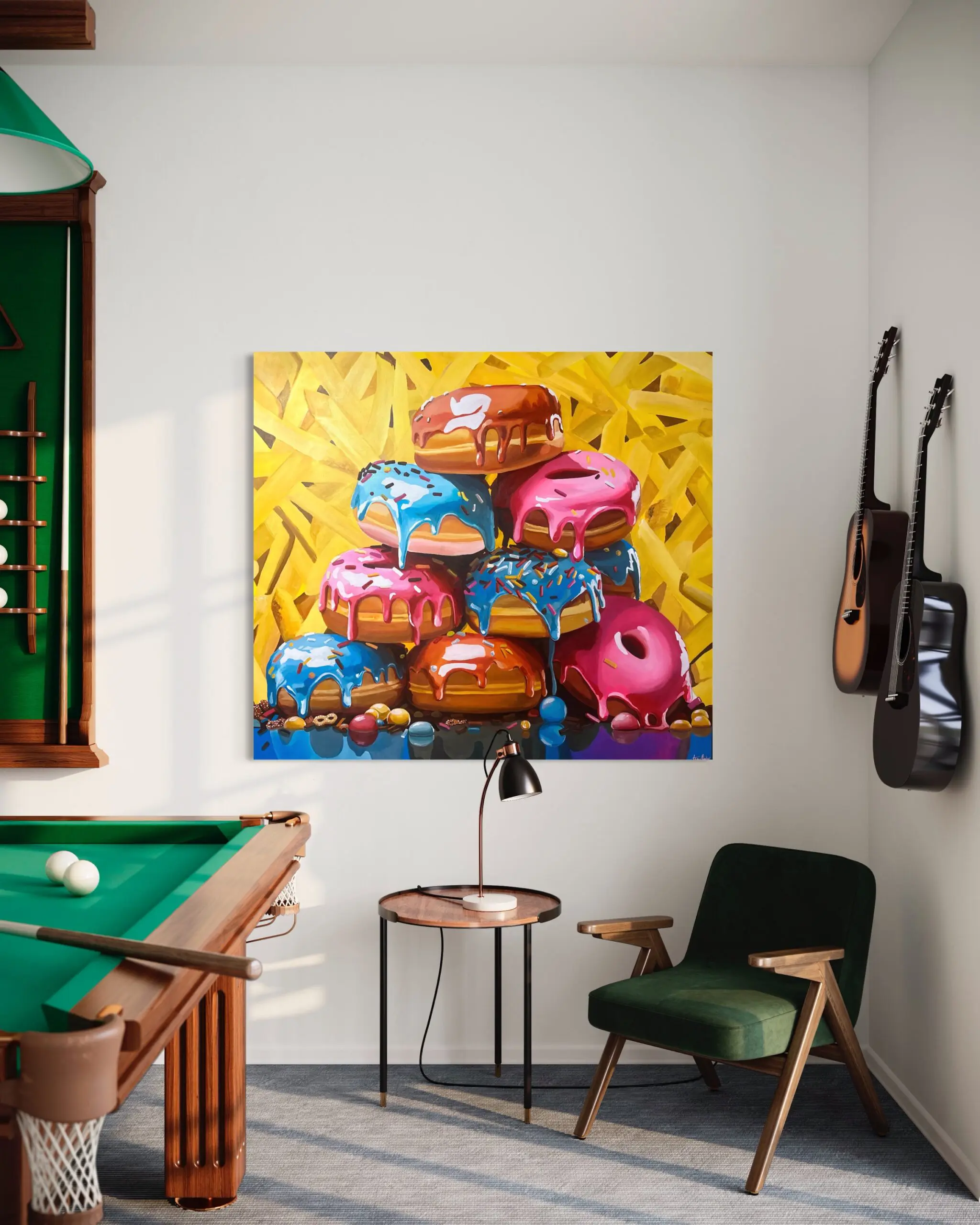 The artist presents a delightful composition featuring a stack of donuts in vibrant and varied colors. The donuts, done in a playful and eye-catching style, are adorned with dripping frosting, adding a touch of whimsy to the piece.