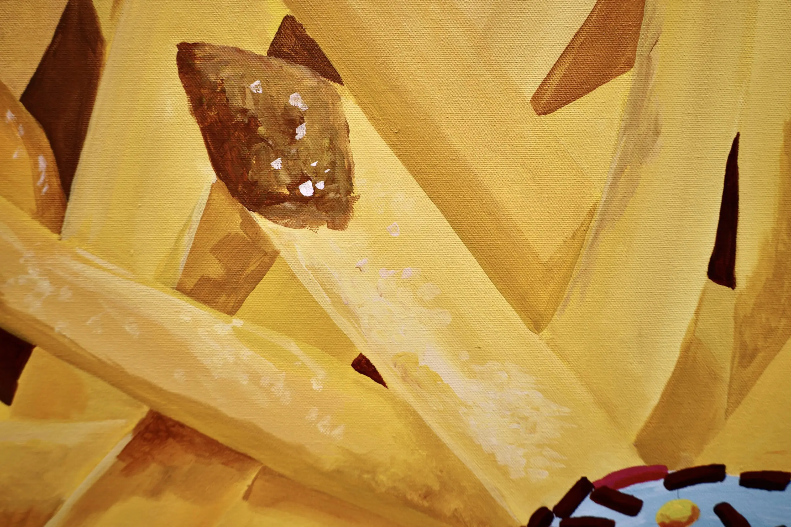 However, what makes the background truly intriguing is the use of French fries, arranged in all different directions. This unexpected element adds a sense of dynamic movement and adds to the overall visual interest of the composition.