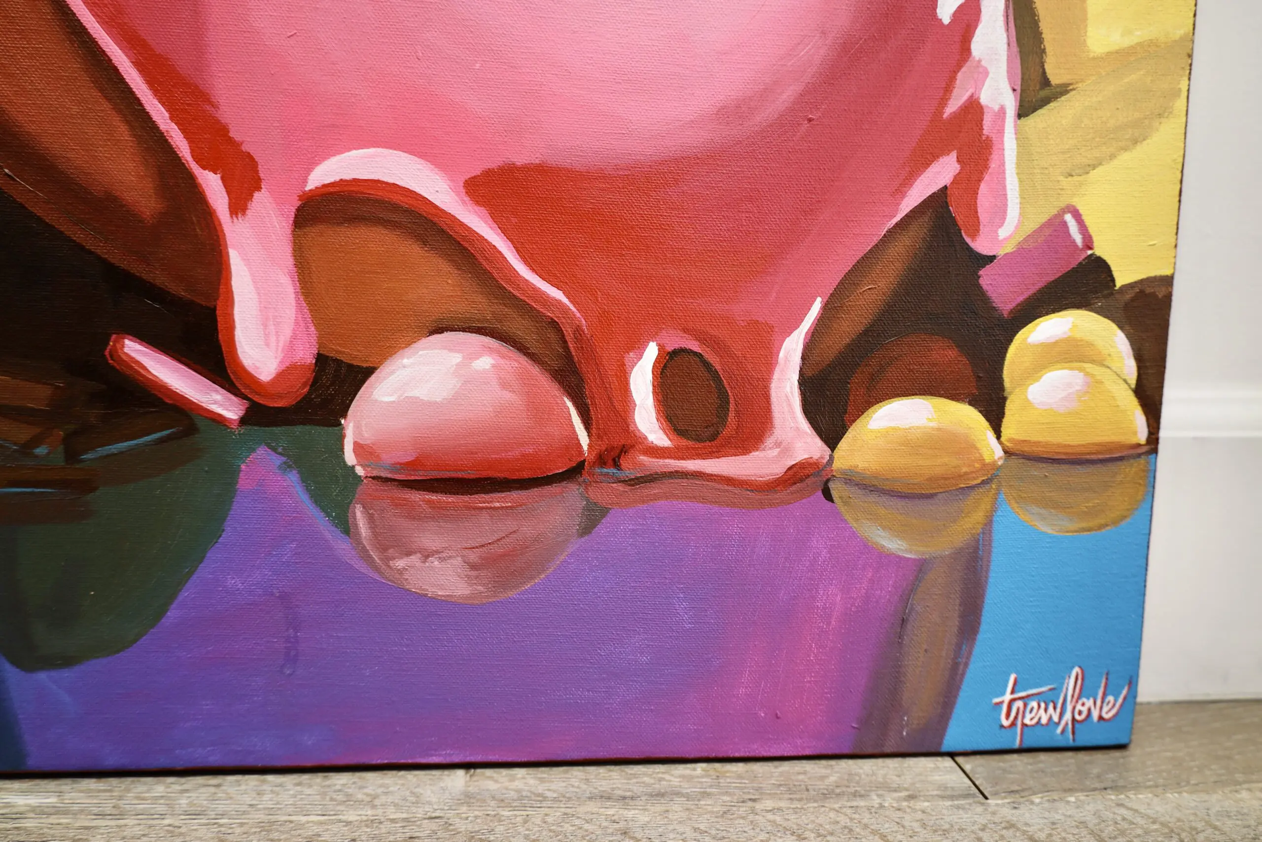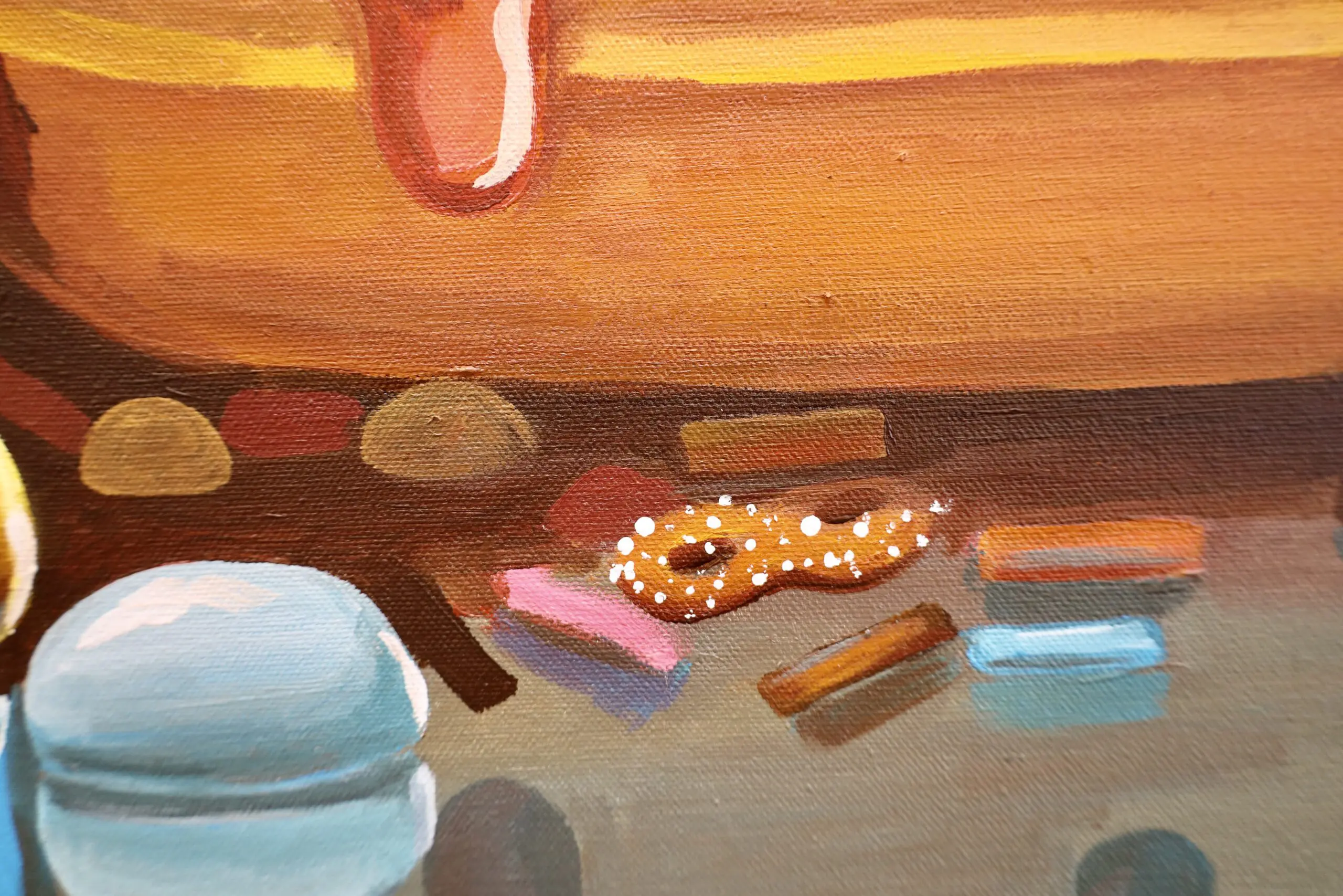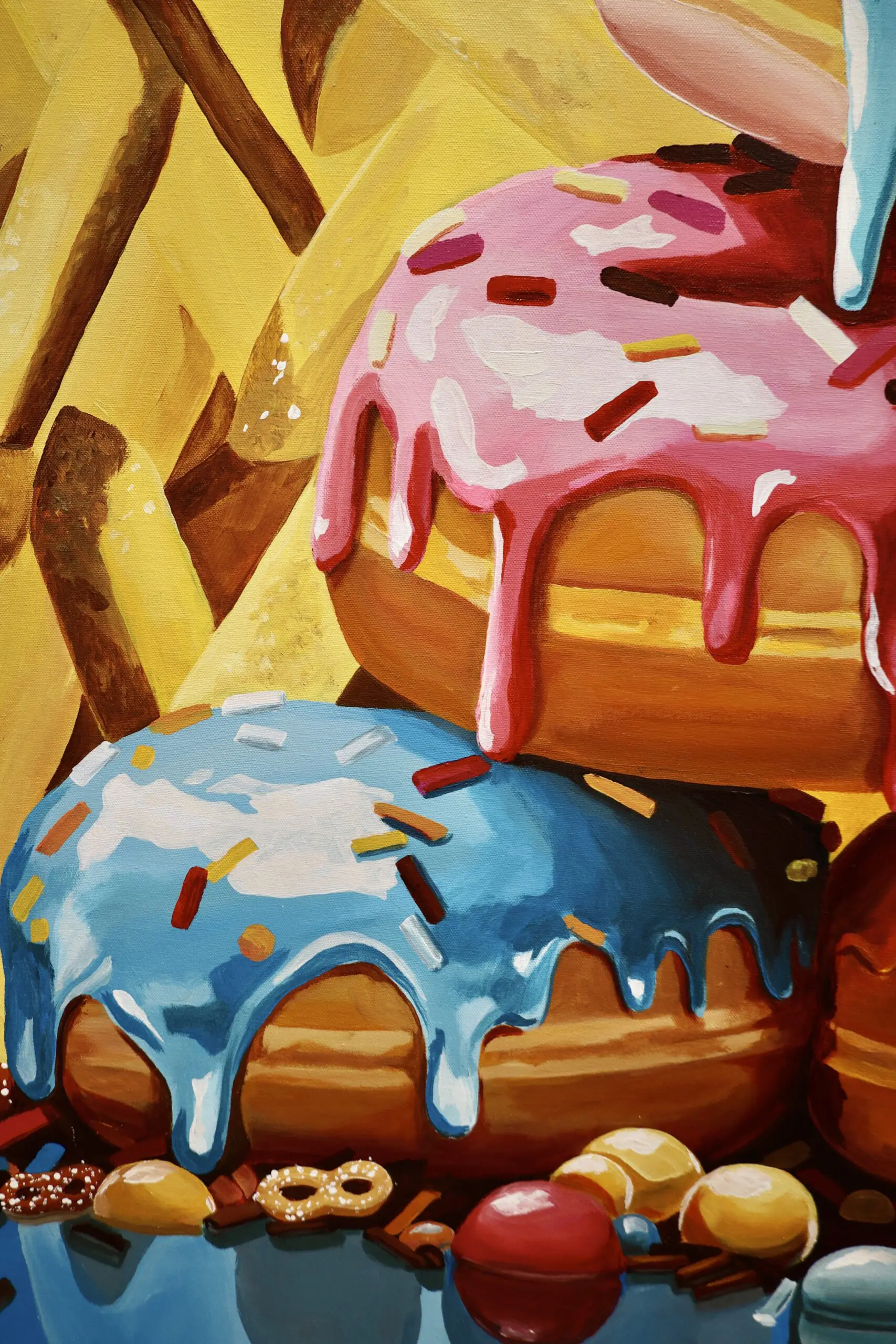 Beyond the delightful and enchanting aesthetics, this painting conveys a deeper message. It explores the idea that many people hunger for love, but often misplace this longing by consuming more and more food. The depiction of the donuts, a symbol of indulgence and satisfaction, serves as a metaphor for the hunger for love and the constant search for fulfillment.